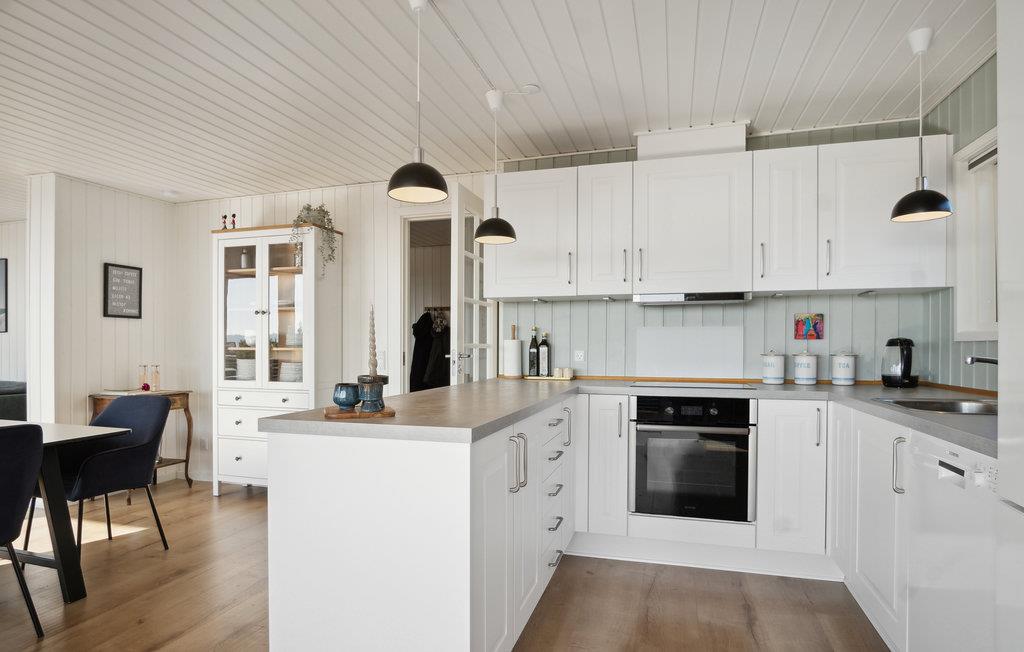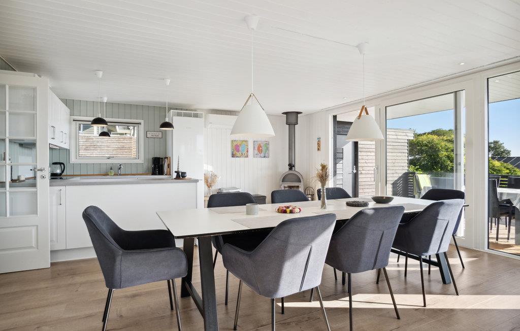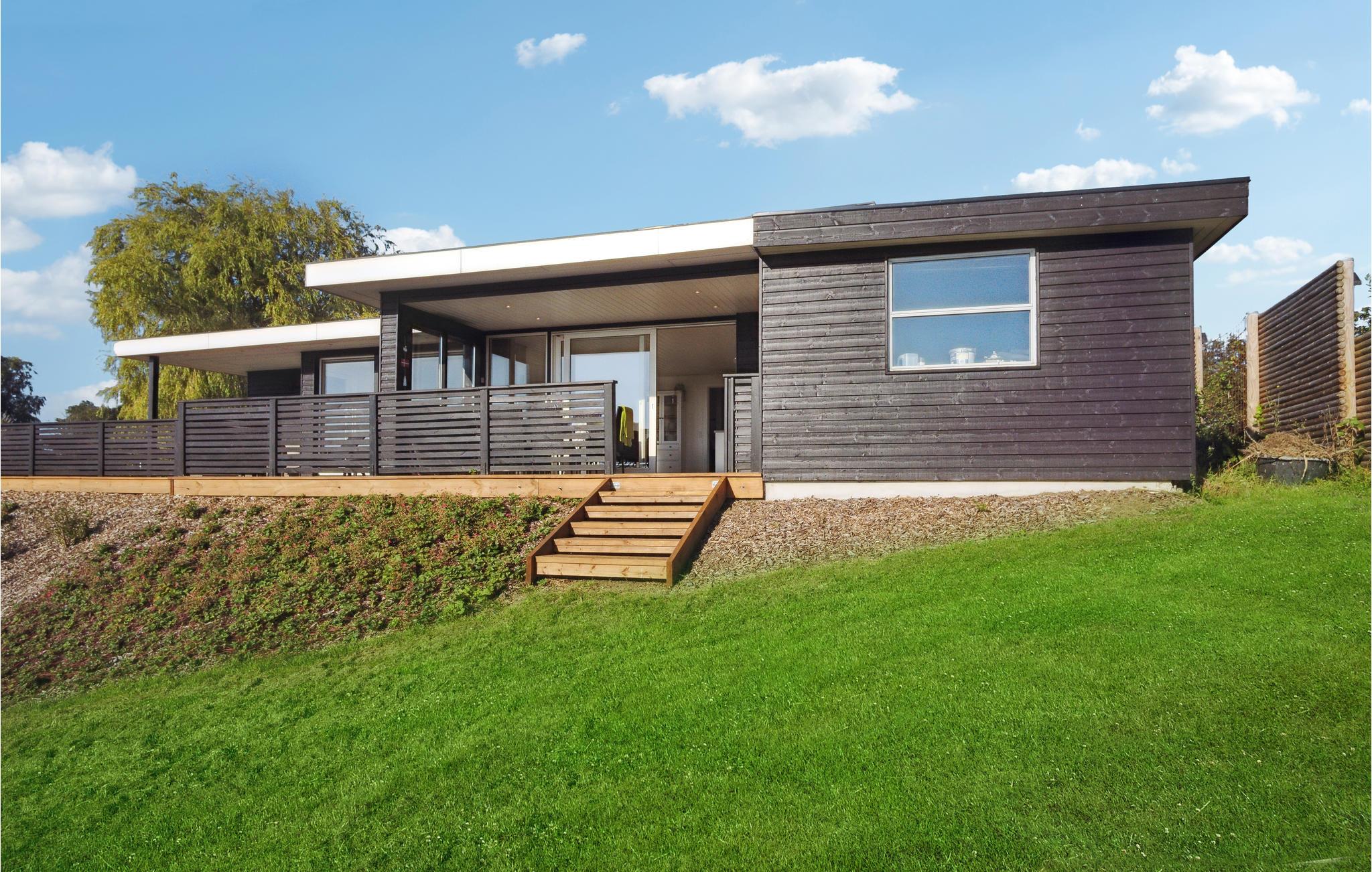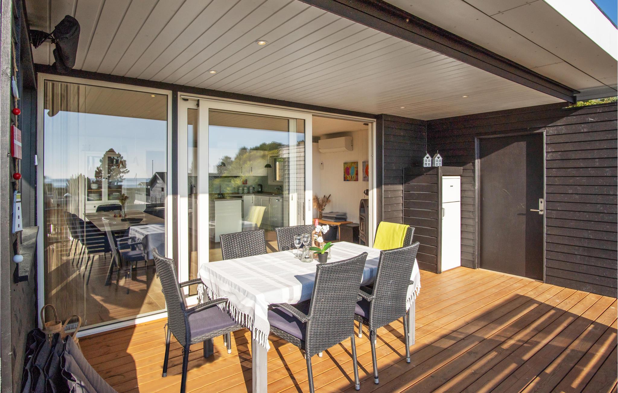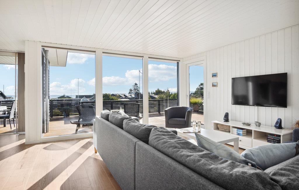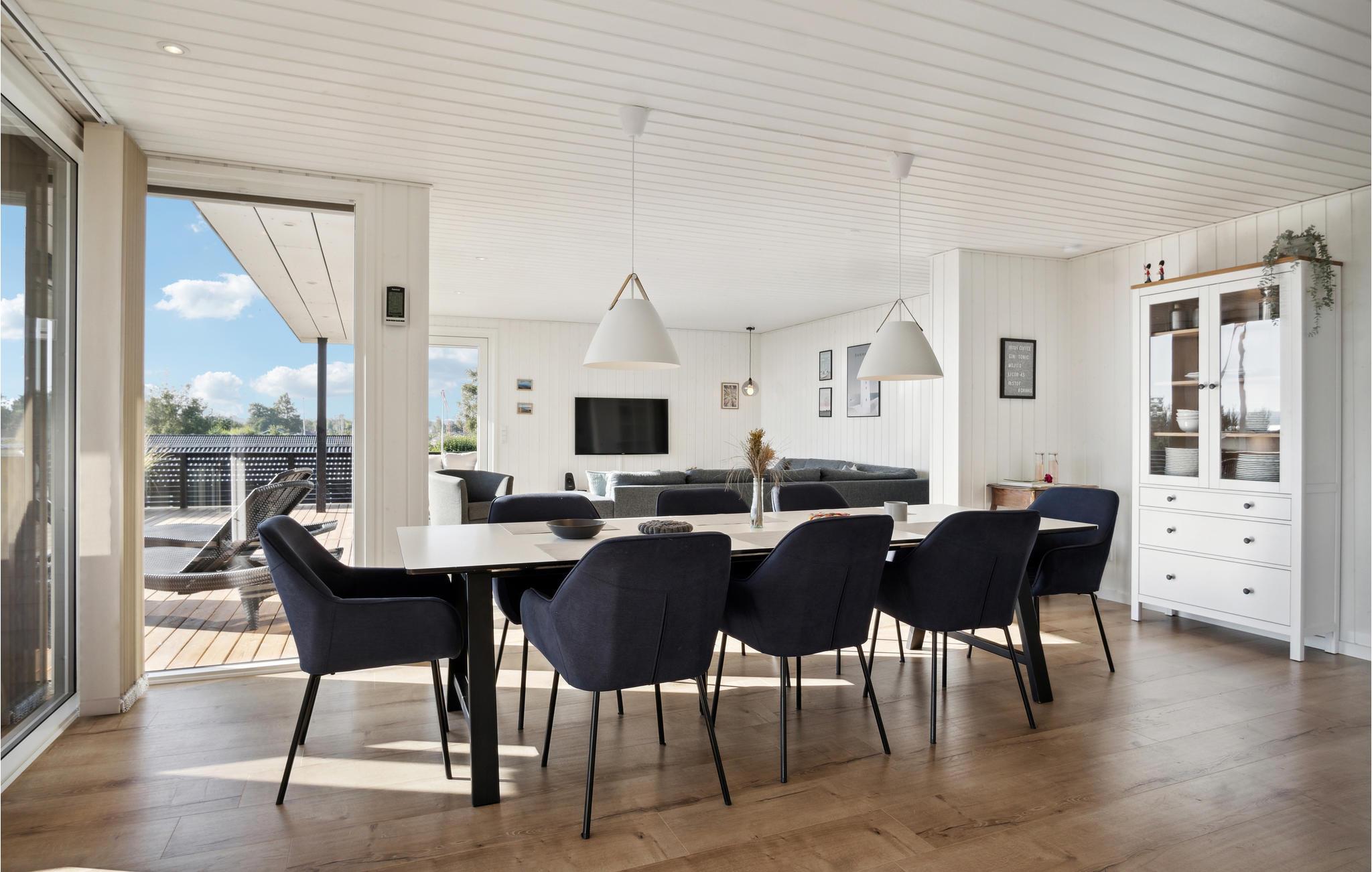 Her kan I slappe af med udsigt over fjorden. Det er sikkert en drøm, der bliver til virkelighed. Der er kun få skridt til stranden, så badeglæde og naturoplevelser kommer I ikke til at gå glip af på jeres ferie. I den stilfulde atmosfære kan hele familien slappe af. De lyse værelser får deres charme fra kontrasten mellem de mørke møbler og det fortryllende dagslys, der kommer ind gennem store panoramavinduer. Hold hyggelige filmaftener og skab en særlig behagelig atmosfære med ild i brændeovnen. Slå jer ned på terrassen og nyd solen og udsigten over vandet. Det perfekte sted for en afstressende tid. Gå en tur til fjorden og nyd en forfriskende dukkert på den børnevenlige strand.