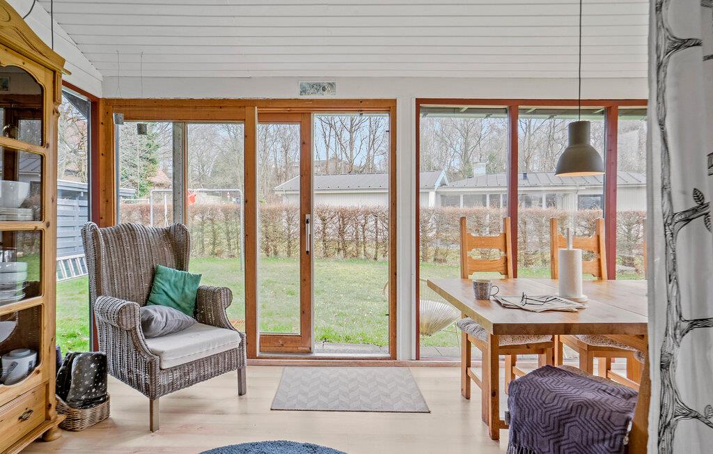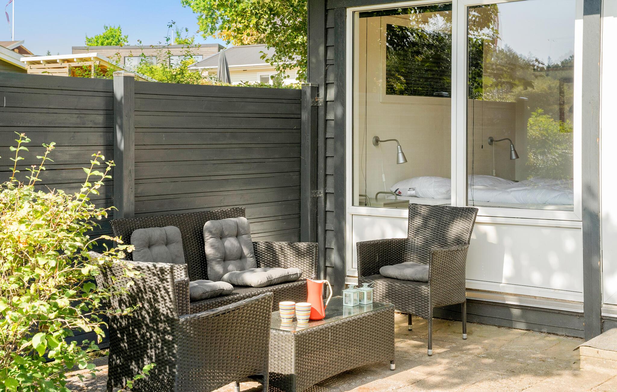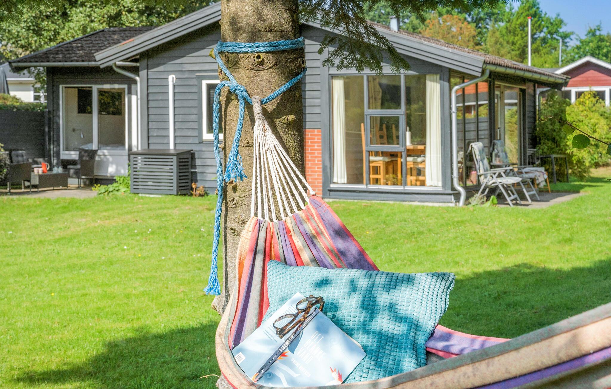 Charmerende træhus nær Hvidbjerg Strand med have, brændeovn og moderne faciliteter til en afslappende ferie.