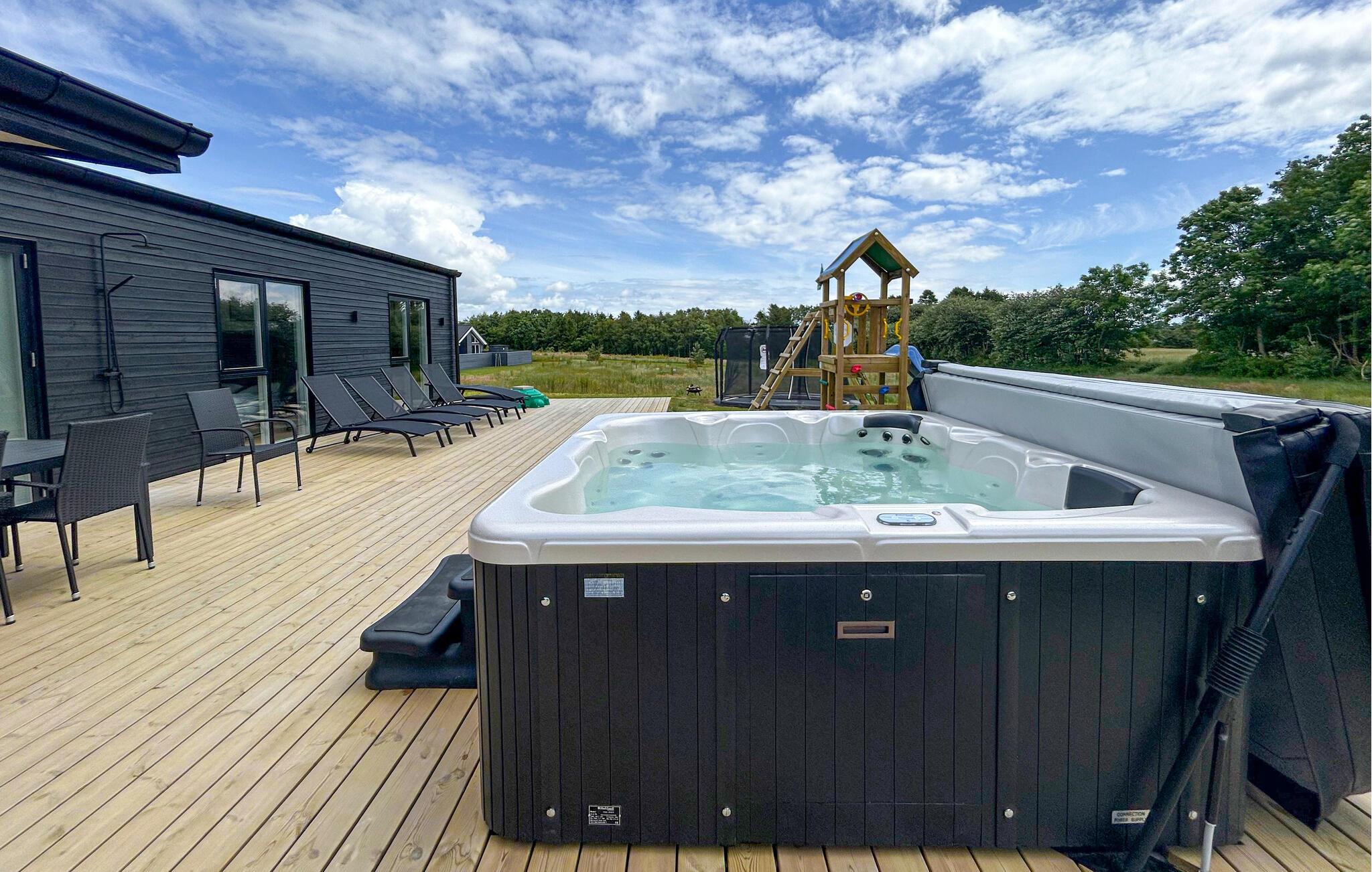 Træd ud af det skønne hus på den store, solrige terrasse med liggestole, hvor I kan tilbringe mange behagelige timer i den friske luft. Et højdepunkt er det store, luksuriøse spabad, hvor I kan se frem til ren afslapning i det varme vand og derefter at sidde i den hyggelige, varme tøndesauna og nyde udsigten. Når aftenen falder på, kan I gå ud i det overdækkede loungeområde og slappe af i møblerne. Terrassen er udstyret med en grill, så hele familien kan nyde en rigtig sommermiddag sammen.