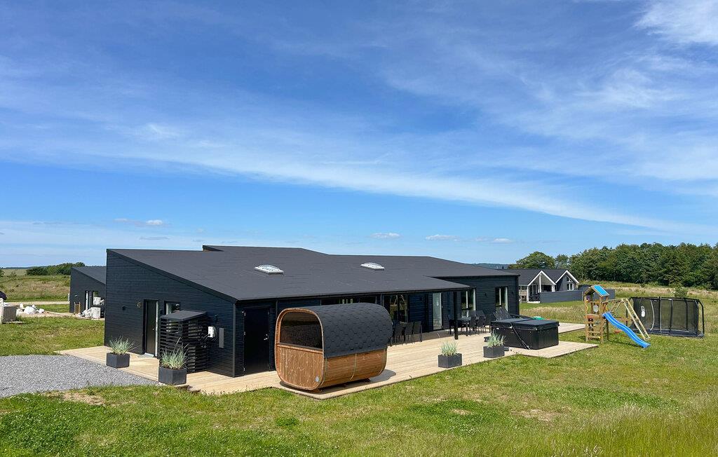 Luksusferiehus i skandinavisk stil med wellness, aktivitetsrum og stor terrasse tæt på Mørkholt Strand.