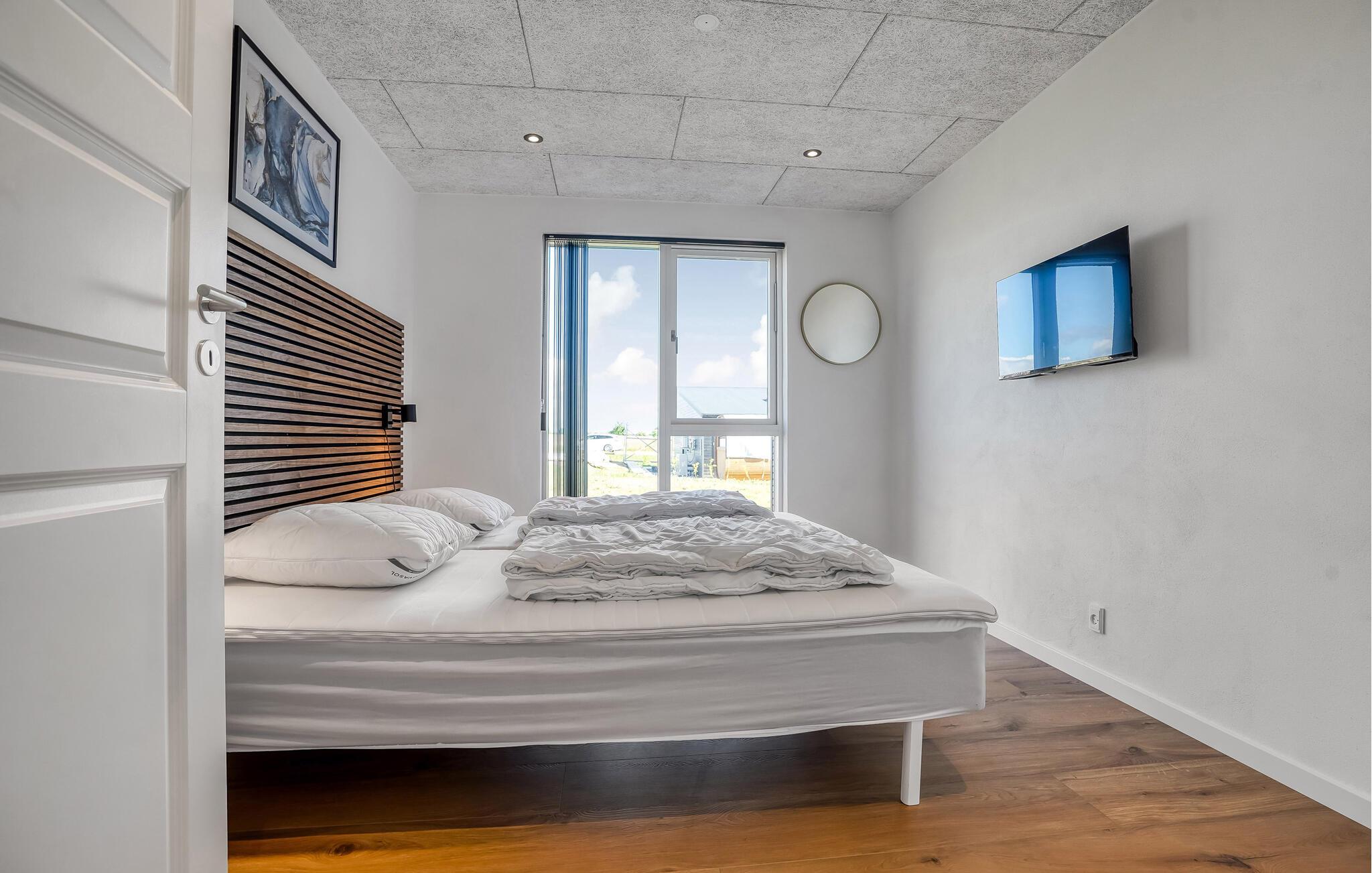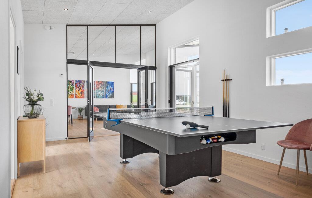 Velkommen til Mørkholt Strand og dette moderne, rummelige kvalitetsferiehus i skandinavisk stil. Huset er et paradis for flere familier og giver mulighed for både fælles aktiviteter og privatliv takket være de mange veludstyrede værelser. De store vinduer lukker masser af naturligt lys ind i den store stue i åben forbindelse til køkkenet, der er veludstyret, og hvor I blandt andet kan give vinen den rigtige temperatur i vinkøleskabet. Her kan I holde hyggelige filmaftener med familie eller venner og streame jeres yndlingsfilm eller nyde et lækkert måltid i godt selskab. I finder også underholdning i aktivitetsrummet med billard og bordtennis, som giver jer mange muligheder for aktiviteter i løbet af jeres ferie.