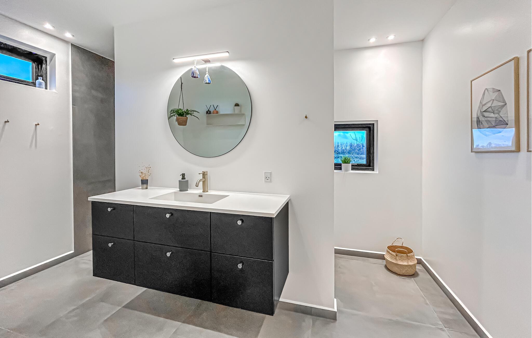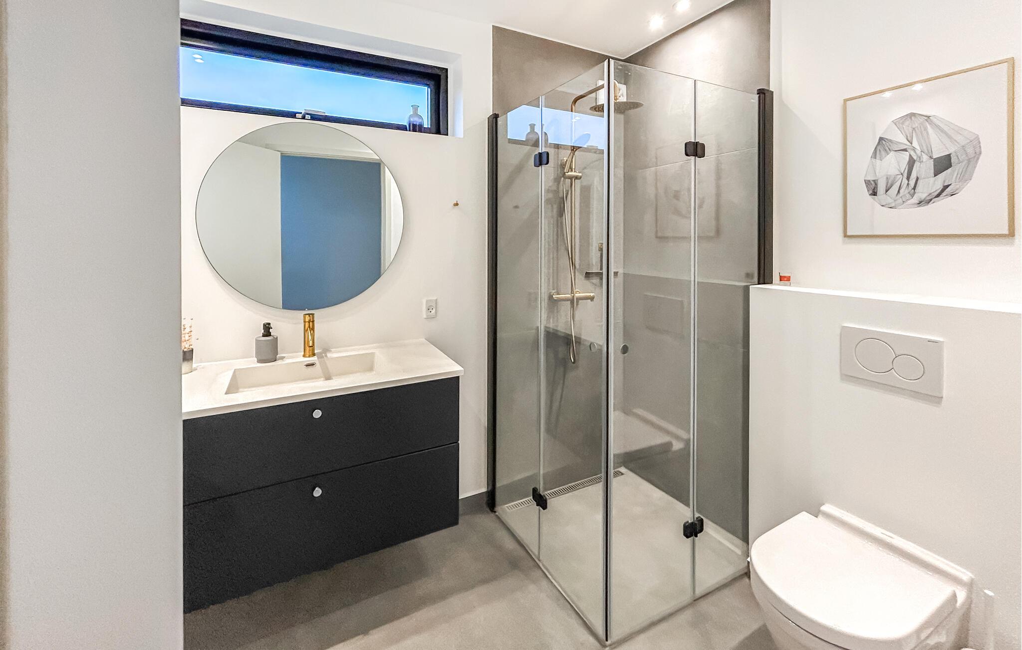 Nyd moderne komfort og havudsigt i dette stilfulde feriehus med sauna og spabad.