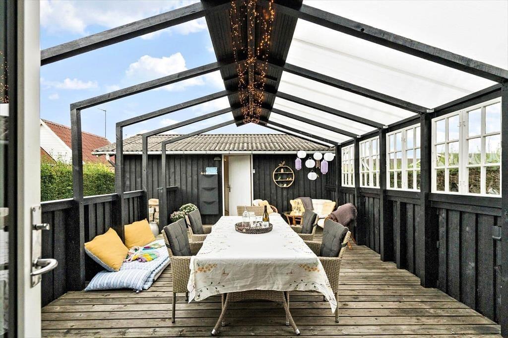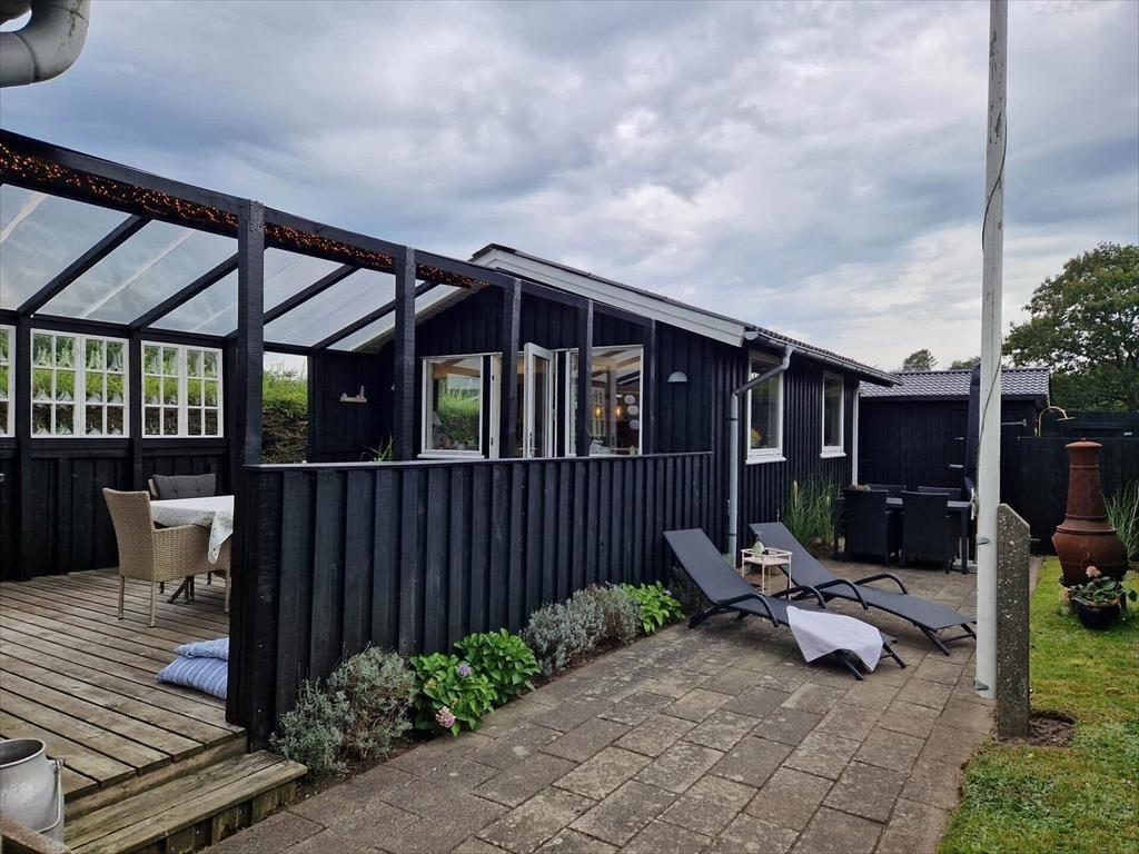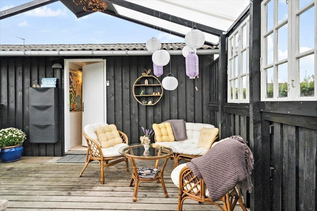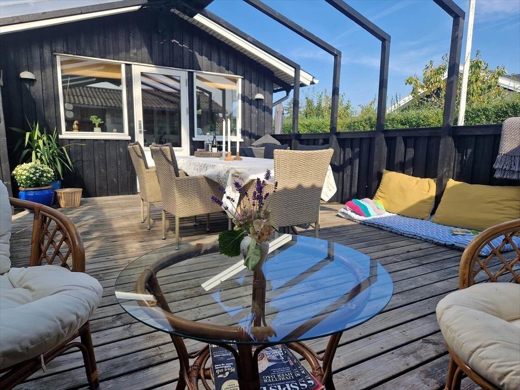 Gå en tur til stranden der kun ligger 130 meter fra huset. Efter du har dyppet tæerne i vandet, kan du skylle dig under den udendørs bruser i haven (1/5-1/10). Der er en rigtig dejlig terrasse, der helt naturligt bliver en forlængelse af stuen. Her kan man sidde i læ for vind og vejr under den delvist overdækkede terrasse. Der er udstyret med både grill og havemøbler. Et oplagt sted for feriens samlingspunkt til både morgenkaffe og grill-hygge om aftenen. Har du elbil er der etableret fælles ladeplads kun 100 meter fra huset.