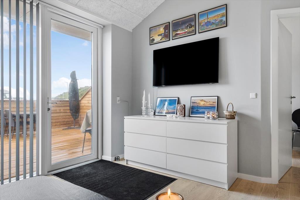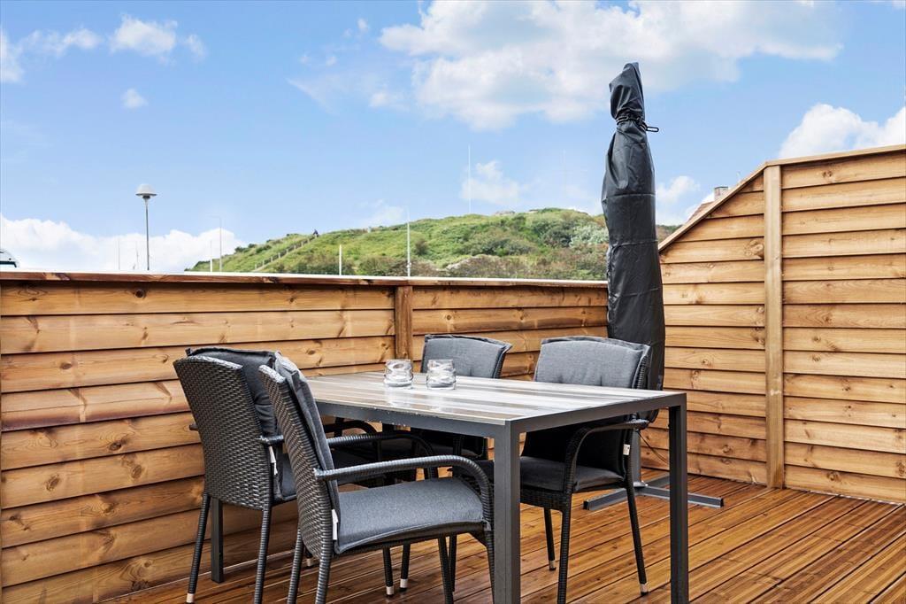 Fra terrassen kan I se lige hen på den høje klit Troldbjerg med de gamle bunkere på toppen – og det er en god påmindelse om, hvor centralt i Hvide Sande, ferielejligheden ligger. I kan gå op på klitten, hvis I vil nyde udsigten over havnemiljøet, havet og Ringkøbing Fjord, og derudover har I bare 100 meter hen til slusen, hvis I vil skue ud over vandet og prøve lykken med en fiskestang og lidt madding. Fra ferieboligen er der mulighed for at gå eller cykle til Vesterhavet, og hvis I krydser slusen, har I nem adgang til den hyggelige bymidte, hvor I finder et godt udvalg af spisesteder og butikker.