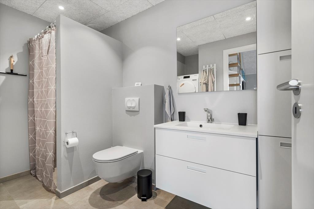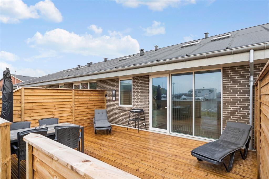 Fra stuen har I direkte forbindelse til en sydvendt terrasse, der er helt lukket og godt afskærmet ind mod naboerne. Der er to liggestole og et havebord til fire personer, og hvis I får lyst til et lækkert udendørs måltid om aftenen, står der en elektrisk grill til fri afbenyttelse.
