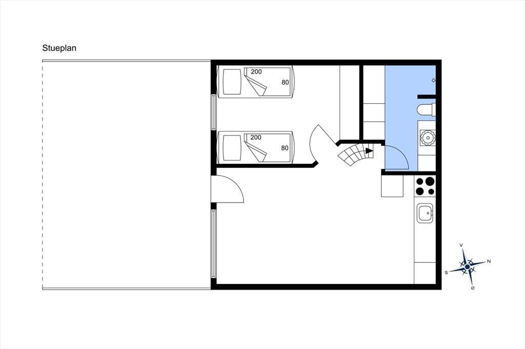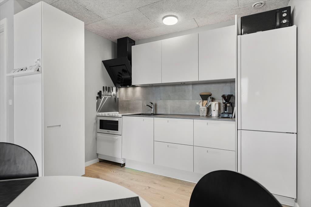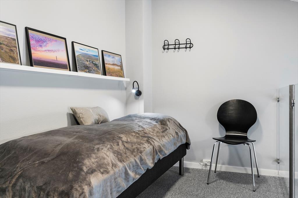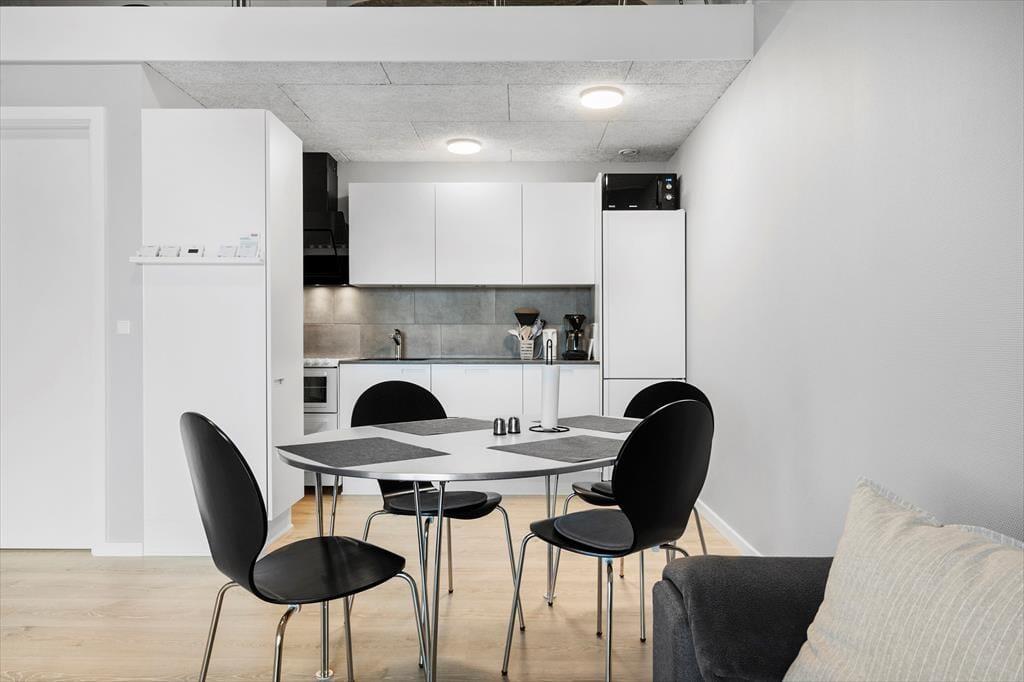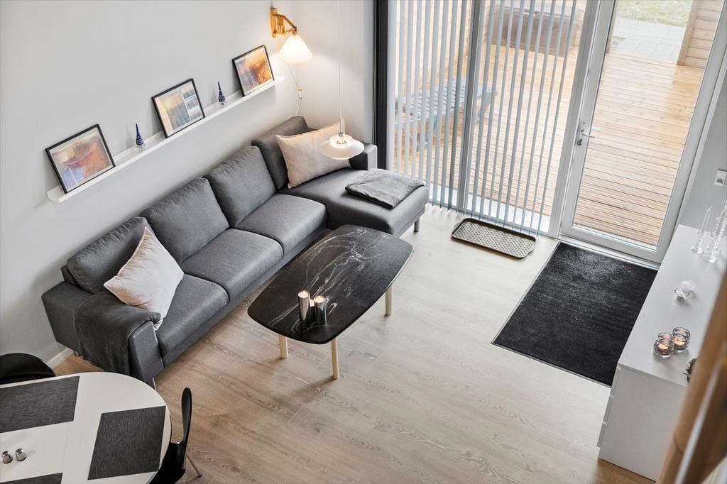 Lejlighedens 47 m2 er fornuftigt fordelt på et soveværelse, et badeværelse og en stue med integreret køkken. Fra stuen fører en trappe op til en rummelig hems på yderligere 12 m2, så indretningen passer med andre ord fint til fire personer. Stuen er et skønt opholdsrum med moderne interiør, pæne trægulve, fjernstyrede ovenlysvinduer og en flot loftshøjde, der bidrager til den lette og luftige atmosfære. I køkkenet er pladsen godt udnyttet med kombineret komfur og opvaskemaskine, så I kan lave god mad, men også hurtigt klare afrydningen efterfølgende. Det skulle gerne give jer god tid til at slappe af i sofaen, hvor I for eksempel kan benytte jer af den hurtige wi-fi-forbindelse eller se dansk, tysk, norsk og svensk tv på den store fladskærm.