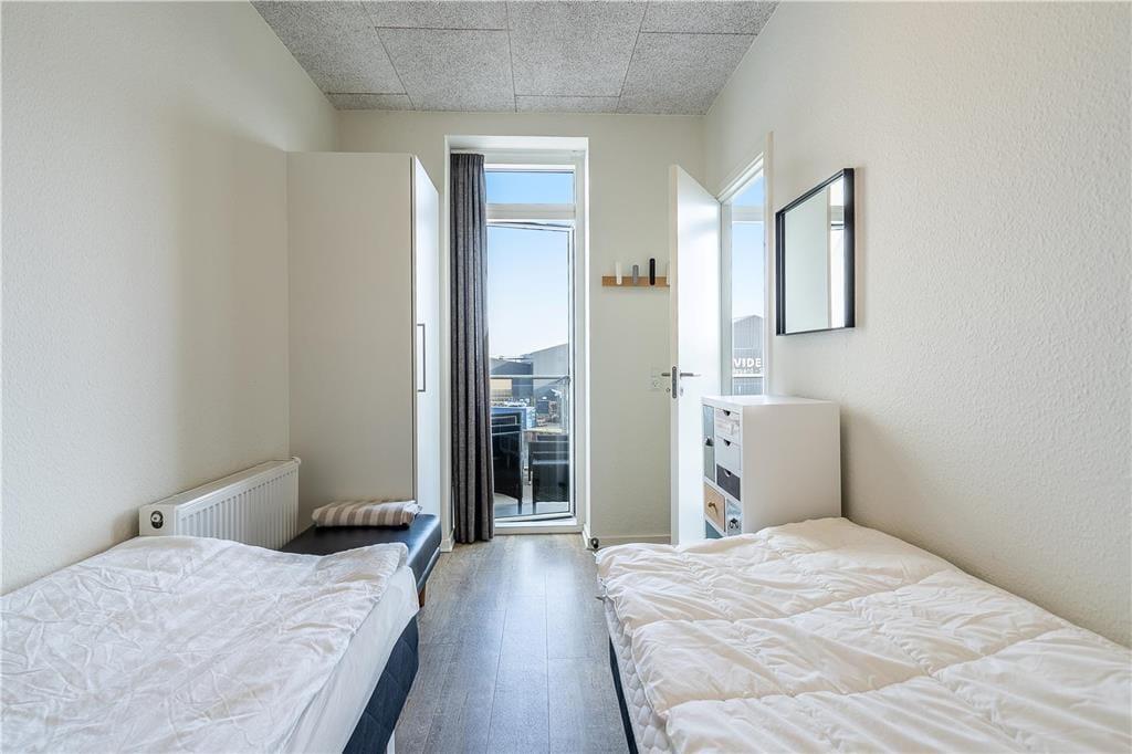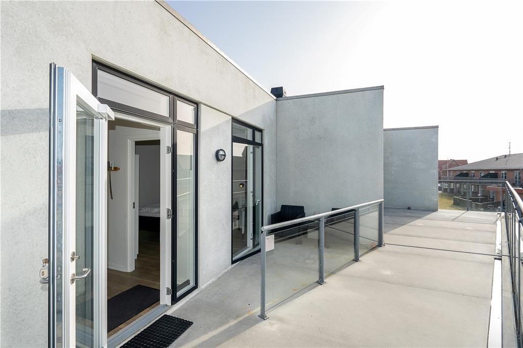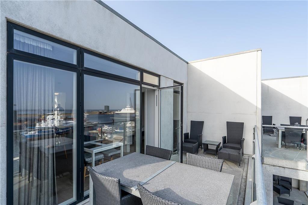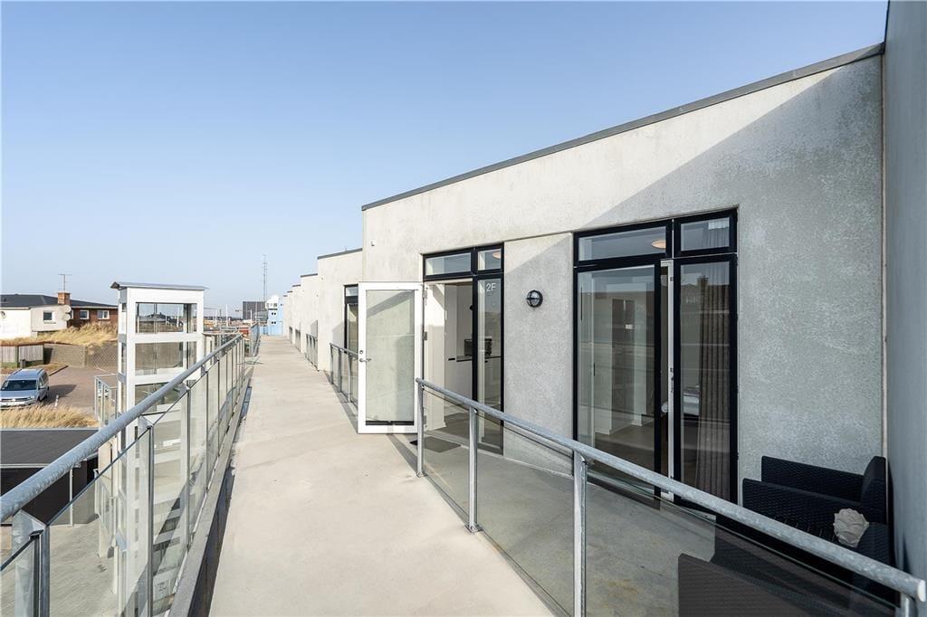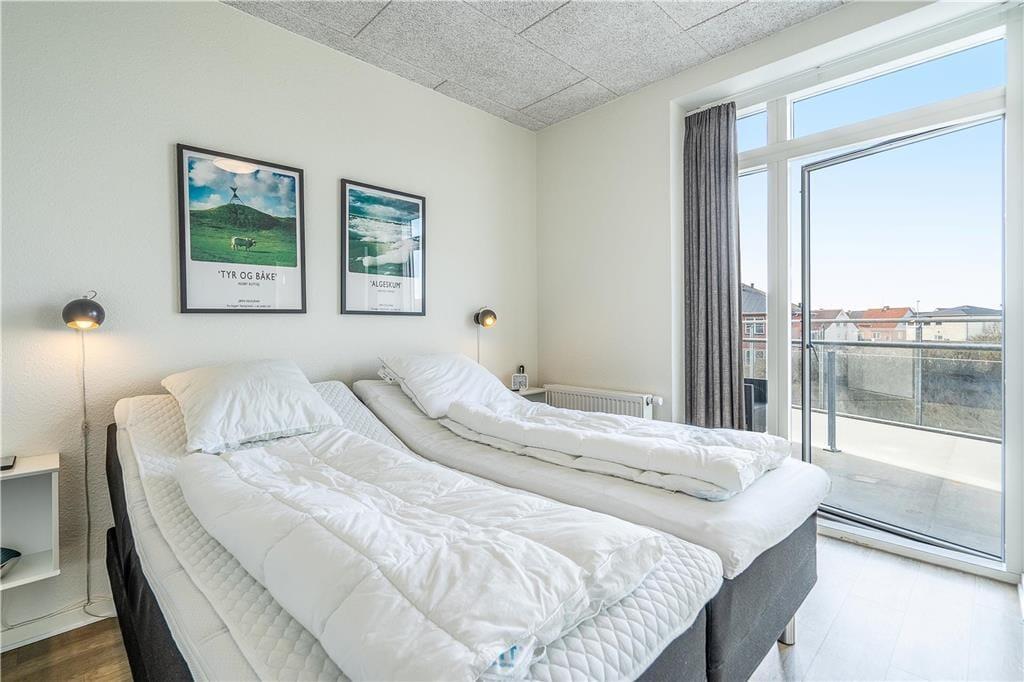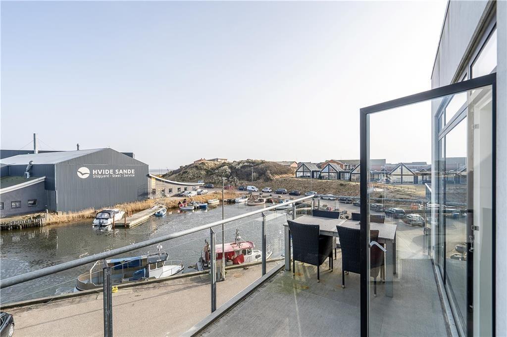Når det er ferie, er det skønt at sove længe – men her i lejligheden kan det nu også anbefales at stå tidligt op for at se den smukke solopgang over fjorden. Det spektakulære syn kan opleves fra lejlighedens store altan, og senere på dagen er det også herligt at sidde her med overblik over havnen, hvor små både ligger til kaj efter fisketuren. Mod vest har I et lille terrasseområde, hvor I kan nyde solen senere på dagen, og ellers kan I tage elevatoren ned for at begive jer ud i Hvide Sandes hyggelige gader.