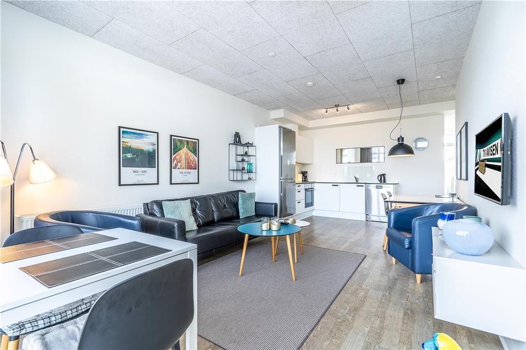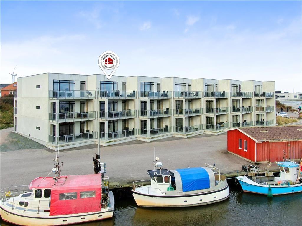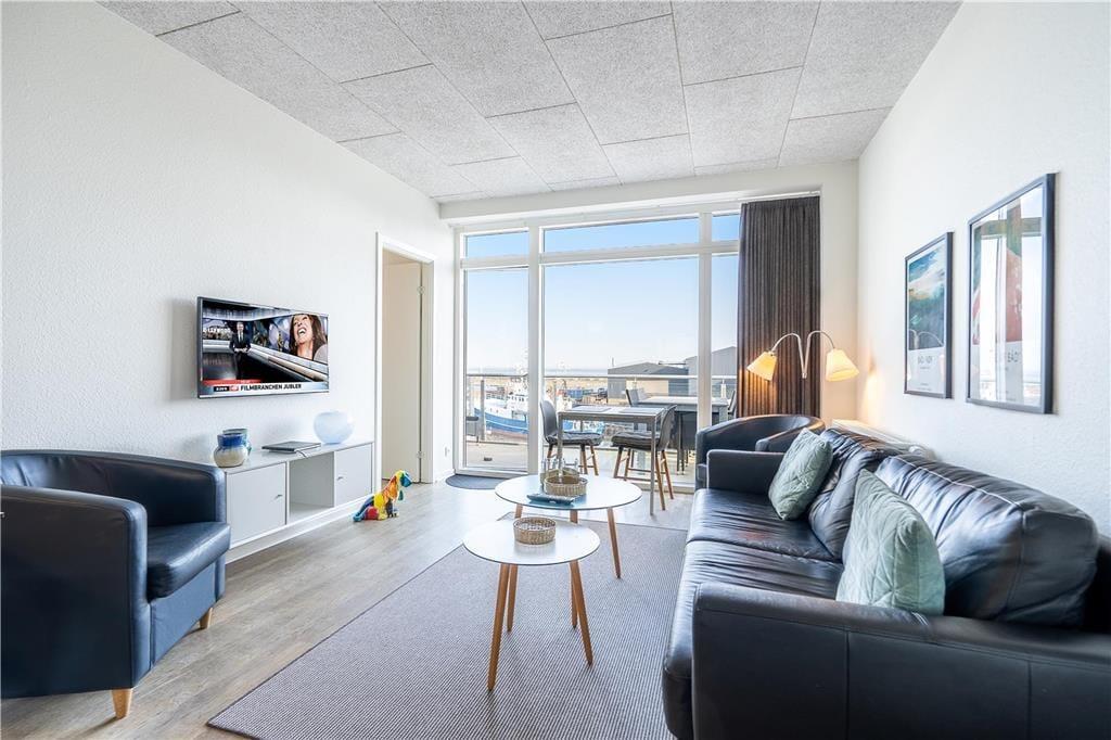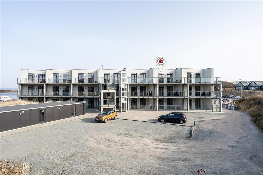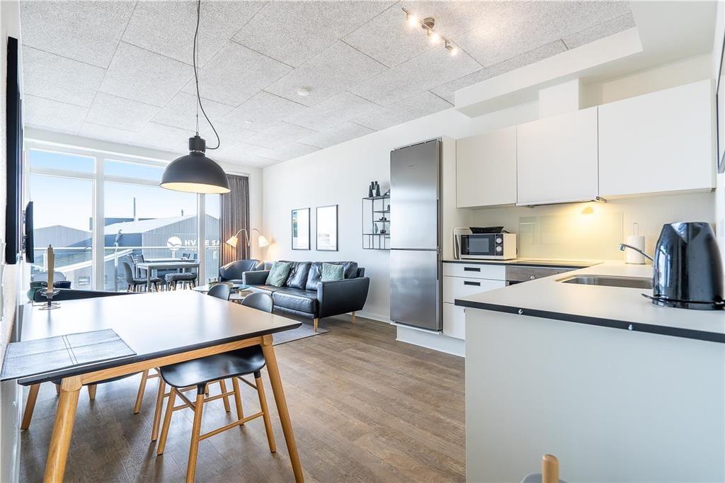 Denne flotte og komfortable ferielejlighed har en glimrende indretning med to soveværelser, et badeværelse og en dejlig stue med integreret køkken. Skønne udearealer er her også, og især den østvendte altan imponerer med sin fantastiske panoramaudsigt over Ringkøbing Fjord og Hvide Sandes havnemiljø.