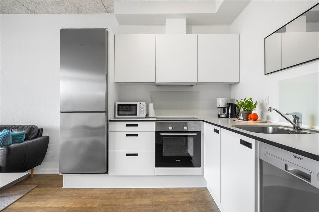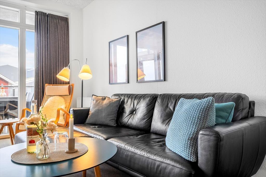 Kvadratmeterne er godt udnyttet inden døre i lejligheden, som mere præcist er en lys og stilfuld stuelejlighed på 67 m2. Planløsningen passer godt til fire personer, for der er to gode soveværelser, et flot brusebadeværelse og en dejlig stue med integreret køkken at gøre godt med. Trænger I til lidt underholdning, når I slapper af i stuens sofa, byder ferieboligen på en god wi-fi-forbindelse og fladskærm med kabel-tv og Chromecast – men I kan nu også bare lade tankerne vandre, mens I kigger ud på vandet og de stemningsfulde havneomgivelser. Det åbne køkken er udstyret med opvaskemaskine og andre gode hvidevarer, der letter madlavningen og den efterfølgende oprydning, og på badeværelset giver vaskesøjlen jer mulighed for at vaske tøj undervejs på ferien.