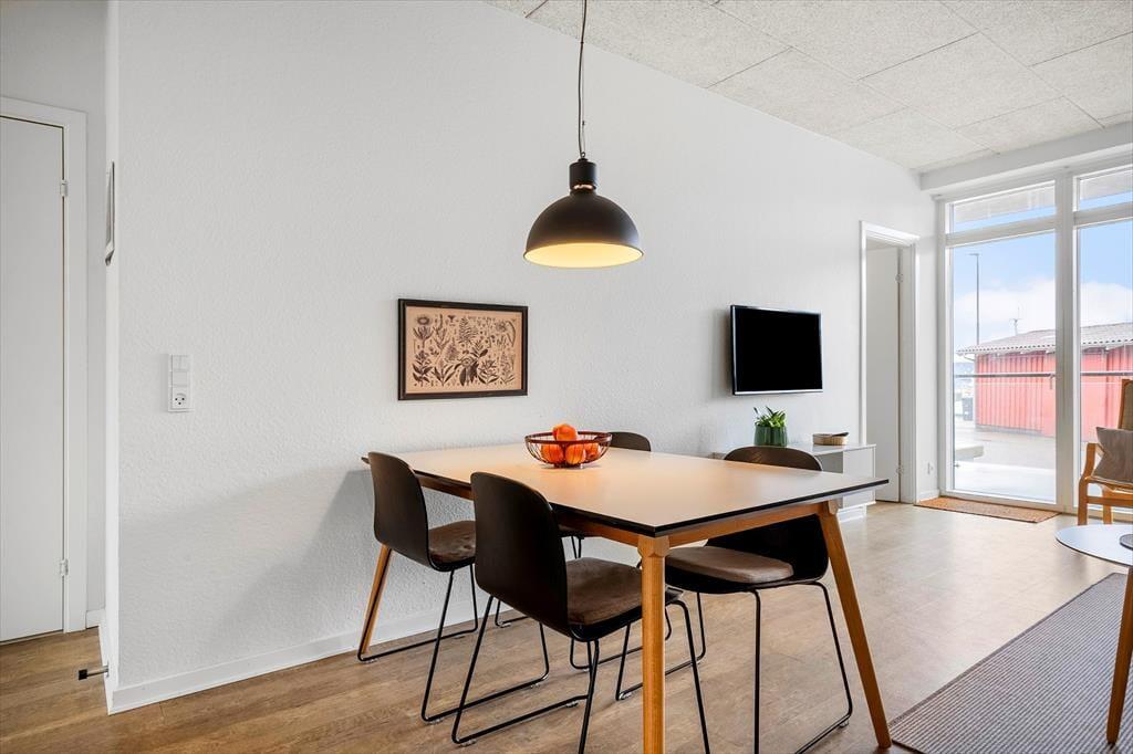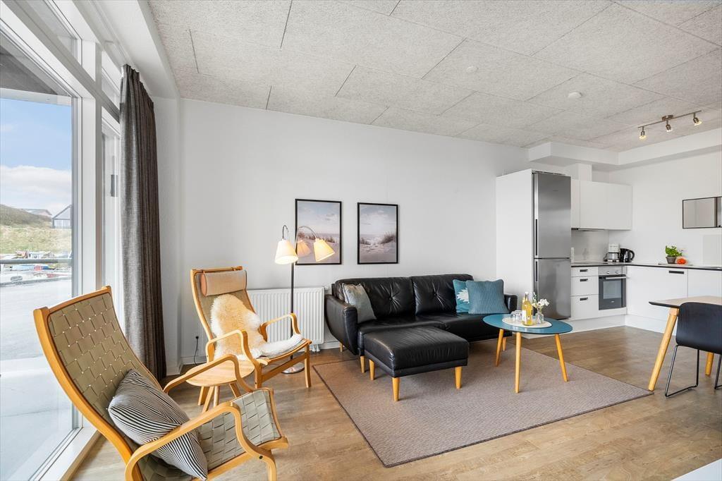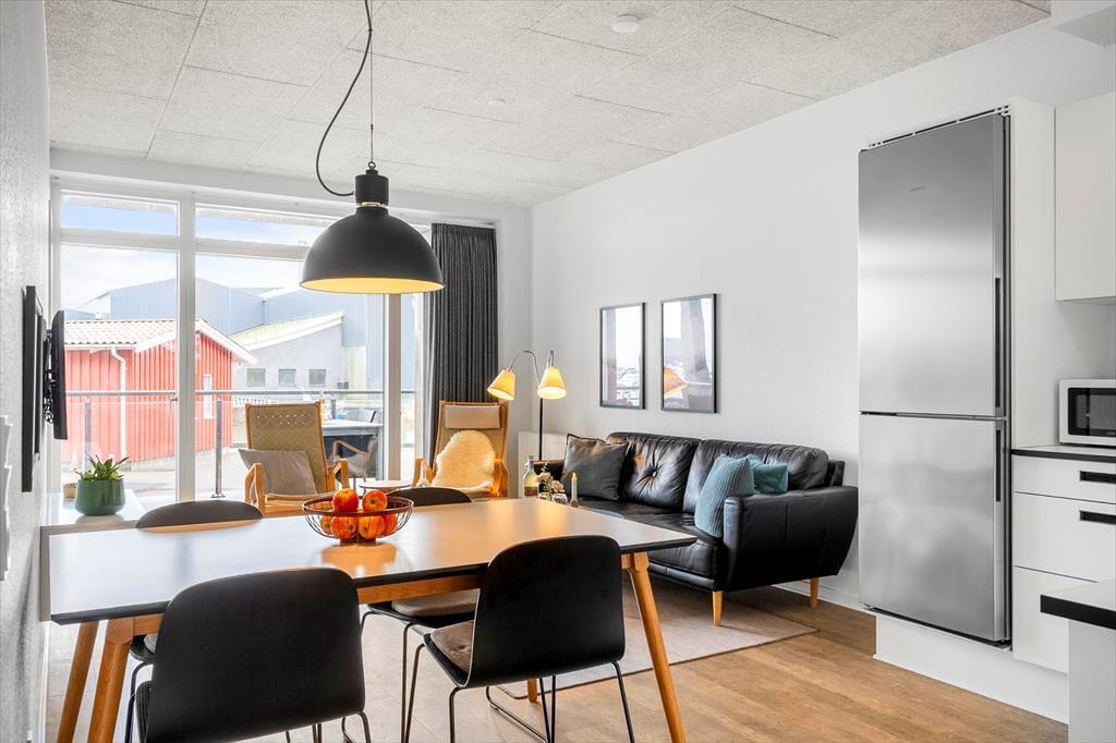 Hvide Sandes fjordvendte havn venter lige uden for ejendommen, så I får et unikt indblik i byens spændende og autentiske fiskermiljø. Der er et godt udvalg af spisesteder lige i nærheden, og hvis I selv vil hygge jer med at lave mad, kan I købe frisk fisk hos fiskehandleren og finde andre lækkerier i bymidtens specialbutikker. Vesterhavet og Hvide Sande Sydstrand kan I gå til på ti minutter, og I har nem adgang til både Westwind Syd og Nord, hvis I vil have surfundervisning eller leje udstyr.