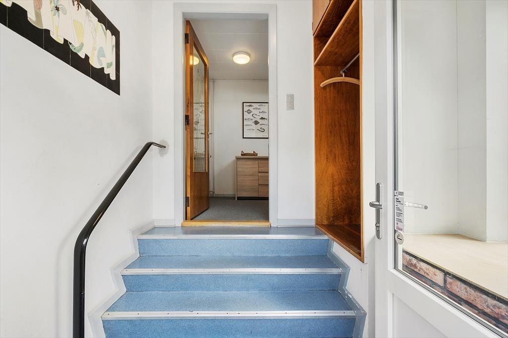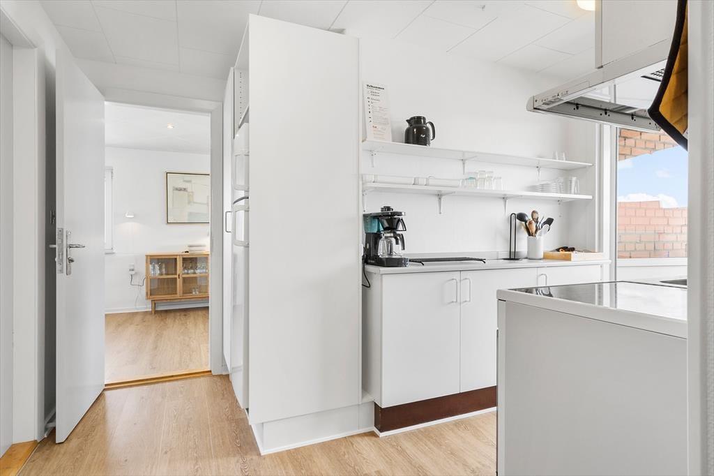 Både fra det ene soveværelse og fra køkkenet har du direkte adgang til lejlighedens østvendte altan – så lige fra morgenstunden kan du nemt smutte ud for at trække frisk luft eller tage dagens første kop kaffe med ud i det fri. Altanen er overdækket, og der er delvis afskærmning, så det er et rart sted at sidde, hvis du vil lade tankerne flyve og nyde udsigten til by, fjord og himmel. Bemærk venligst, at det ikke er muligt at parkere lige ved hoveddøren, for pladsen er reserveret til apoteket. Til gengæld er der gode parkeringsmuligheder på p-pladsen mellem Søndergade 1 og 3.