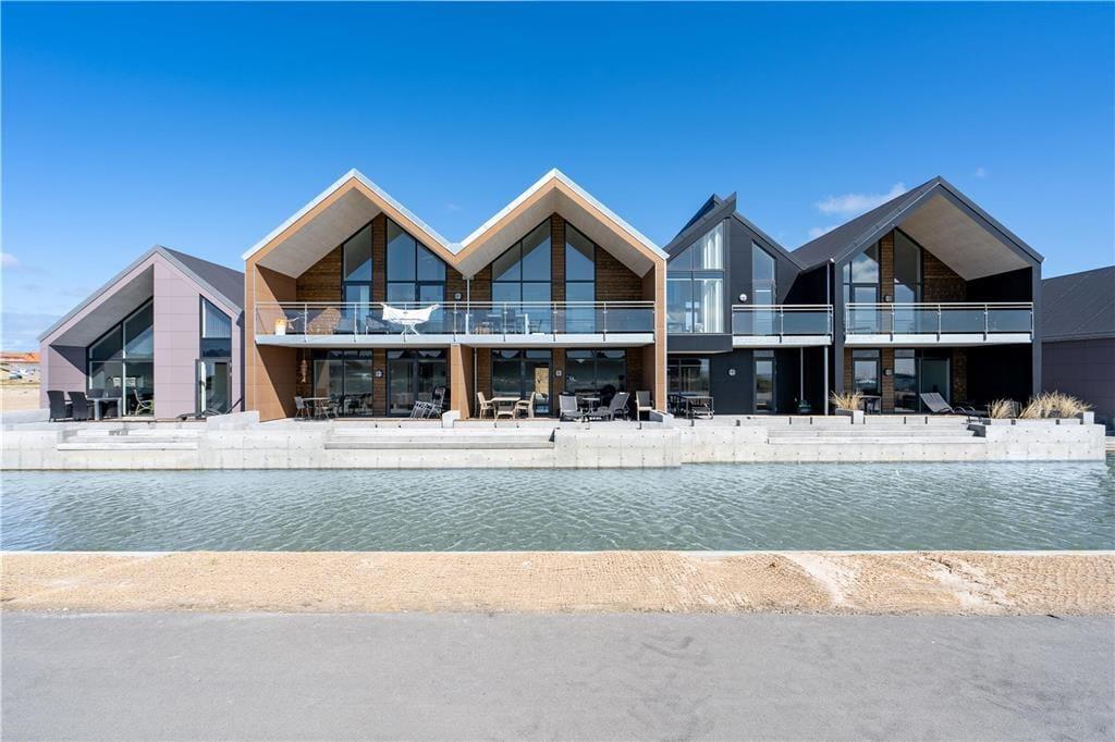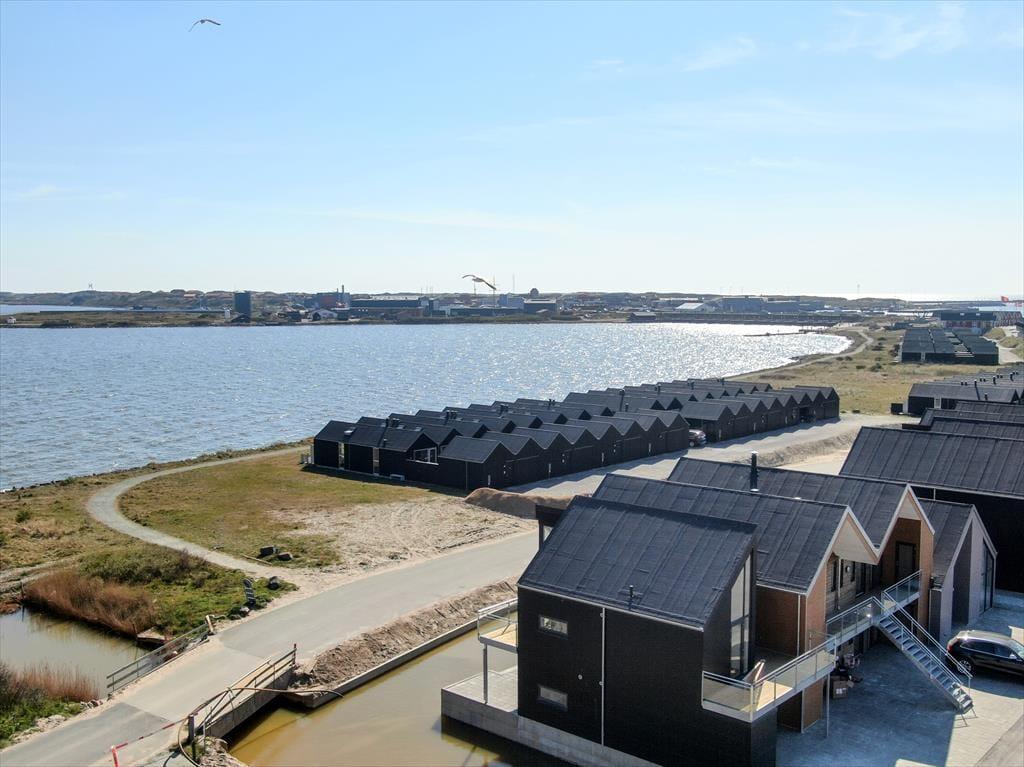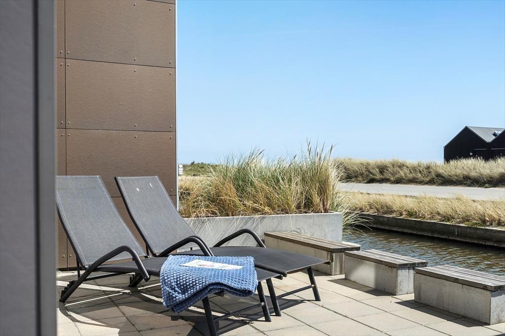 Udearealerne er mindst lige så tjekkede som selve sommerhuset. Mod nord er der god plads til at parkere bilen, og I kan også sætte jer herud for at nyde de lyse sommeraftener. Men den sydvendte terrasse vil nu nok alligevel blive jeres foretrukne opholdsplads i det fri, for den er nemlig stor, solrig og smukt placeret lige ud til kanalens vandspejl. Fra sydterrassen har I desuden udsigt til Ringkøbing Fjord, så det kan ikke blive meget skønnere.