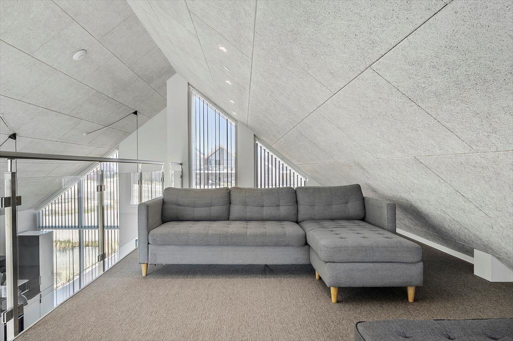 Nærheden til vandet var et af de centrale principper, da arkitekterne tegnede stregerne til Langsand Langs Vand, som feriekomplekset hedder. Netop denne enhed er et enderækkehus, så I har kun naboer til én side og derudover vinduer vendt mod tre verdenshjørner. Det er med til at skabe en lys og let atmosfære i opholdsrummet, hvor I kan slappe af med en god film i sofaafdelingen, spille kort ved spisebordet eller hygge jer med madlavningen i det åbne køkken. I kan også tage turen op på den store hems, der oplagt kan danne rammen om børnenes leg eller en middagslur efter en god frokost. Om natten kan I se frem til at sove sødt på de to gode soveværelser, og når I er klar til at stå op igen, kan I begynde dagen med et opkvikkende brusebad på det velindrettede badeværelse.