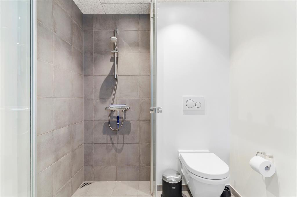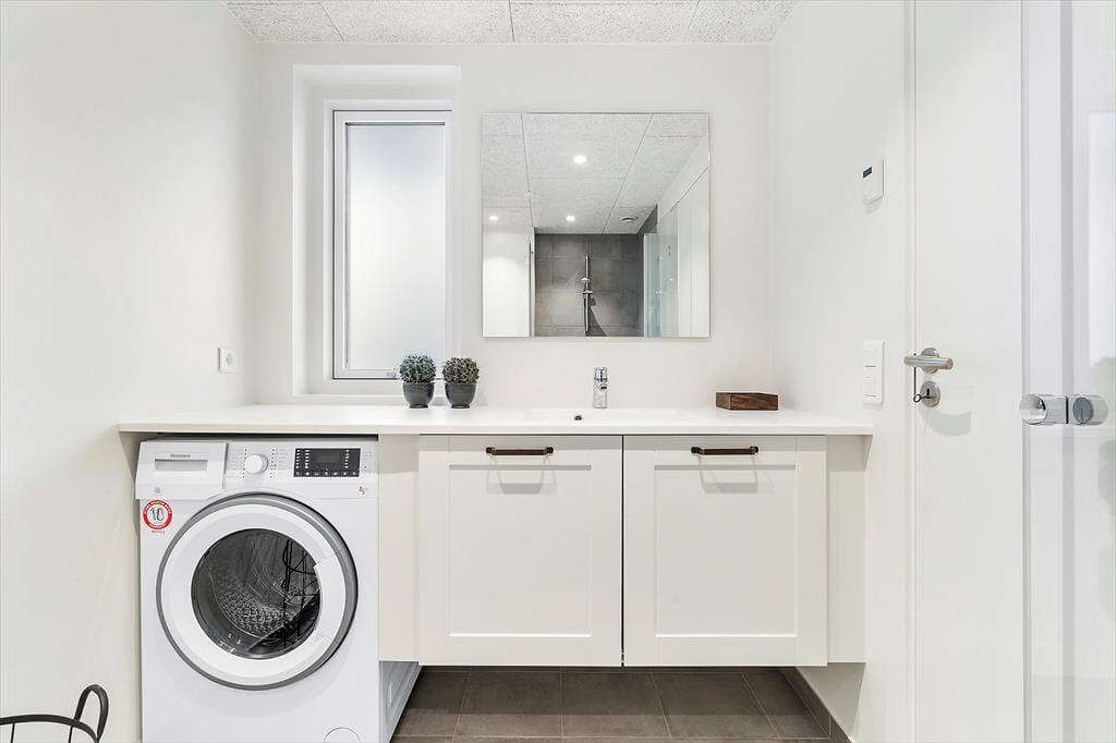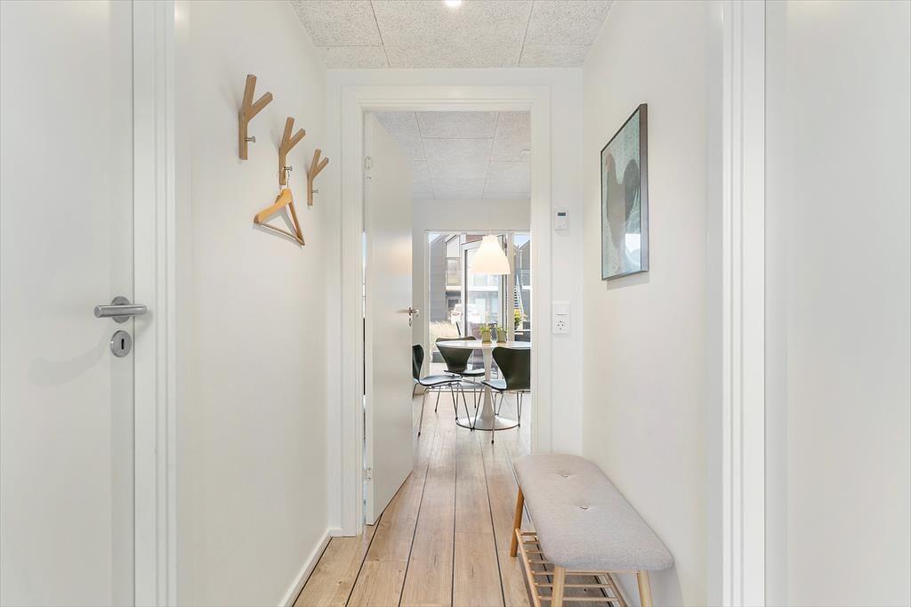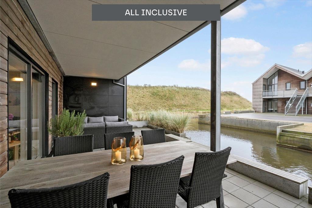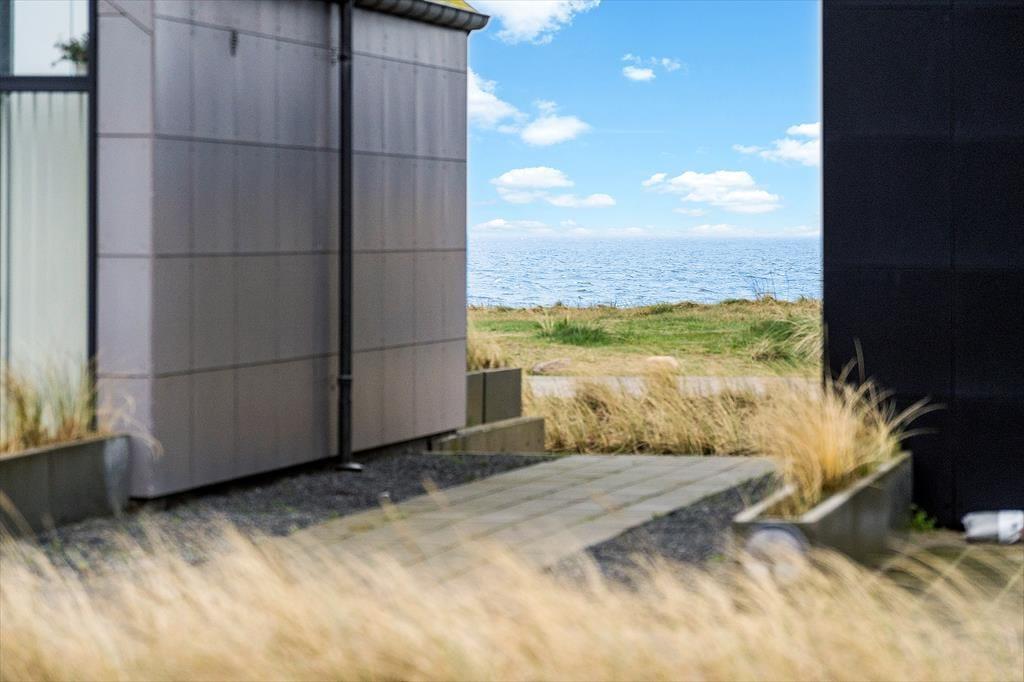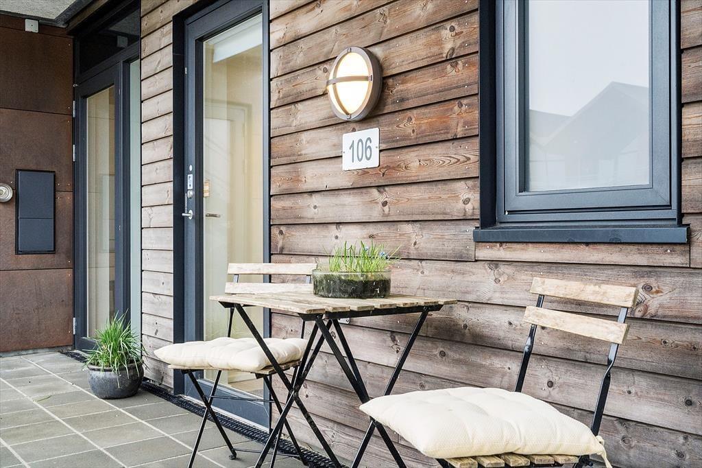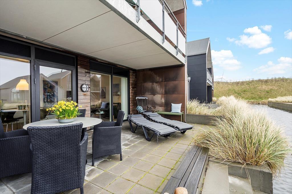 Fra stuen har du direkte adgang til en stor terrasse, så hvis du vil tage morgenkaffen med ud i den friske luft, kan det sagtens lade sig gøre. Terrassen er delvist overdækket og dejligt solrig takket være den sydvendte orientering – som også er grunden til, at du kan se ud mod fjorden, når du slapper af i de rare omgivelser. Vandet er for øvrigt endnu tættere på, for en kanal løber langs med terrassen, så du kan lade tankerne flyve, mens du kigger lige ud på små bølgeskvulp og lytter til vandets klukken.