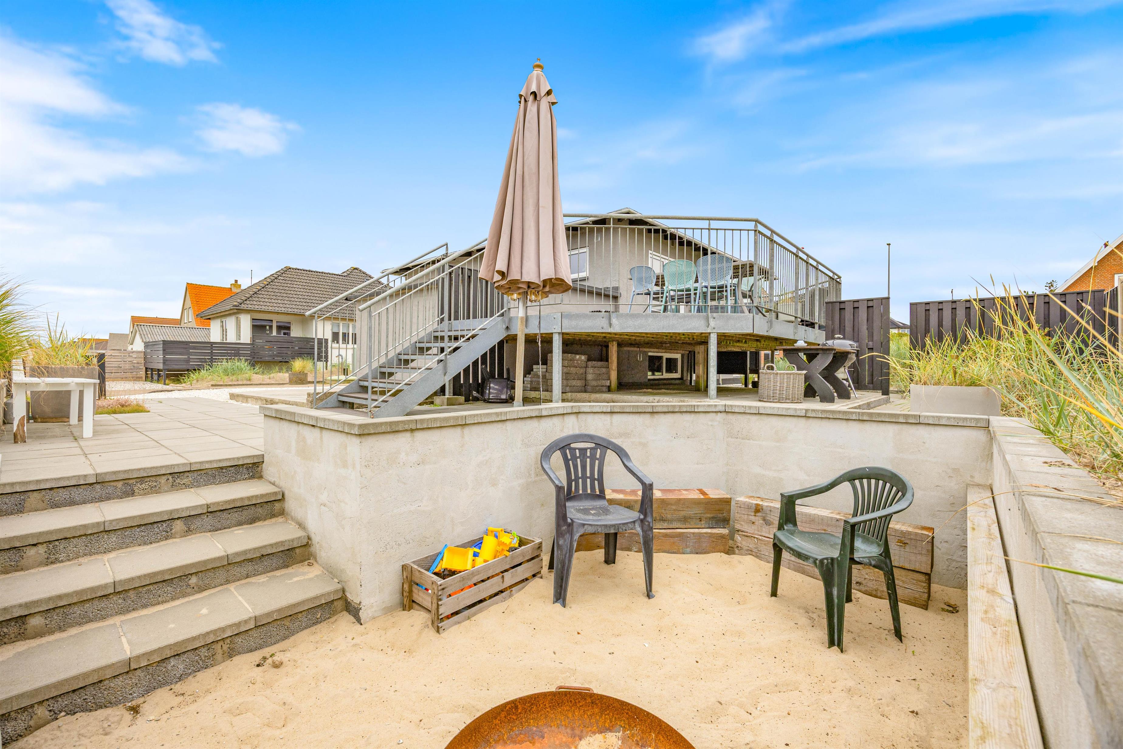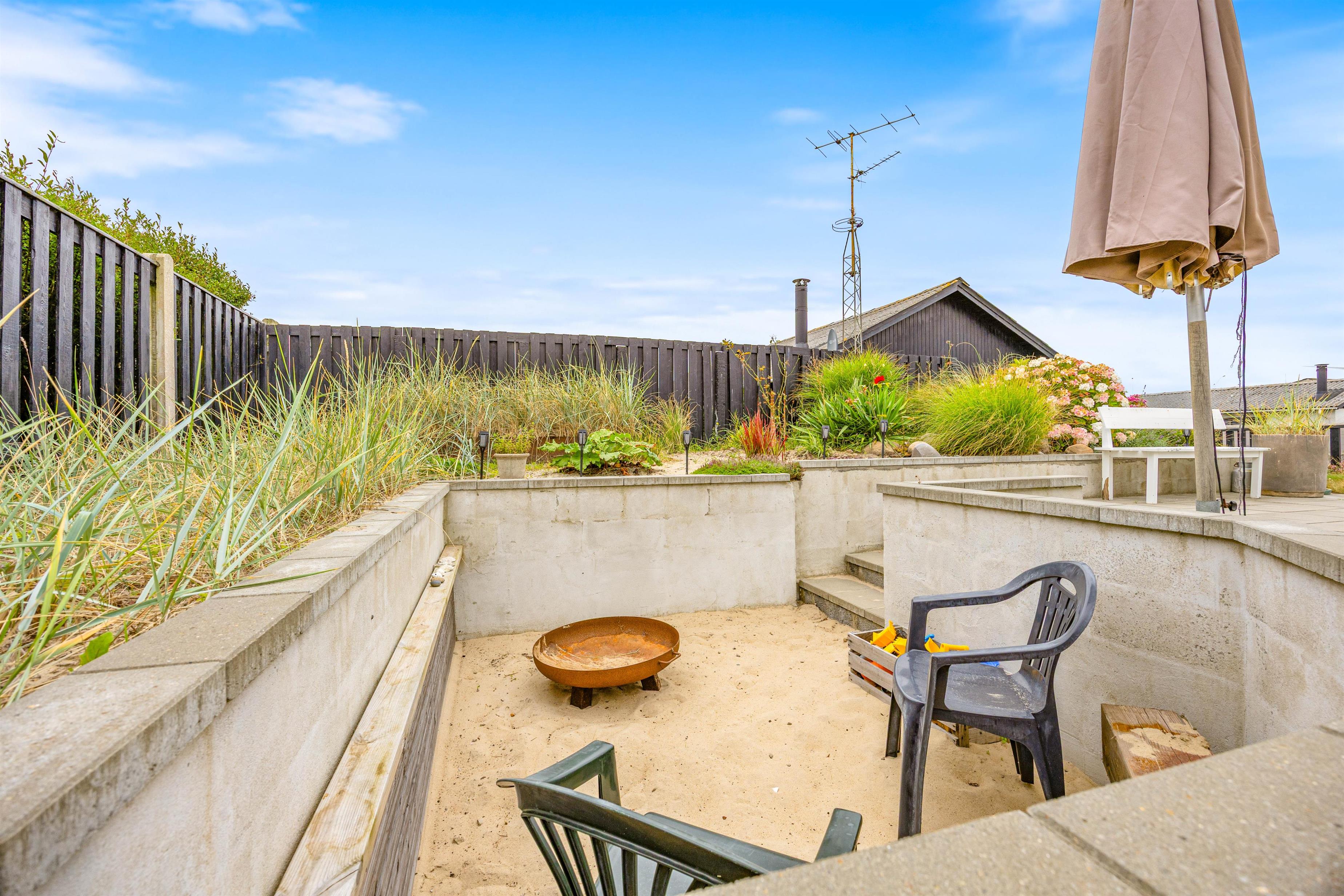 Derudover er der på grunden et hyggeligt nedsunket sted med bålplads. Her kan I sidde langt ud på aftenen i læ og hygge jer med ristede skumfiduser eller snobrød.
