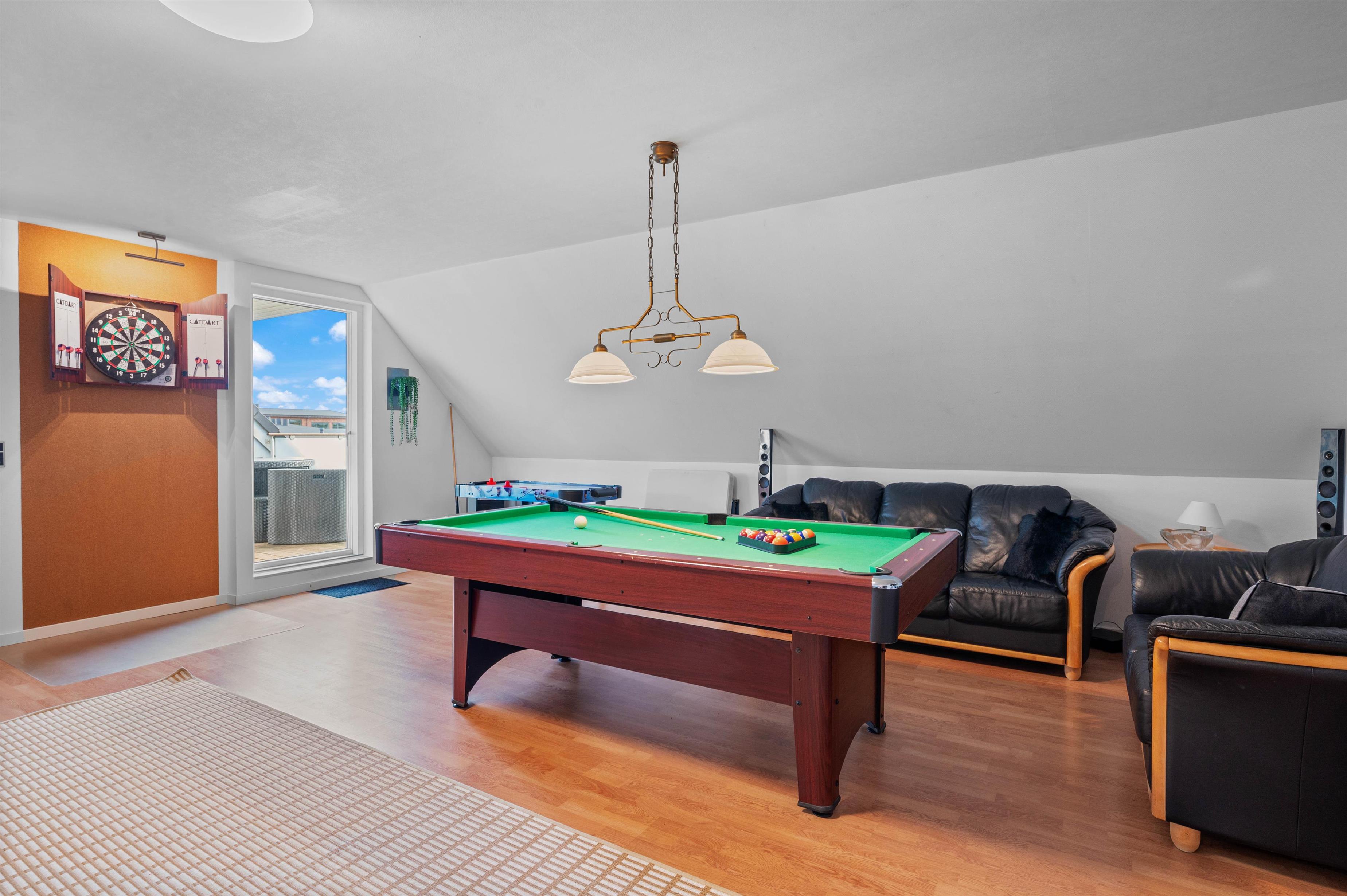 På første sal er der et hyggeligt aktivitetsrum med poolbord, dart og et sjovt spillebord til børnene. Her kan familien tilbringe mange sjove timer, måske endda lave en feriekonkurrence? Der er udgang til skøn, overdækket terrasse med vidunderlig udsigt.