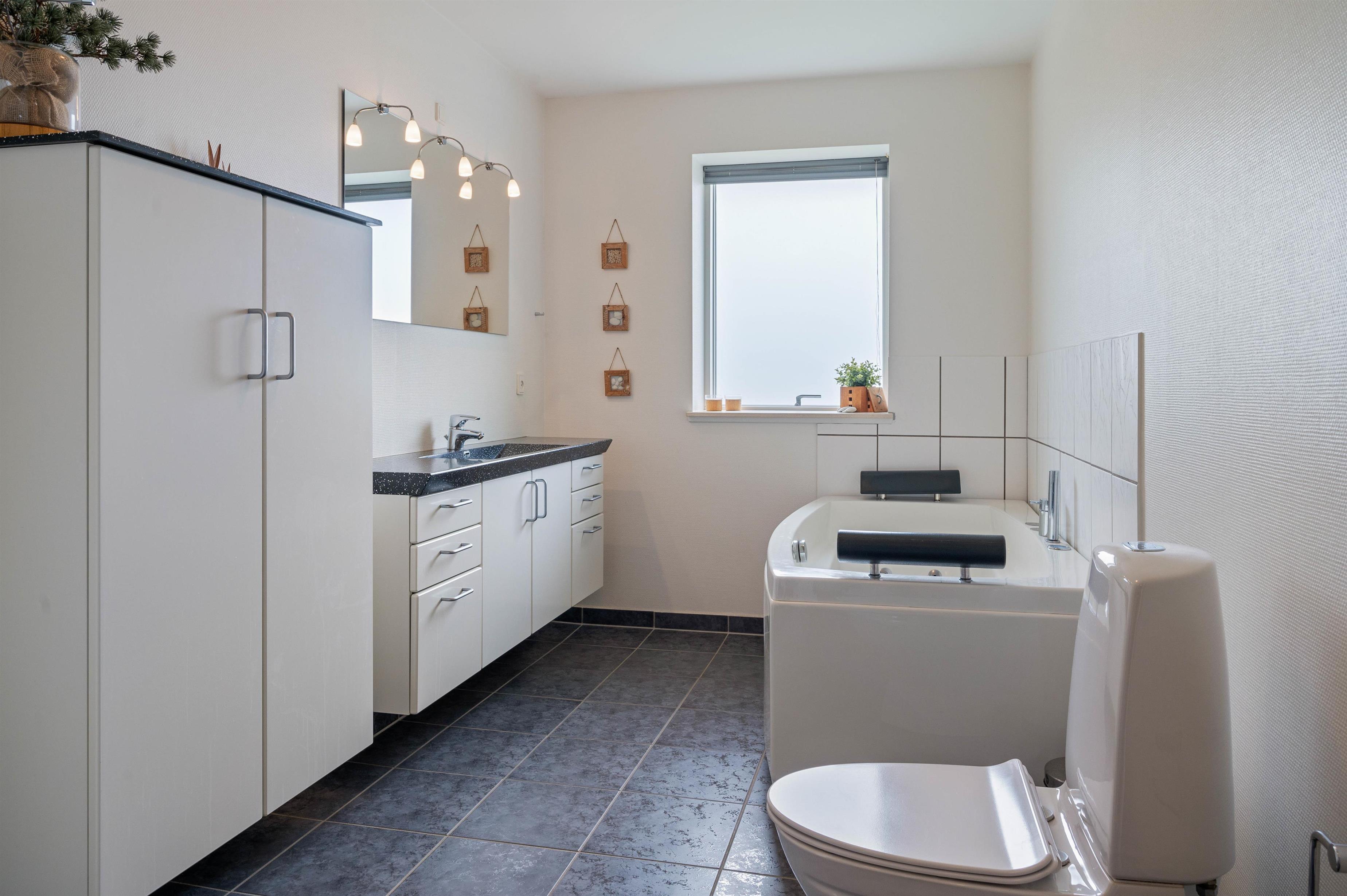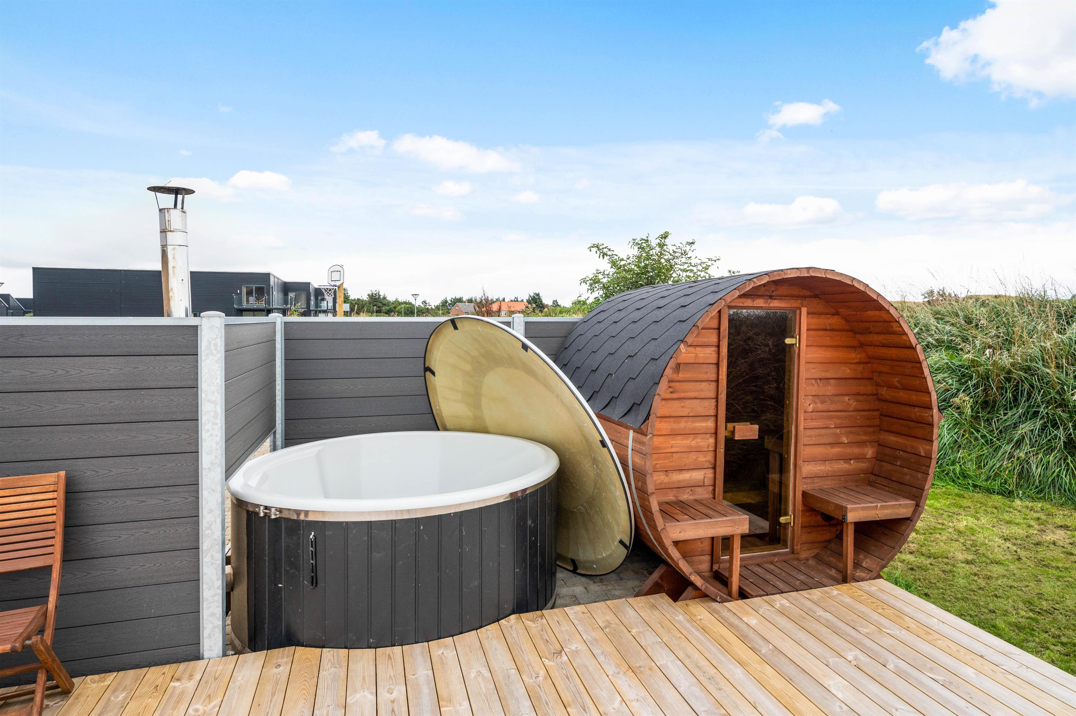 På det ene af husets 2 badeværelser står spabadet - klar til at stå for lidt ekstra wellness og afslapning. Er I mere til udendørs wellness, kan I hoppe i vildmarksbadet udenfor og derefter varme jer i den hyggelige saunatønde. Fra første sal er der adgang til flere balkoner, hvorfra I kan nyde den flotte udsigt over naturen og fjorden.