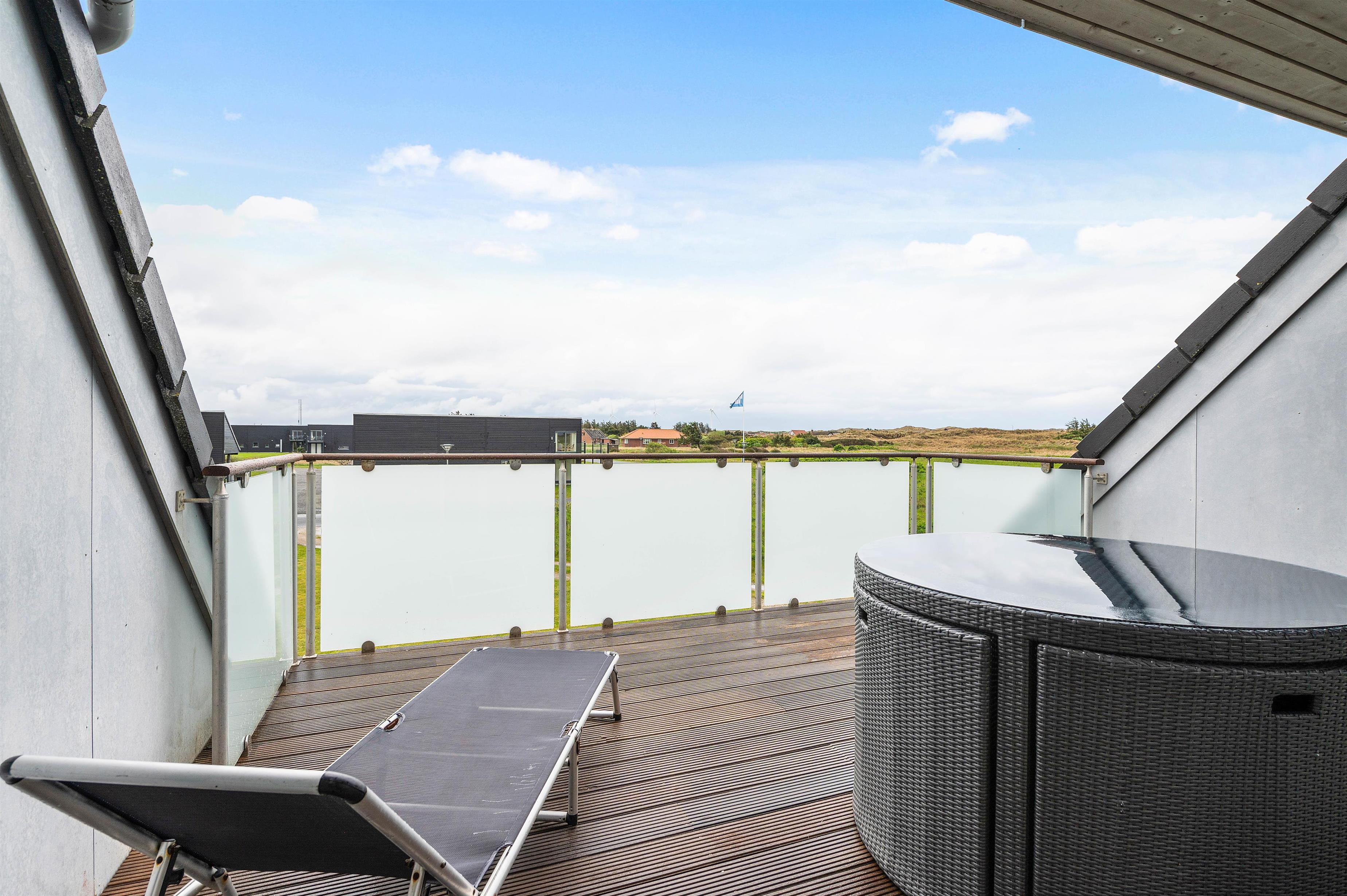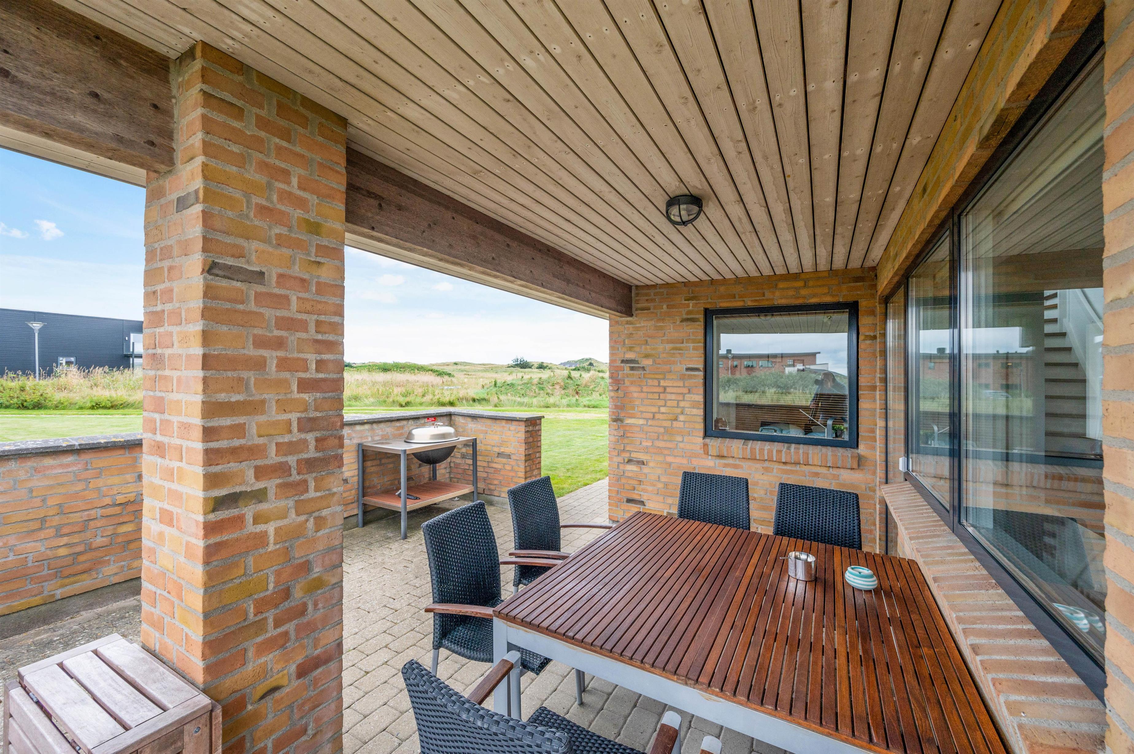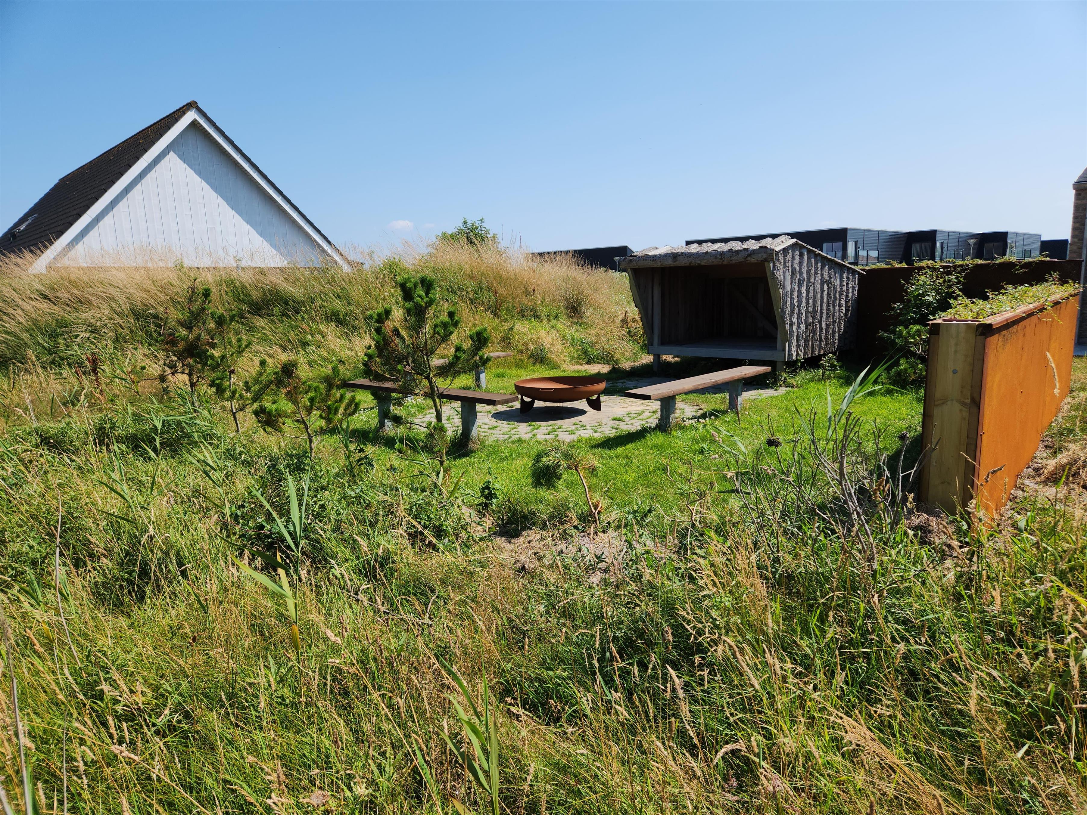 Rundt om feriehuset løber en velholdt græsplæne, og på den ene side af huset finder I en afskærmet terrasse, hvor I kan nyde vejret og udsigten. Der er sørget for både havemøbler, liggestole og grill, så I kan udnytte sommerdagene fuldt ud. Her er der også en bål og shelter plads som I kan hygge jer med.