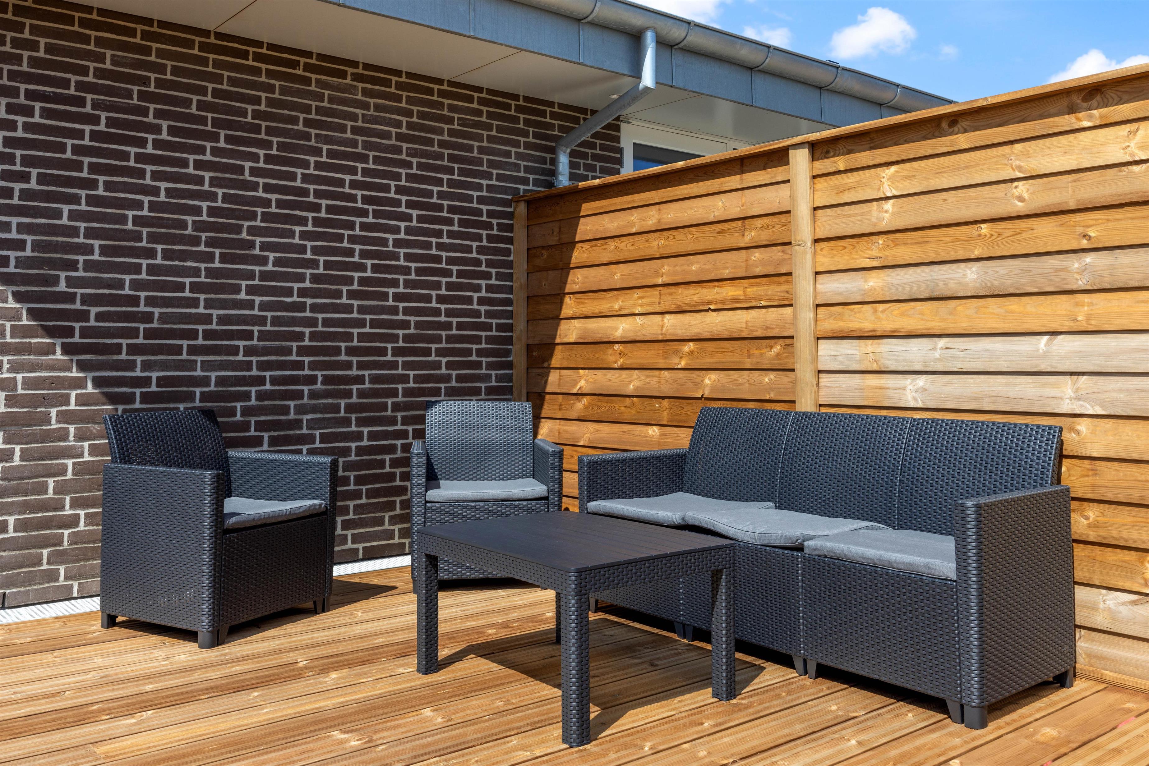 Til ferielejligheden på Nørregade 2, lejlighed 30 hører en afskærmet, lukket terrasse mod syd og fjordudsigt. På havemøblerne kan i nyde solen fra morgen til aften. På solvognene kan I slappe af eller læse en god bog, eventuelt under parasollen, hvis solen er for skarp. På grillen kan I tilberede og nyde et lækkert aftenmåltid på terrassen, imens solen går ned i det glitrende hav.