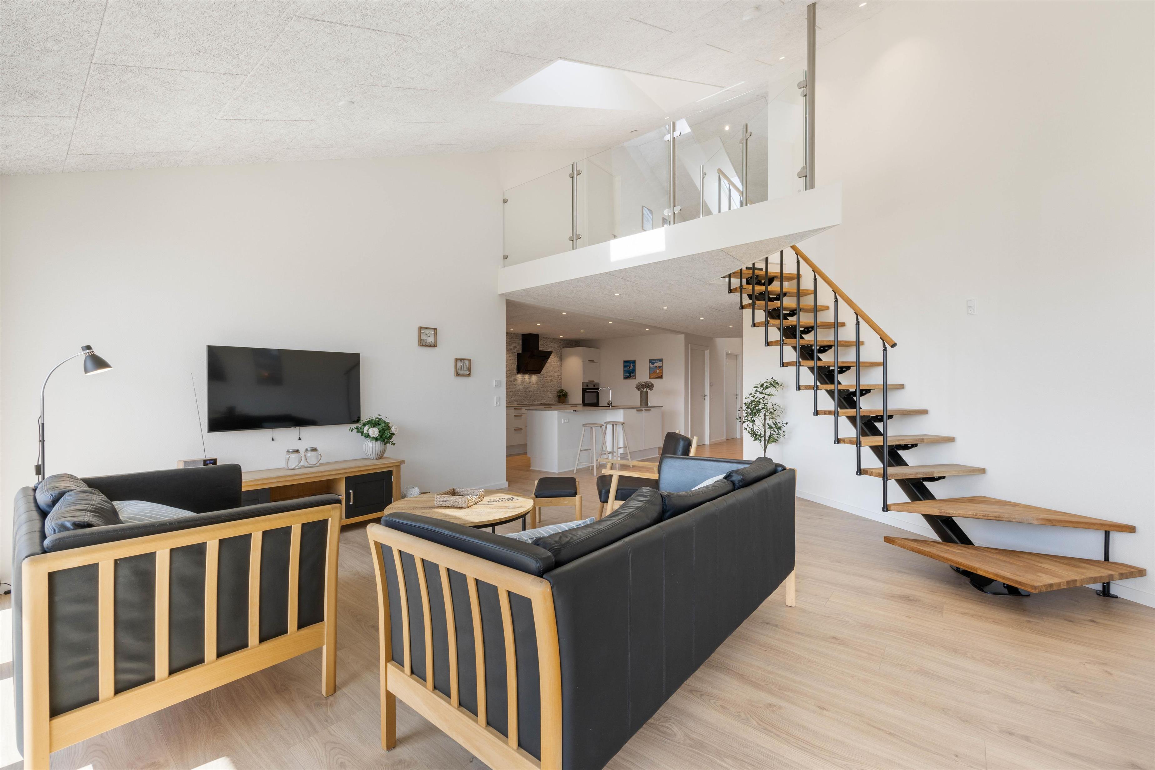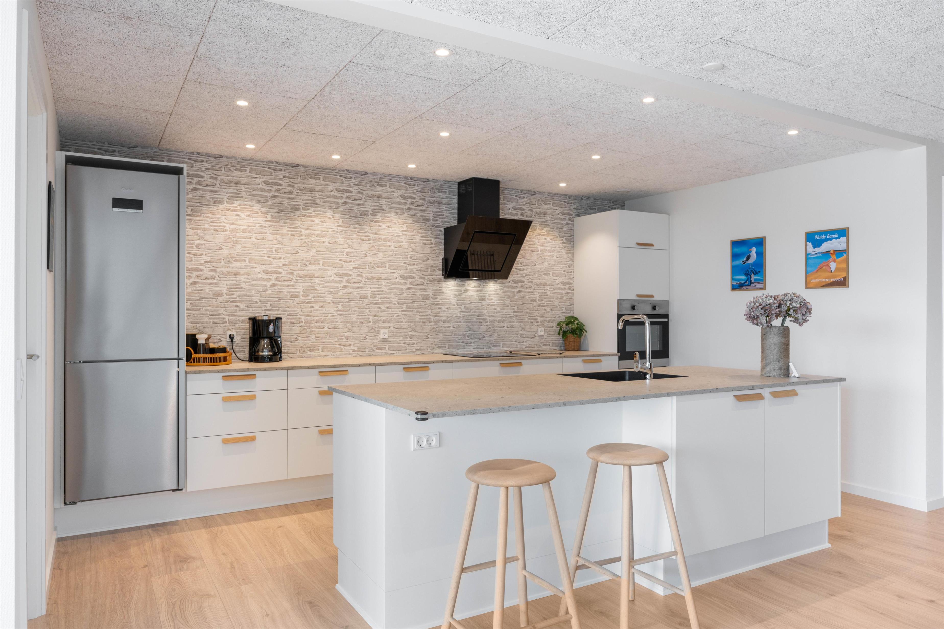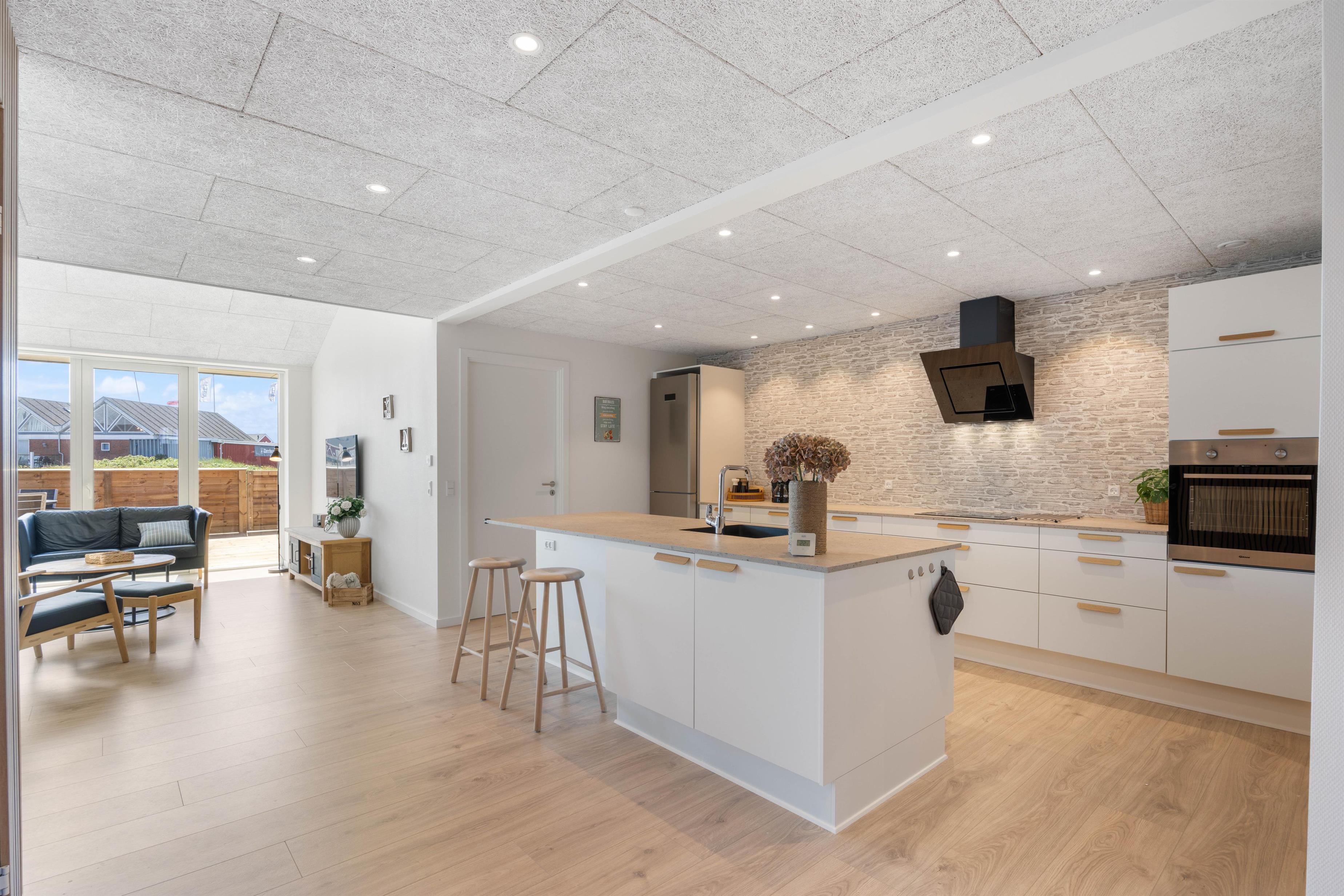 Ferielejligheden på 141 m2 er opført i 2023 og indeholder et praktisk indrettet køkken med induktionskomfur og ovn, mikroovn, køleskab og separat fryser på 94 liter, hvor der er plads til opbevaring af lystfiskerens fangst. Ved siden af ligger en dejlig lys og rummelig opholdsstue med spiseplads og hyggelig sofagruppe til afslapning efter en dejlig dag ved vandet og i byen. I hele underetagen er der installeret gulvvarme. En bonus ved dette hus er, at der er gratis varme.