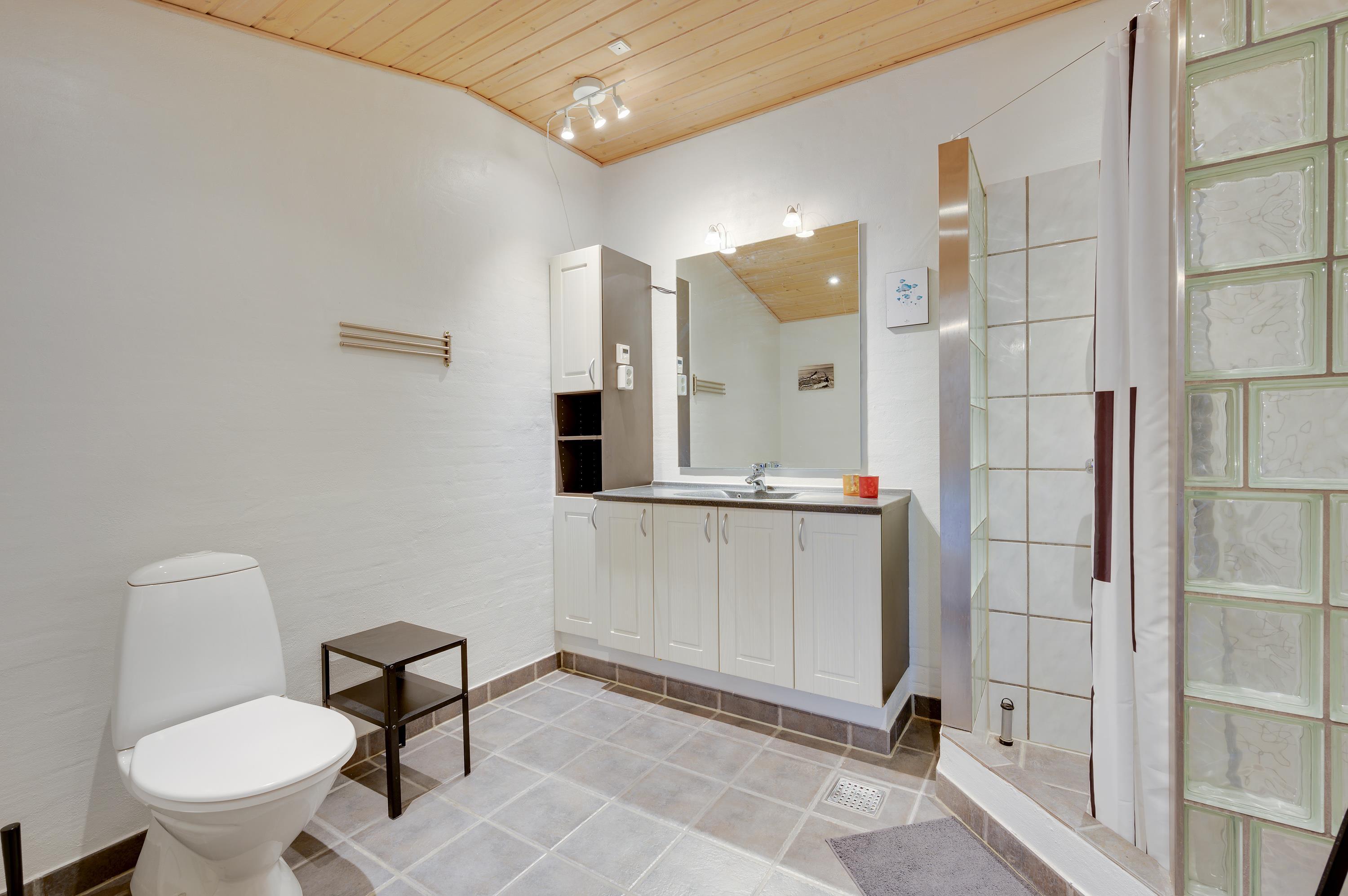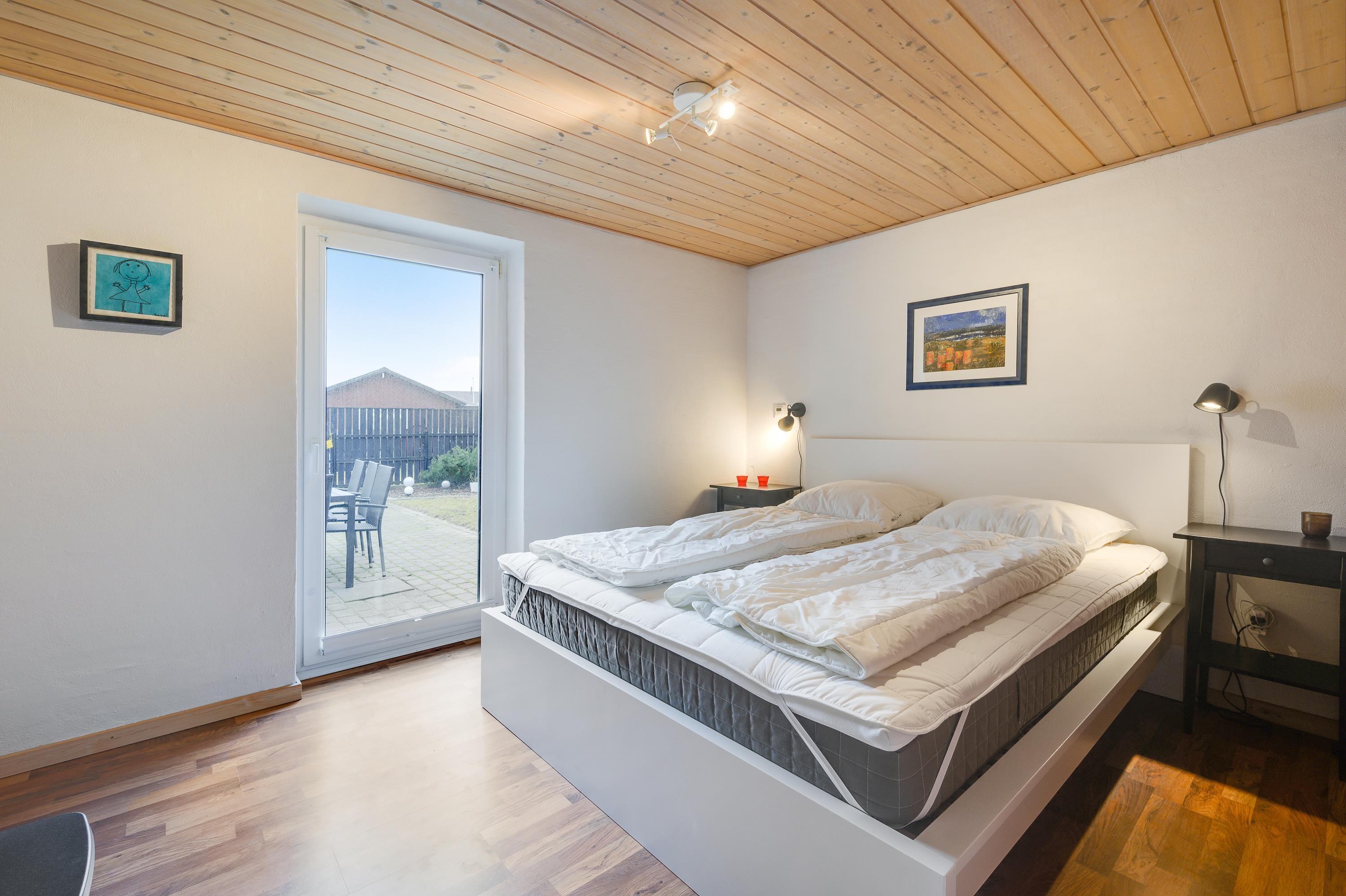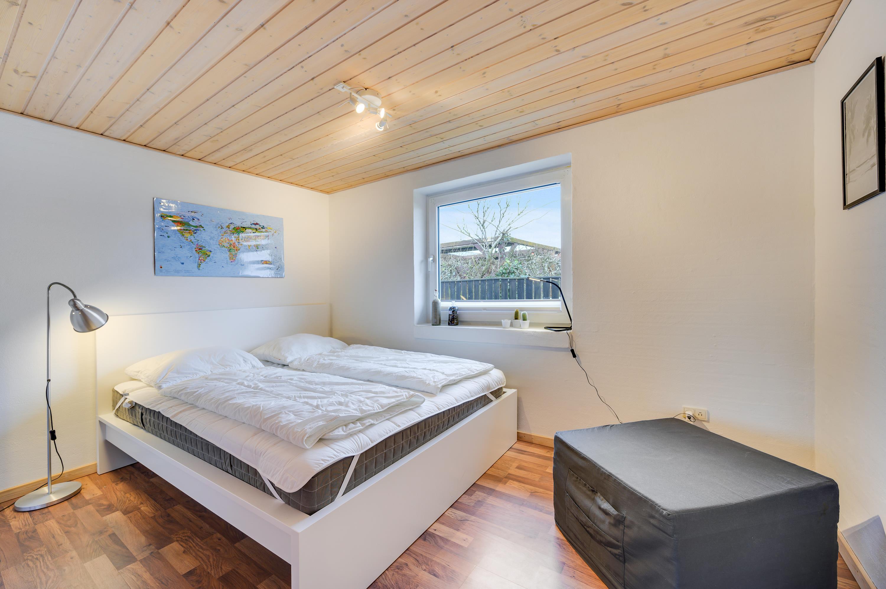 Feriehuset har i alt 5 soveværelser, hvor de 8 sovepladser fordeler sig på 2 dobbeltsenge, 2 enkeltsenge samt en sovesofa. Der er 2 badeværelser i sommerhuset – begge med gulvvarme. Desuden er der mulighed for at få vasket tøj under ferien, da der både er vaskemaskine og tørretumbler i sommerhuset.