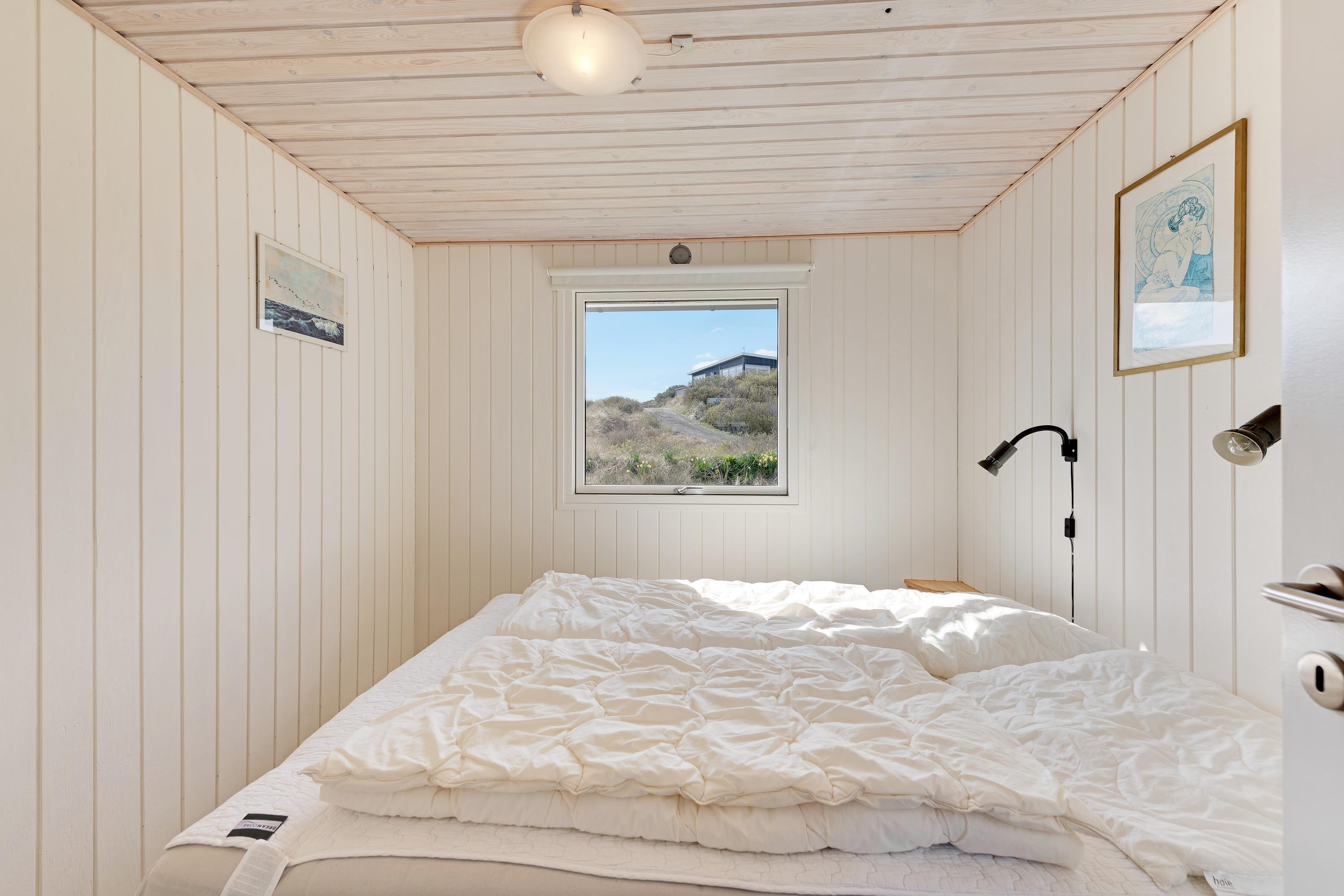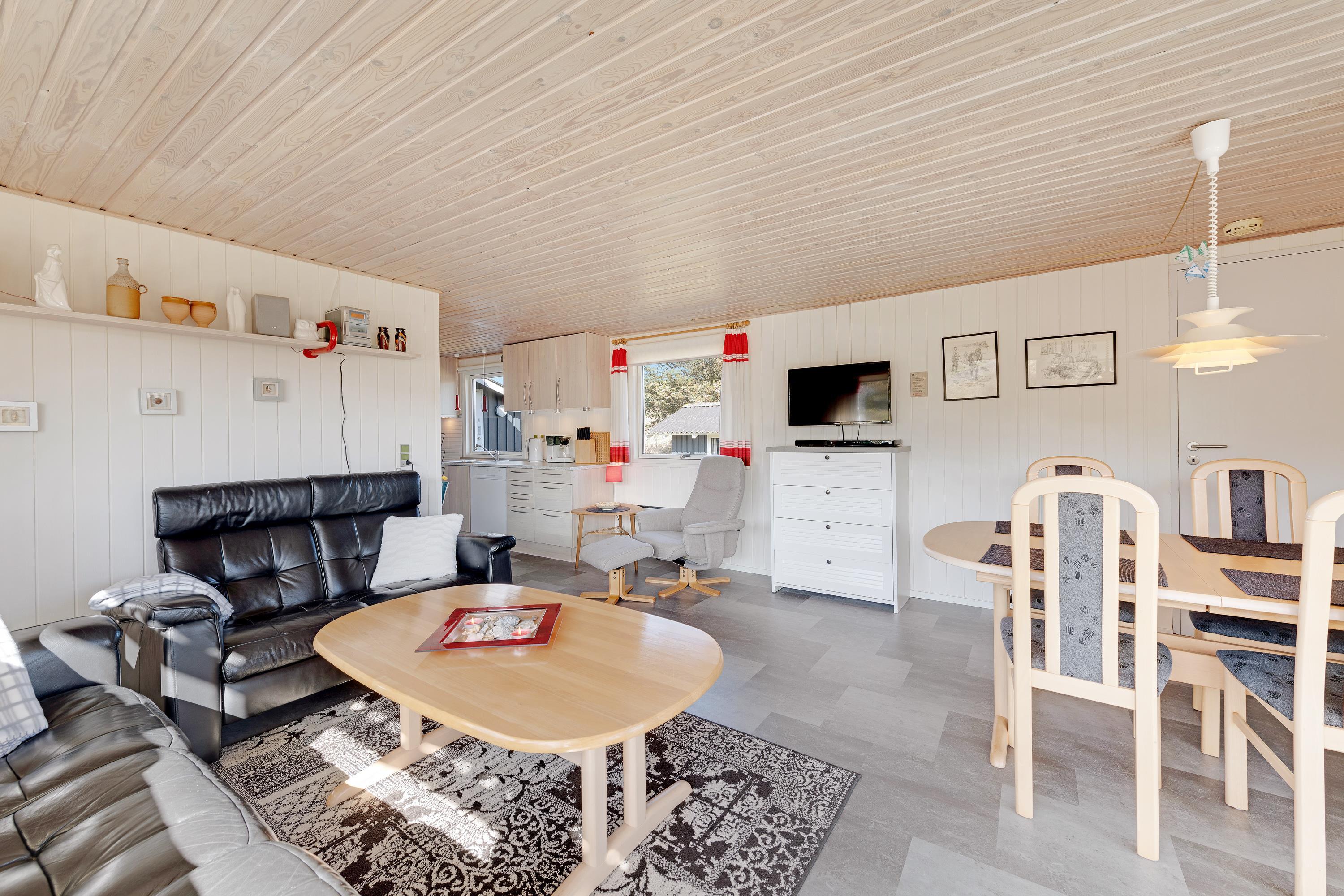 Allerede ved første øjekast mærker man feriestemningen i dette sommerhus: De lyse vægge og lofter og det store vinduesparti gør huset lyst og åbent. Stuen og værelserne er indrettet med hyggelige sommerhusmøbler, og I får tid til ekstra meget afslapning, når opvaskemaskinen og vaskemaskinen tager sig af det praktiske.