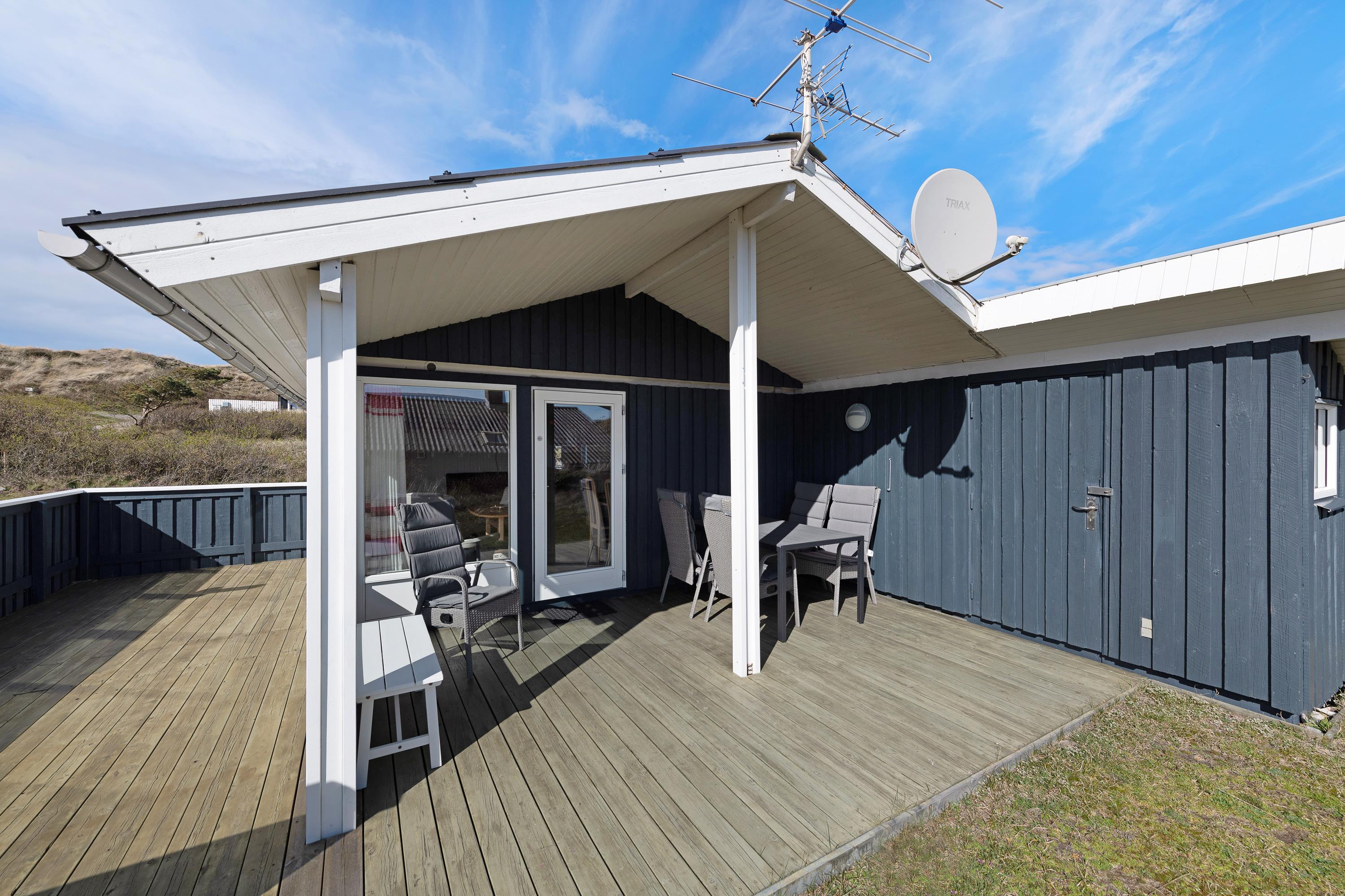 Fra det åbne køkken/alrum med sofaområde og spisebord kan I gå direkte ud på træterrassen, som er afskærmet og delvist overdækket. Terrassen vender både mod Syd og mod Vest, så der er rig mulighed for at solbade hele eftermiddagen og for at nyde en grillmiddag i solnedgangen. På regnvejrsdage kan I sidde i tørvejr under halvtaget og nyde den friske luft.