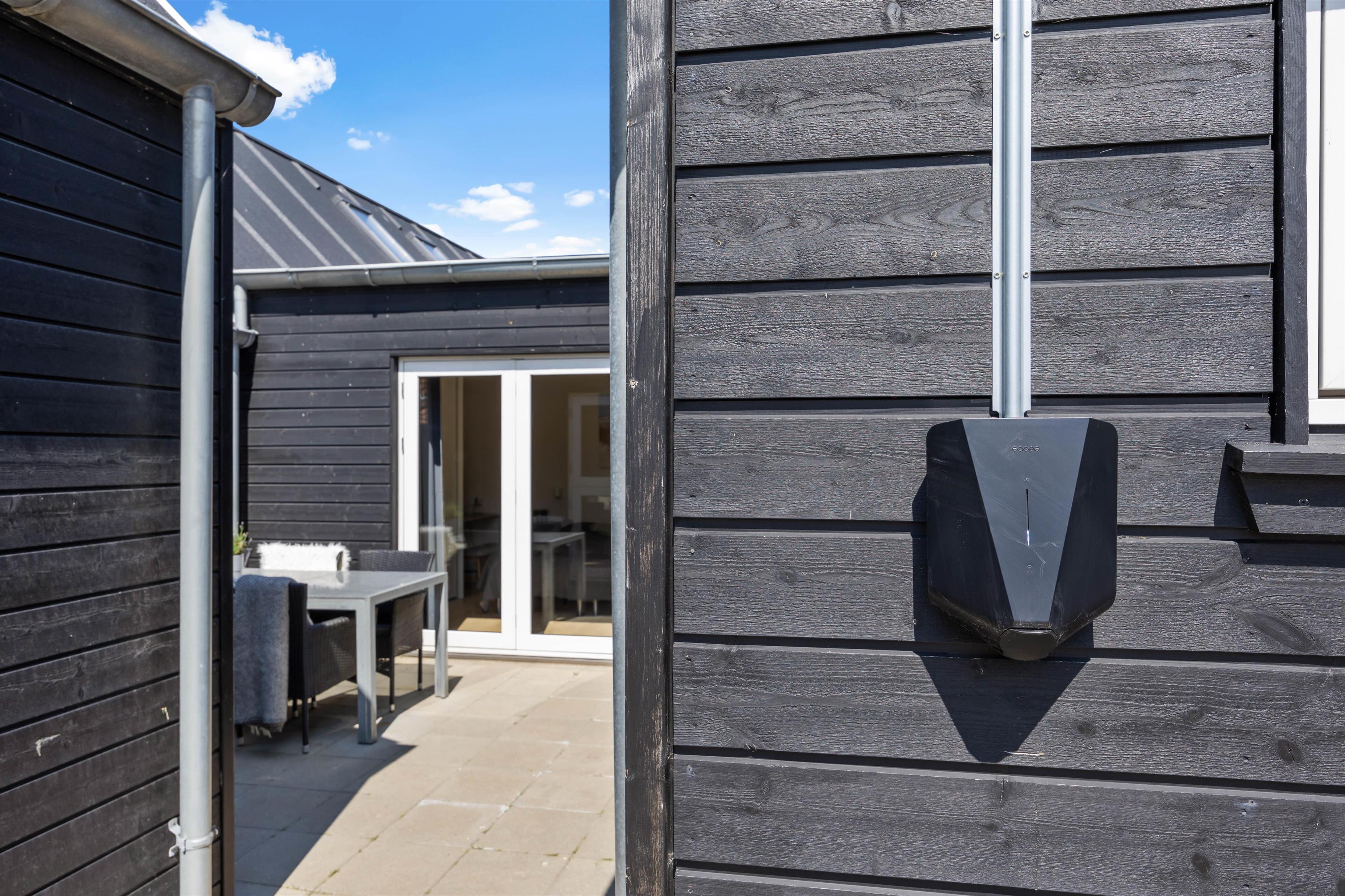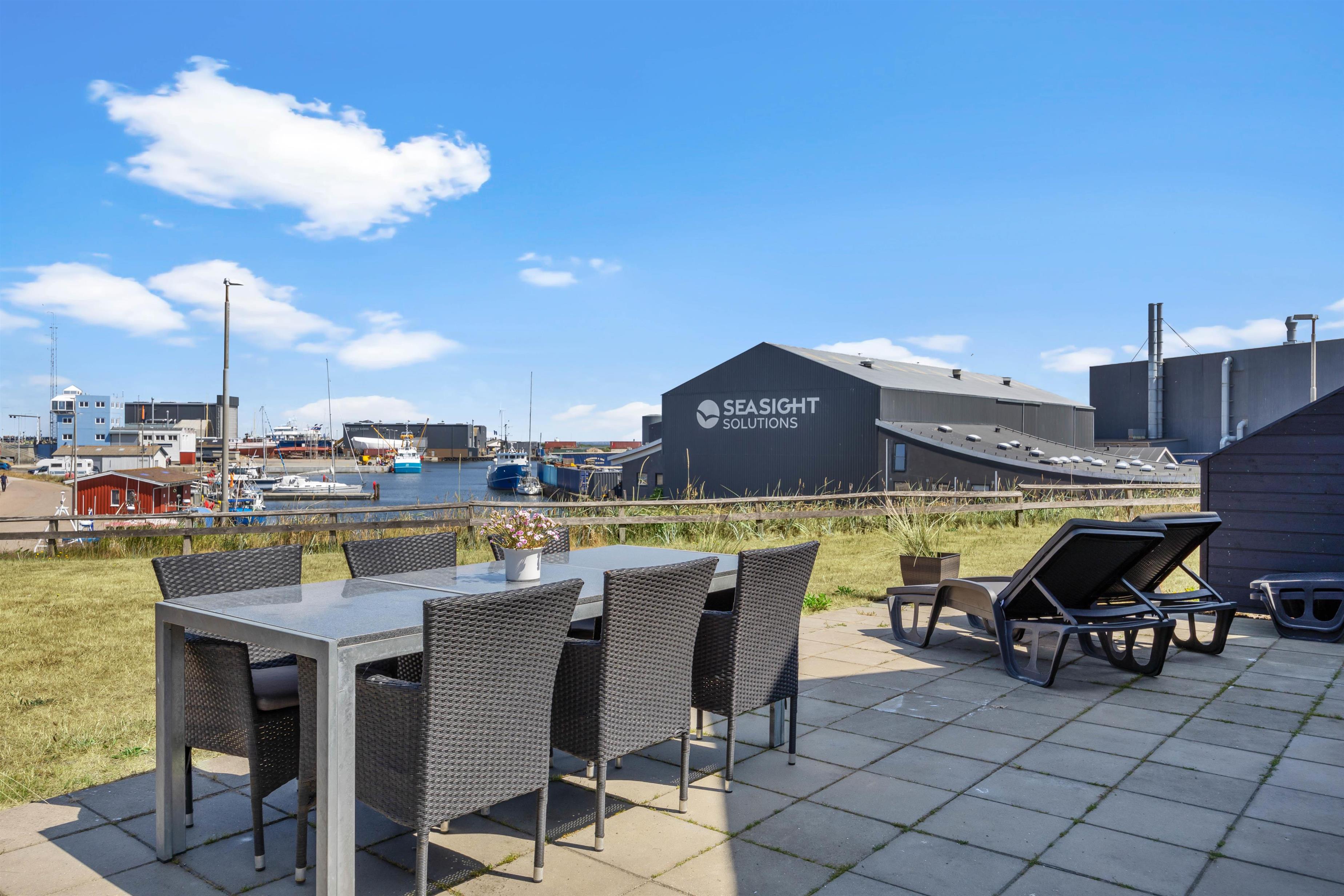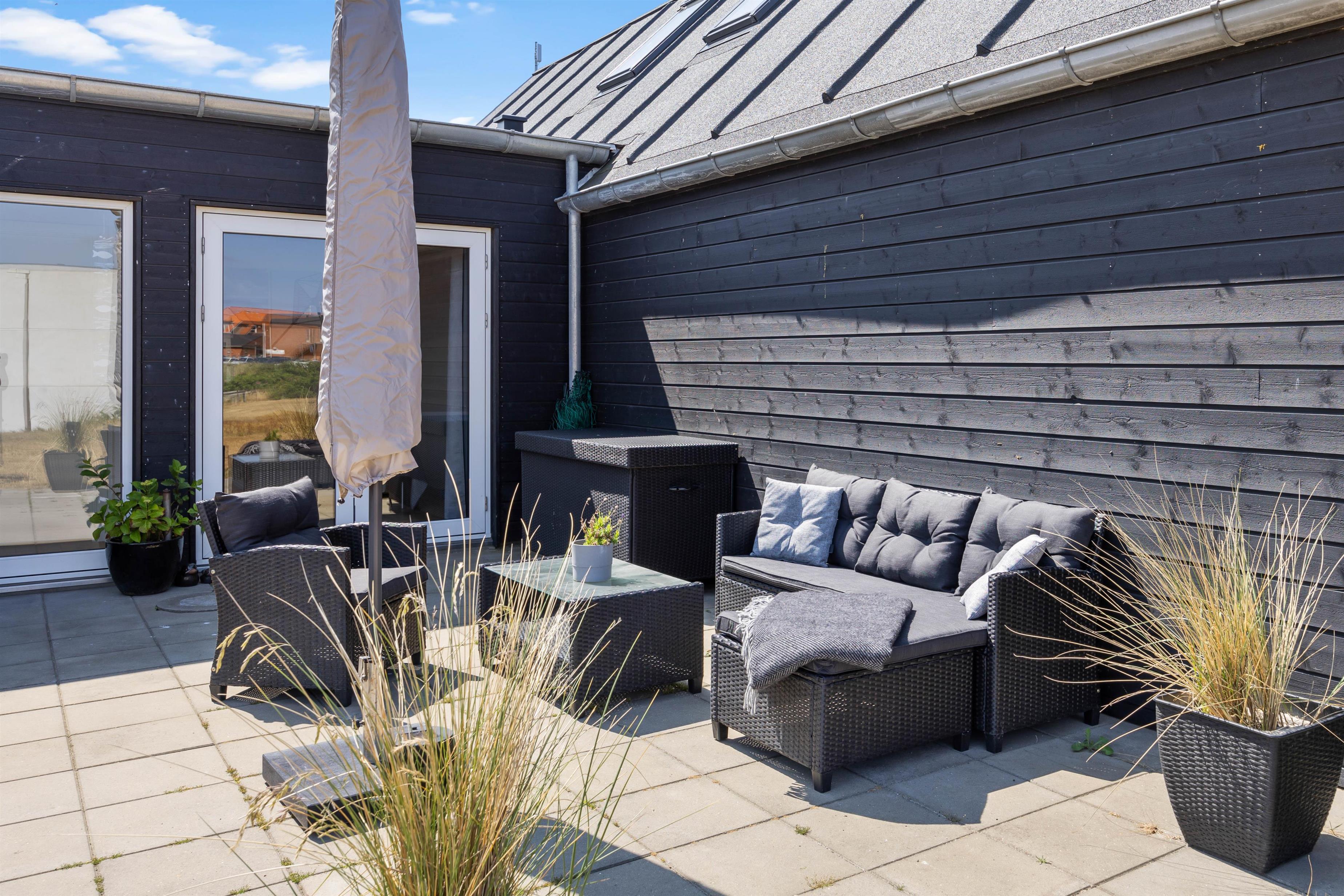 Mod syd er der en helt lukket terrasse. Her kan I slappe af helt ugeneret og nyde en skøn grillmiddag, måske med friskfangede fisk fra havnen, tilberedt på gasgrillen. Nyd middagen i skæret fra den smukke aftenhimmel. Udenfor vil I fra april til november kunne nyde et forfriskende skyl under udebruseren.