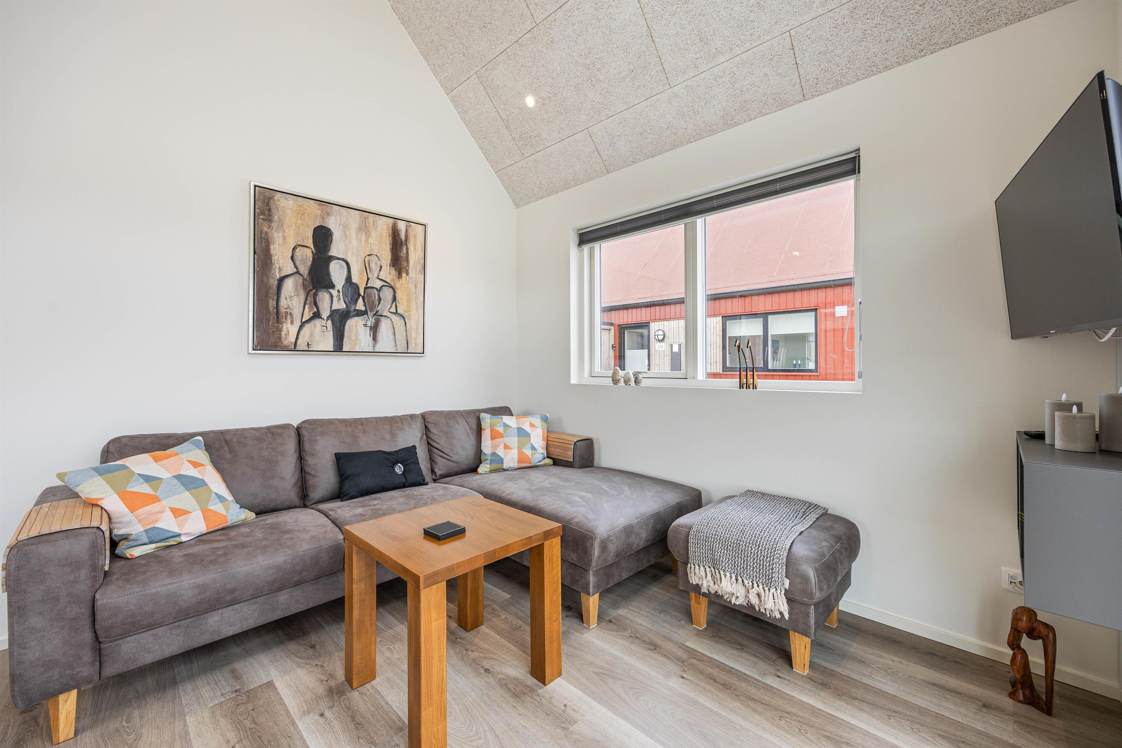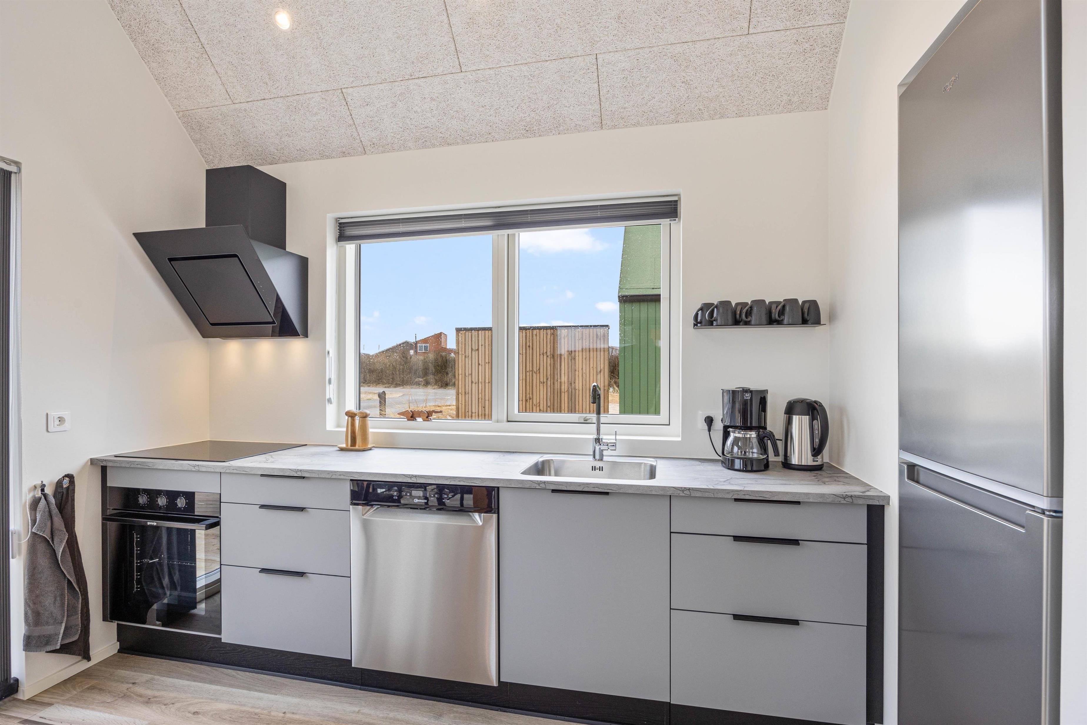 Sommerhuset er dejligt indrettet med et åbent køkken-alrum, hvor store vinduespartier lukker lyset ind og skaber en dejlig atmosfære. Køkkenet er veludstyret med bl.a. opvaskemaskine, så oprydningen efter måltiderne bliver let og hurtig. Den hyggelige stue indbyder til afslapning i sofaen efter en dejlig dag - her kan I nyde en god film eller en brætspilsaften.