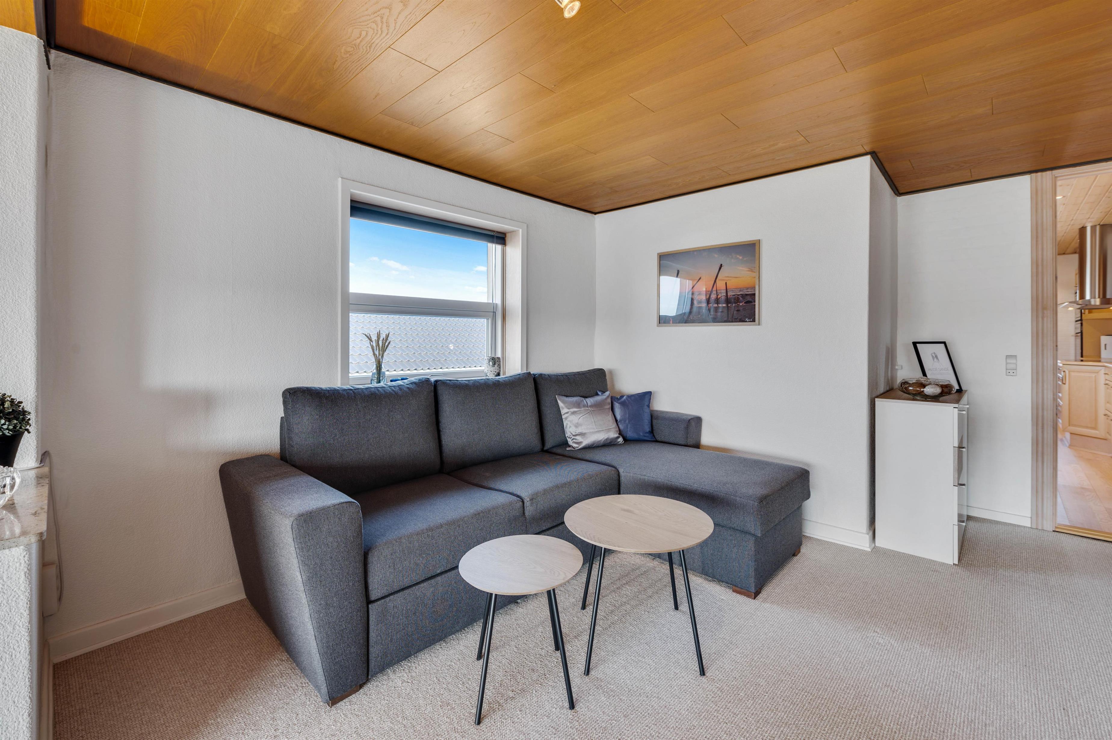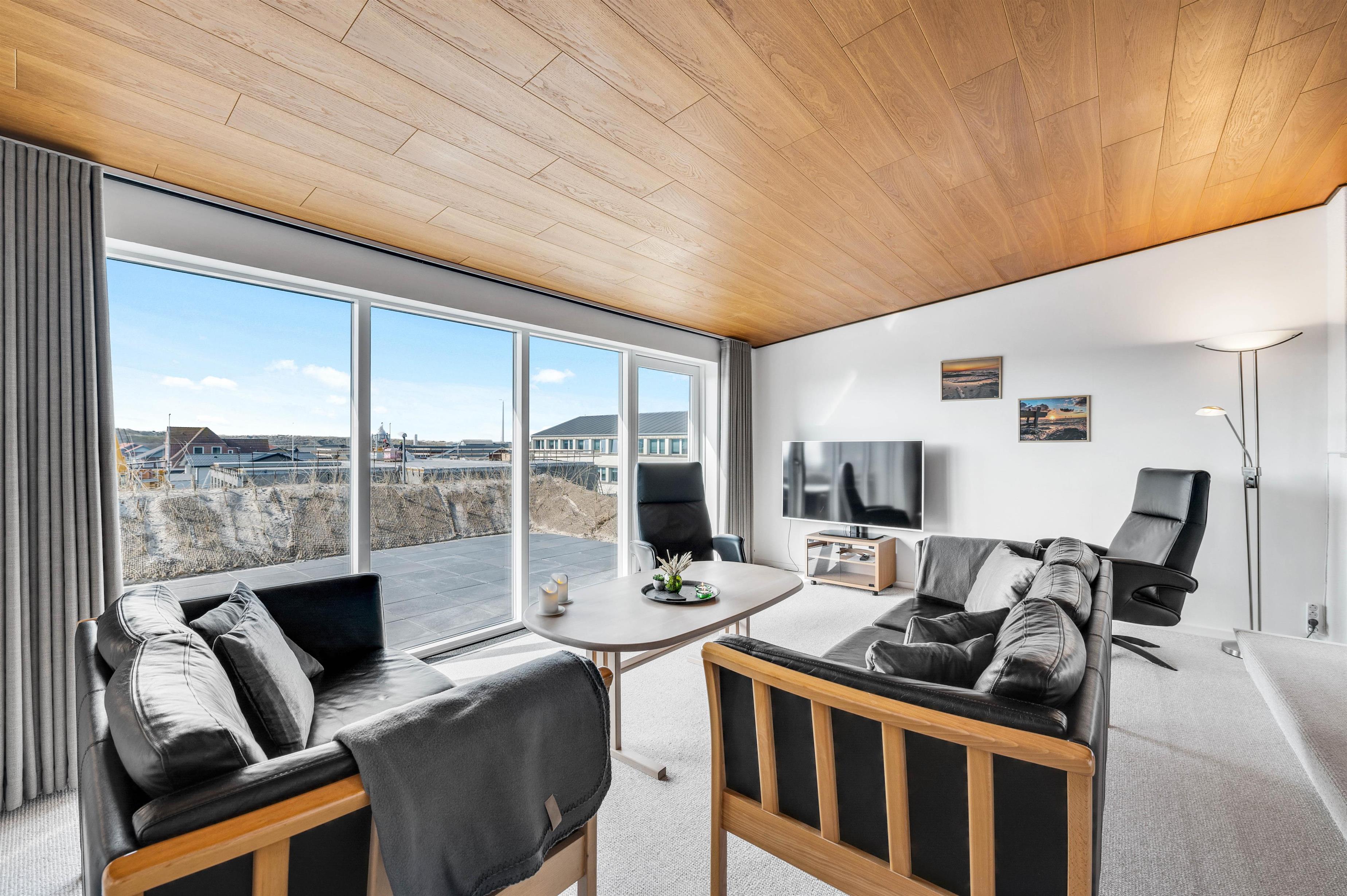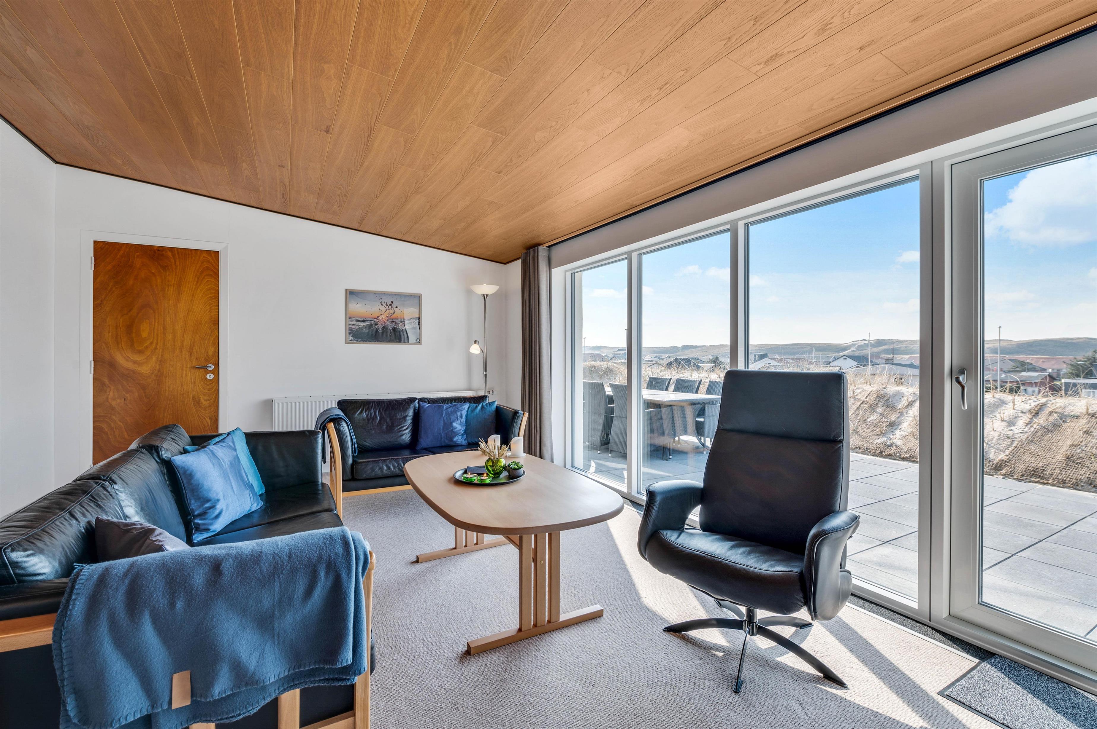 Feriehusets samlingspunkt er den hyggelige stue, hvorfra der en fin udsigt til klitterne mod vest. Her kan I slappe godt af efter en lang feriedag ved vandet, inden sengen kalder.