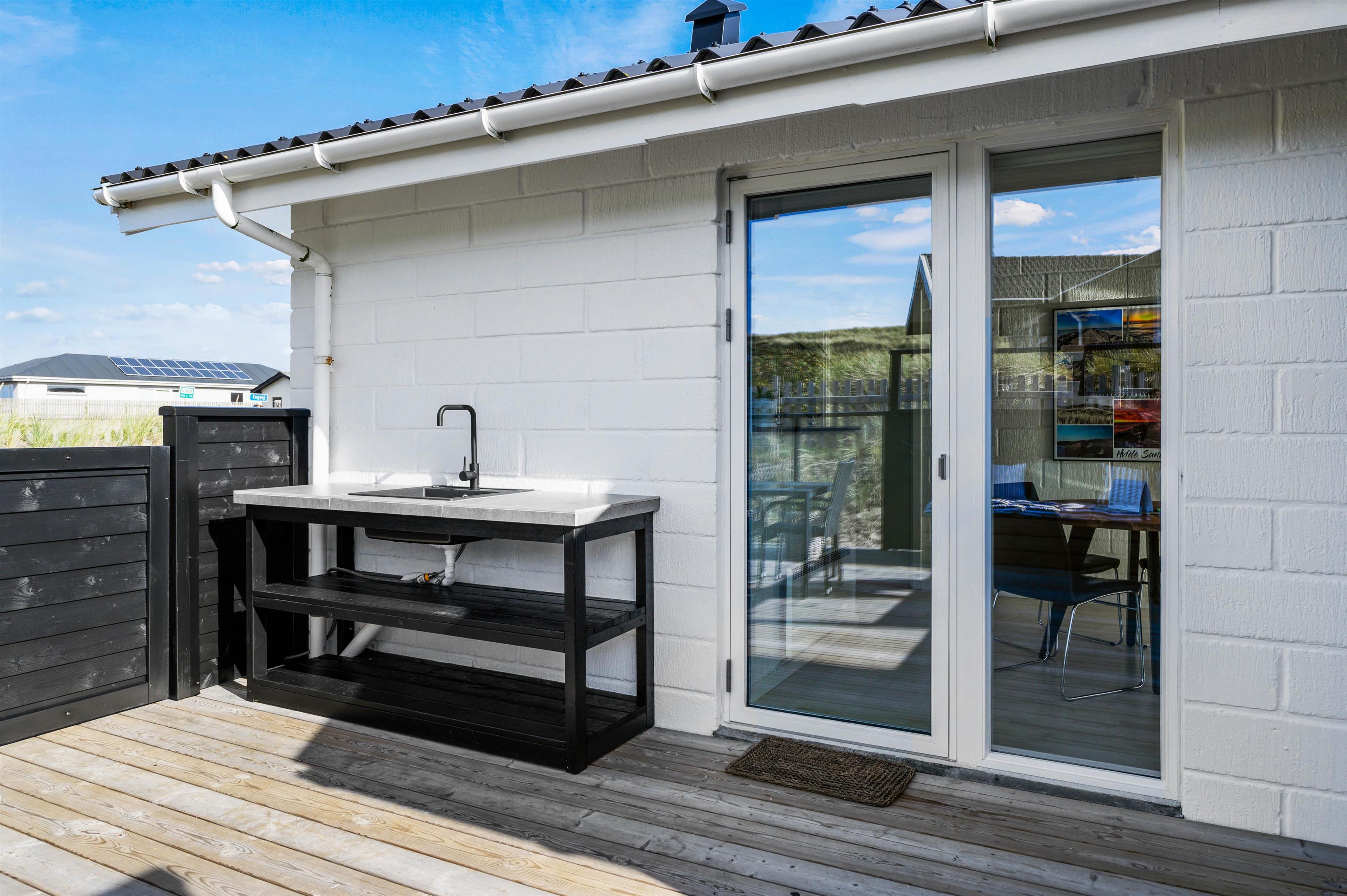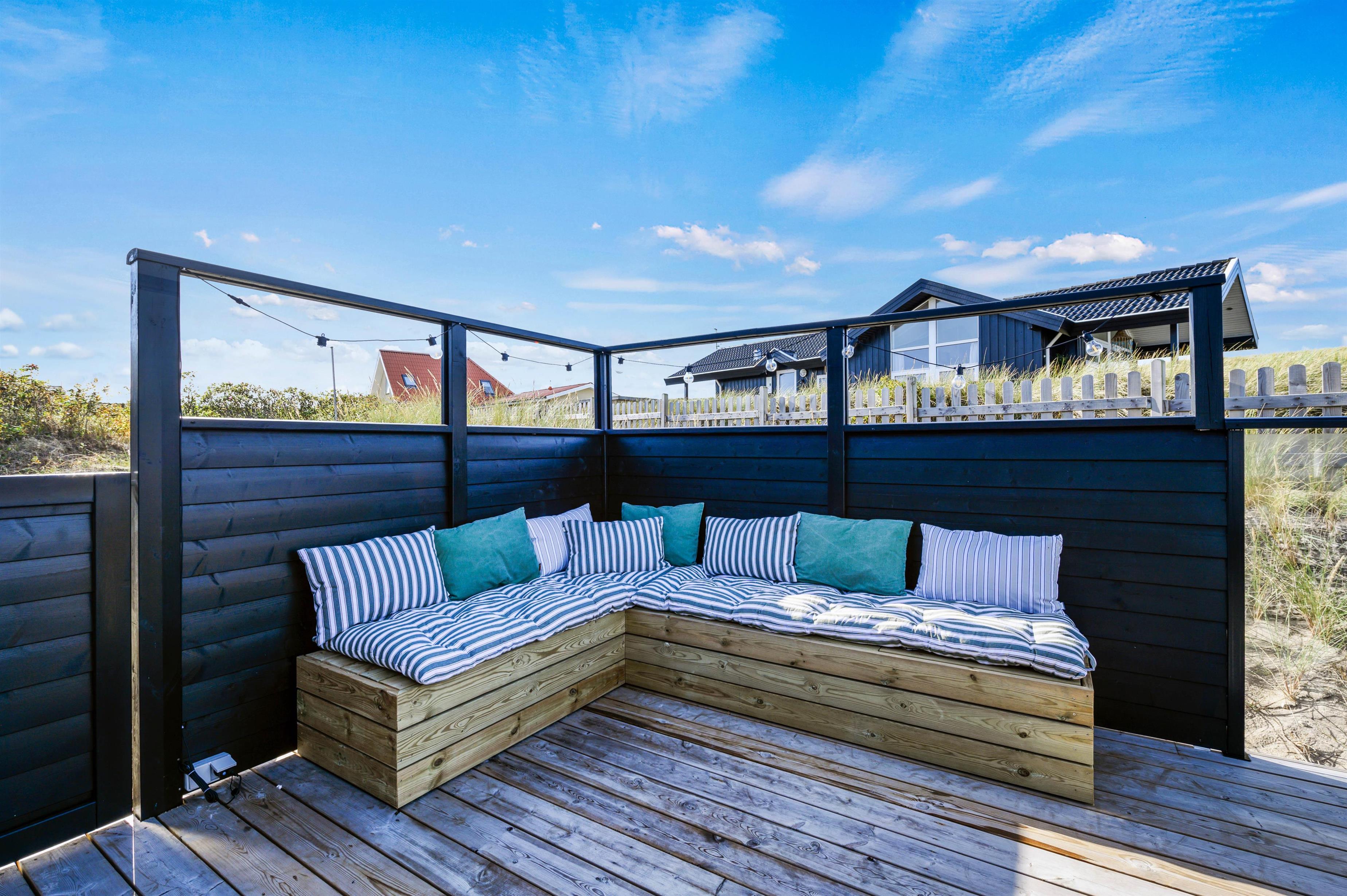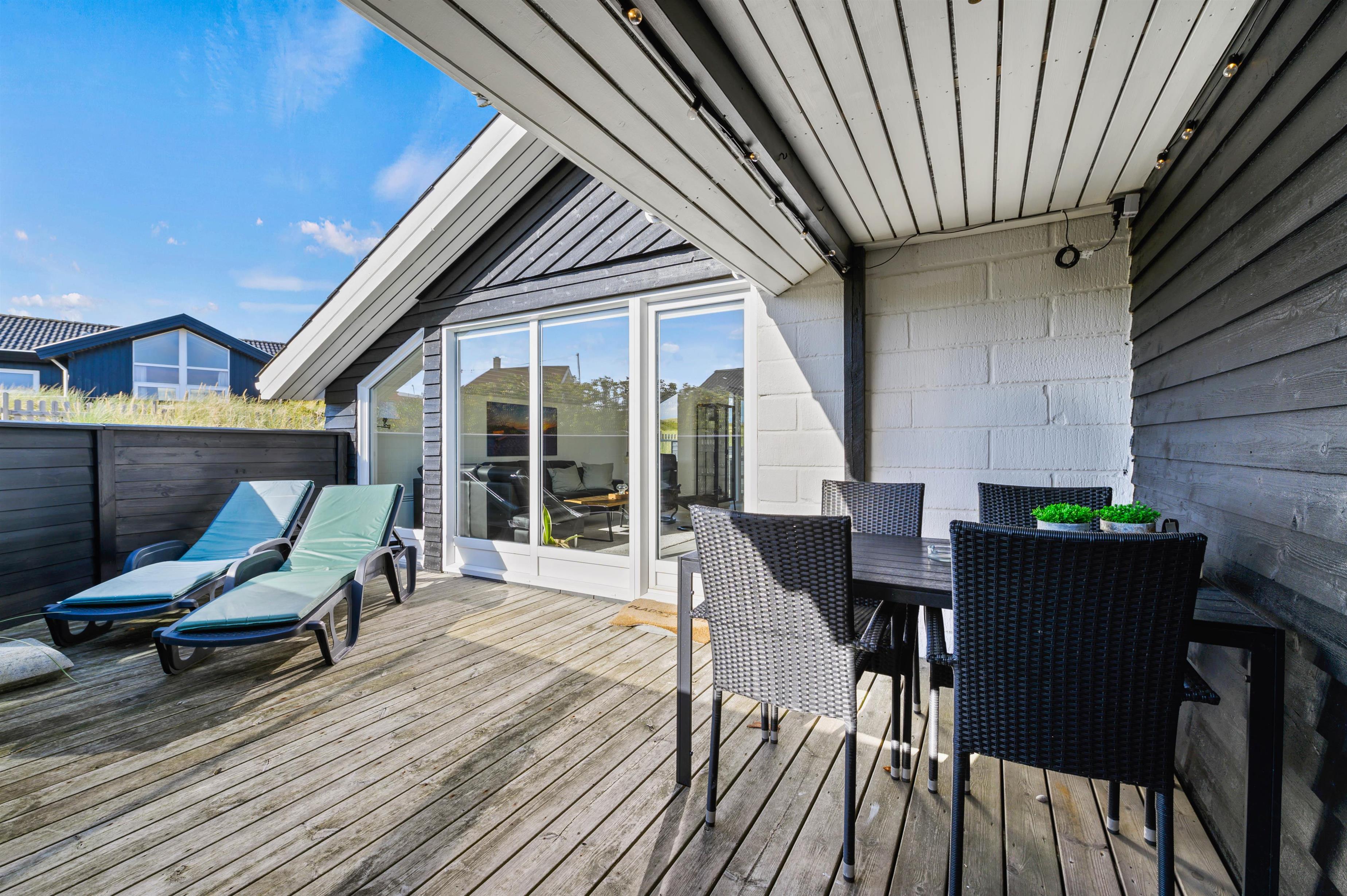 Sommerhuset har ikke mindre end 2 terrasser, så du altid kan finde et sted med læ og sol. På den lukket terrasse mod sydvest, kan du uforstyrret nyde den danske sommer med den salte havluft og høre den brusende lyd fra havets bølger. Her kan i også medbringe mindre børn eller jeres hund, som frit kan gå rundt, uden at de fare vild i området.