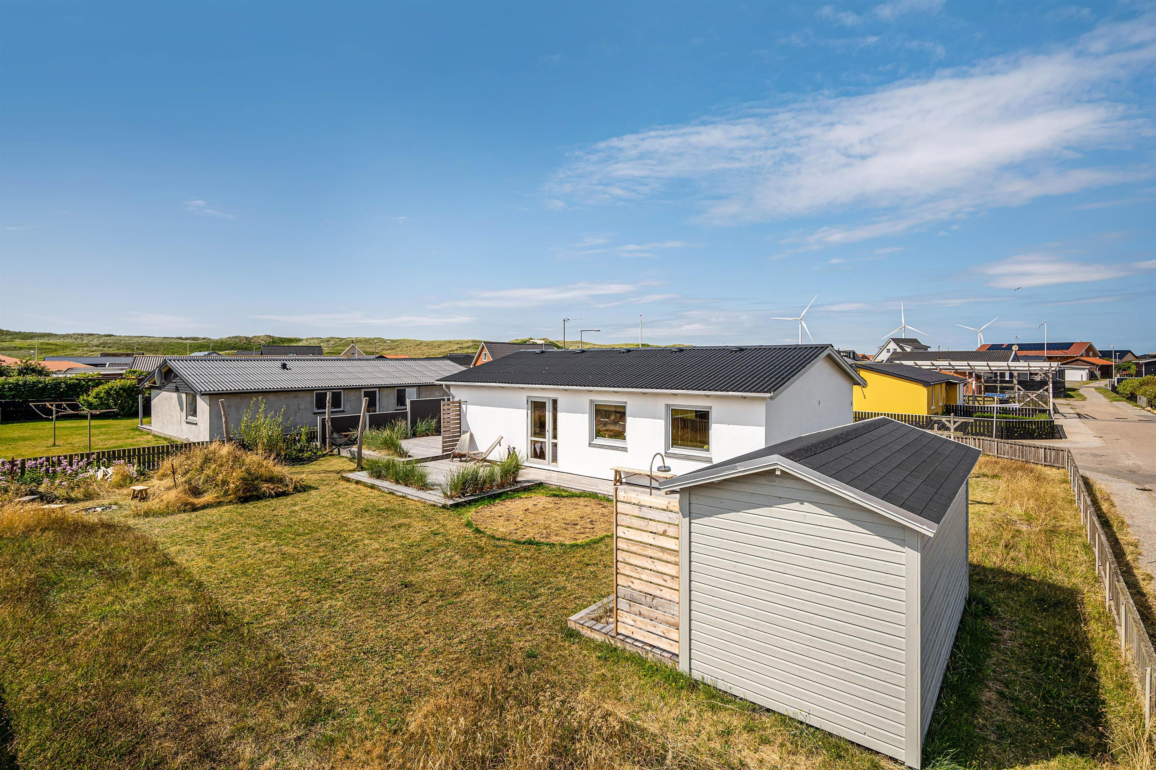Fra den hyggelige stue er der adgang til den store terrasse med flere flotte detaljer som de indbyggede plantebede med marehalm. Det giver et flot og enkelt indtryk uden at ødelægge udsigten til haven og klitterne i baggrunden. Terrassen er både åben og afskærmet, hvilket giver jer mulighed for at sidde i læ for vestenvinden, mens I nyder en lækker grillmiddag, og samtidig kan holde øje med børnene på trampolinen.