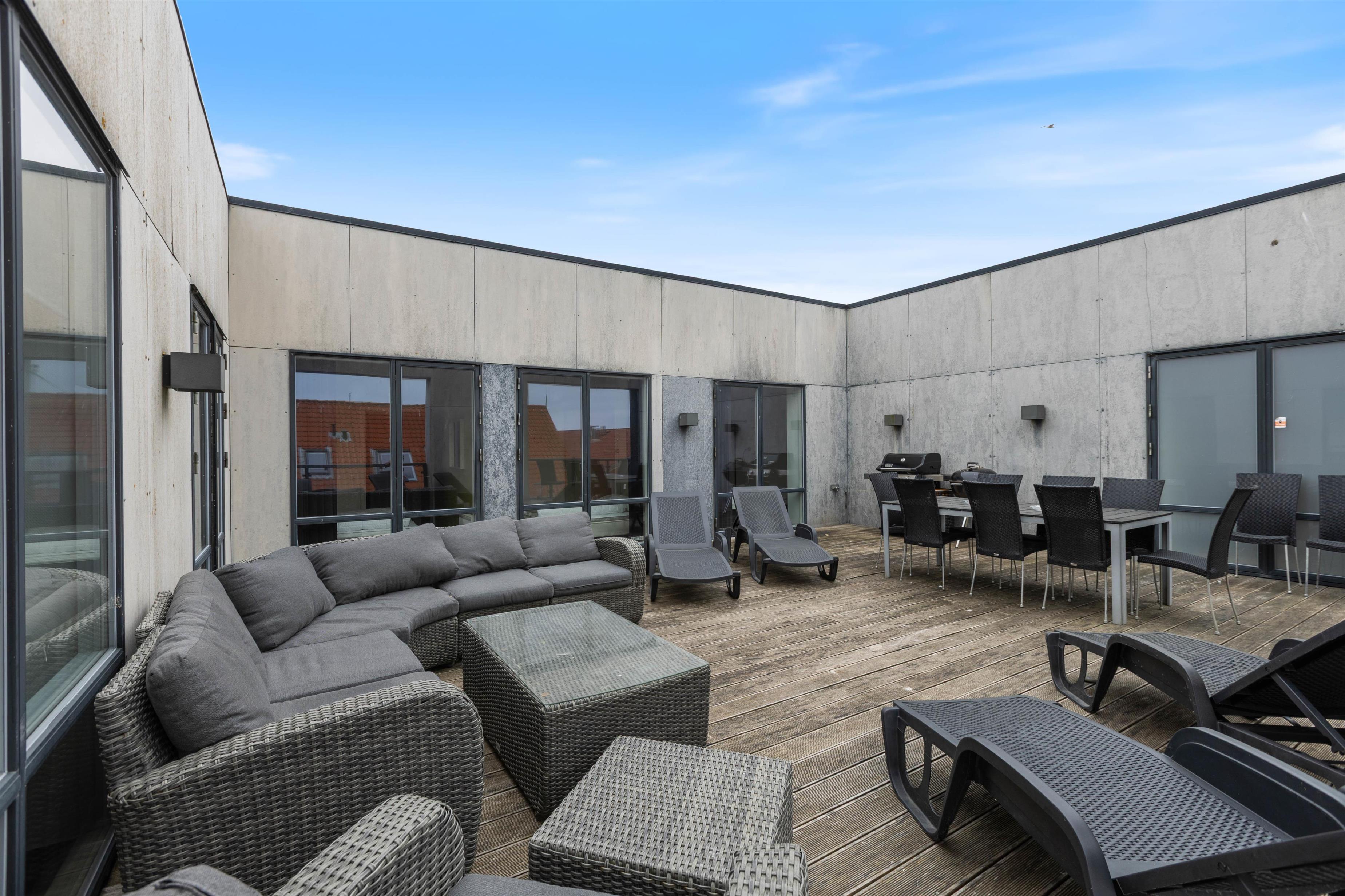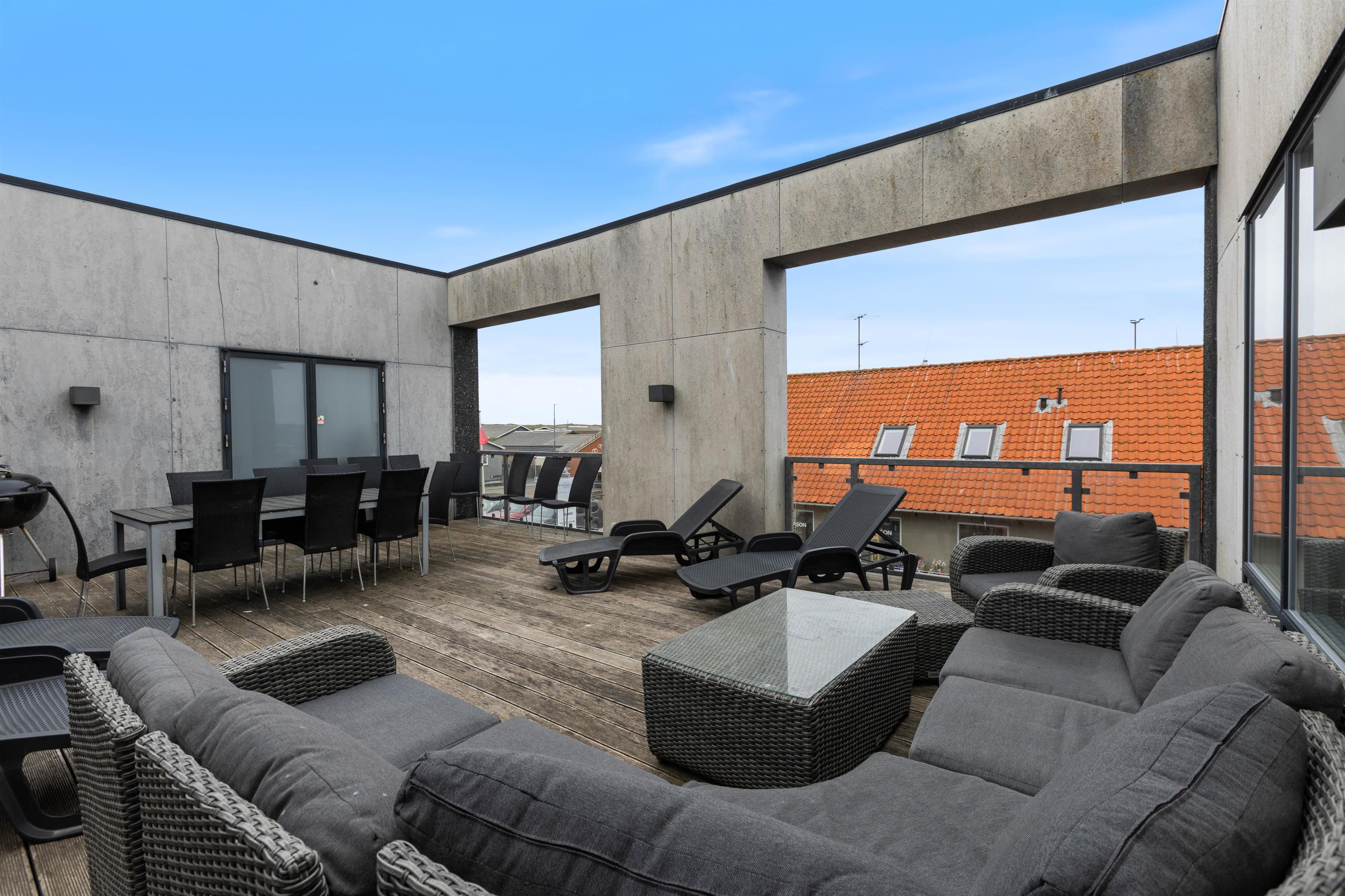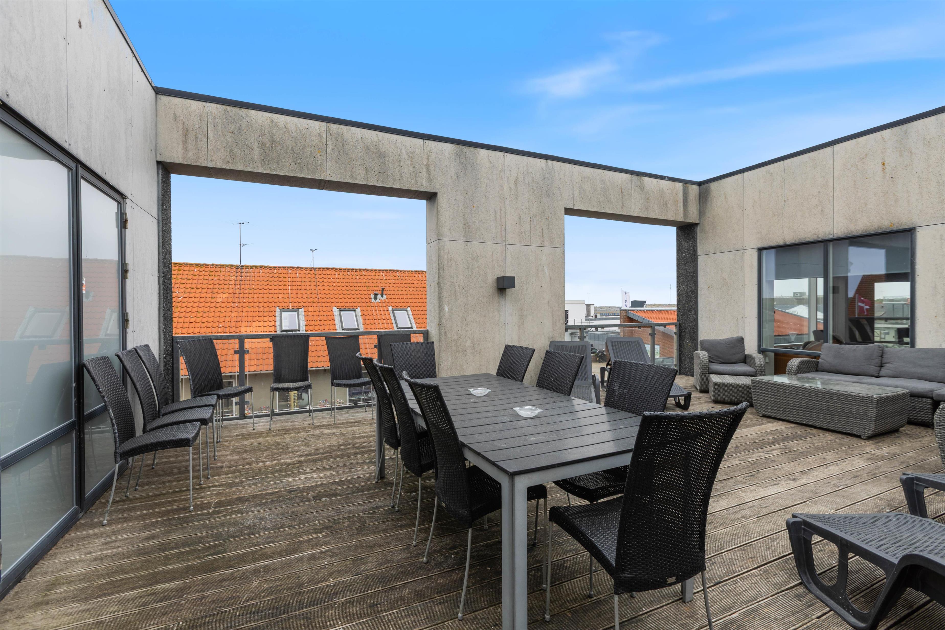 Bygningens arktitektur tager især hensyn til tagterrassen. Her er det nemlig altid muligt at finde en plads med læ, så du oftest kan sidde ude og nyde udsigten og den friske havluft. Og terrassen er også stor nok til, at mindre børn har plads til at lege ude.
