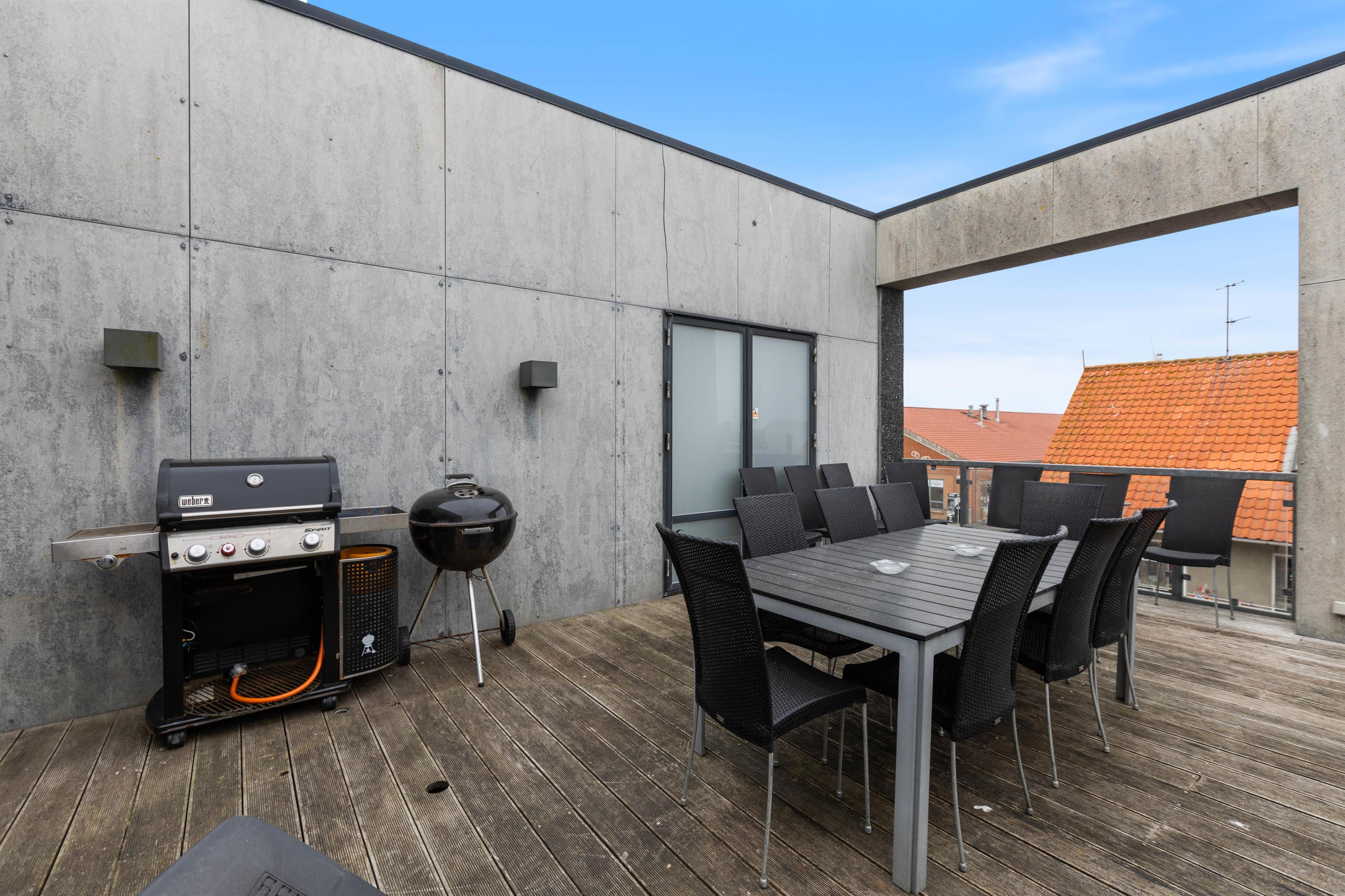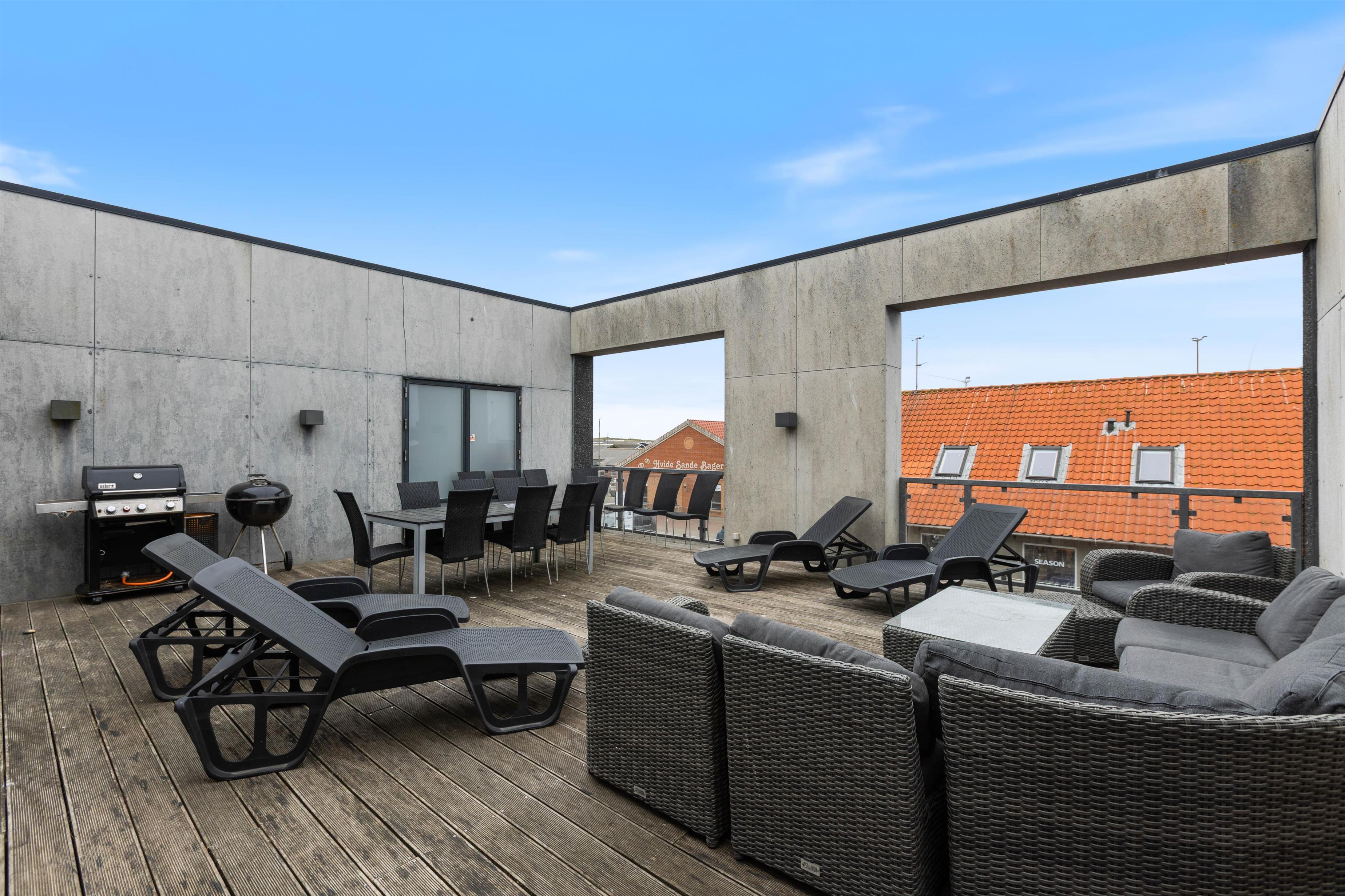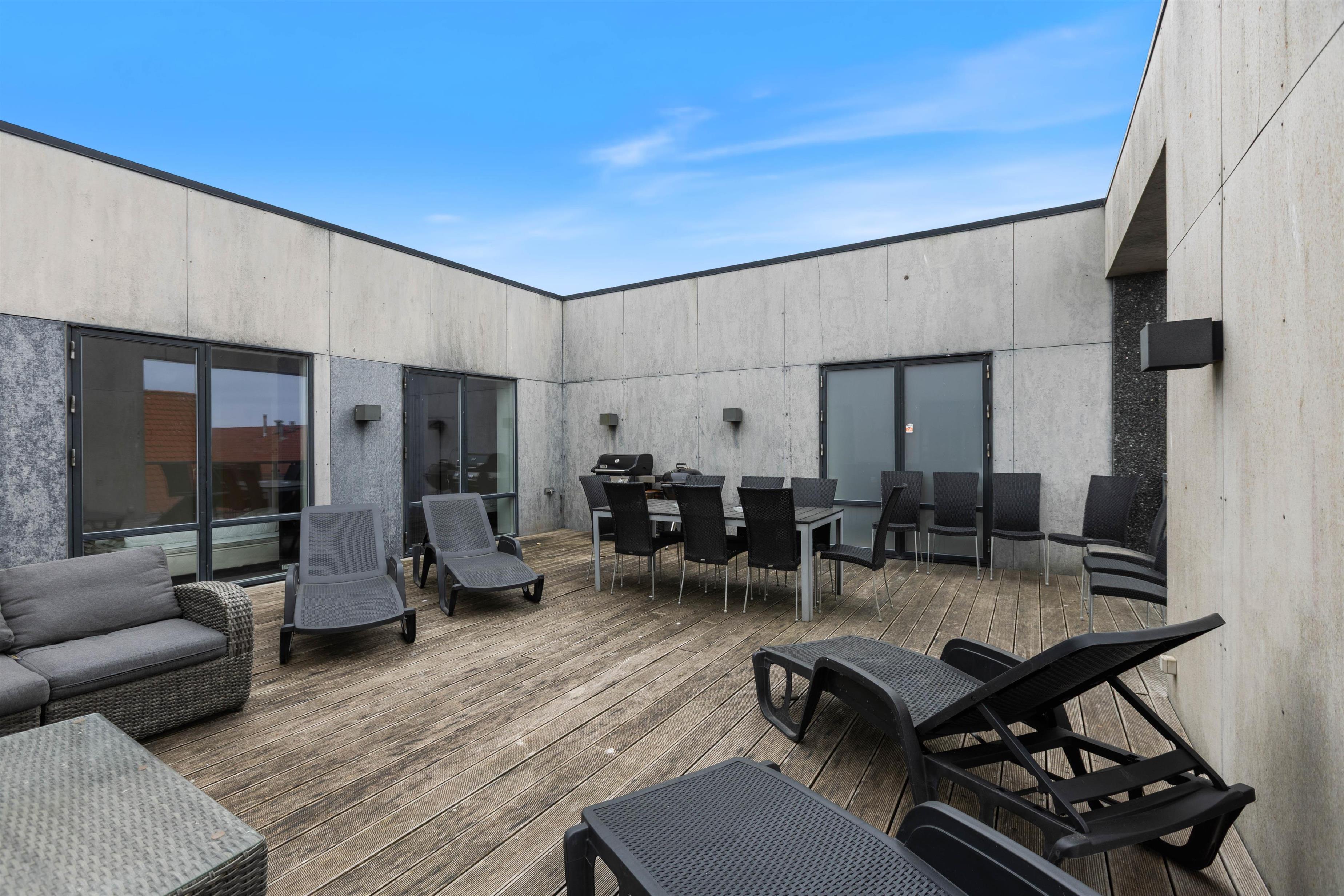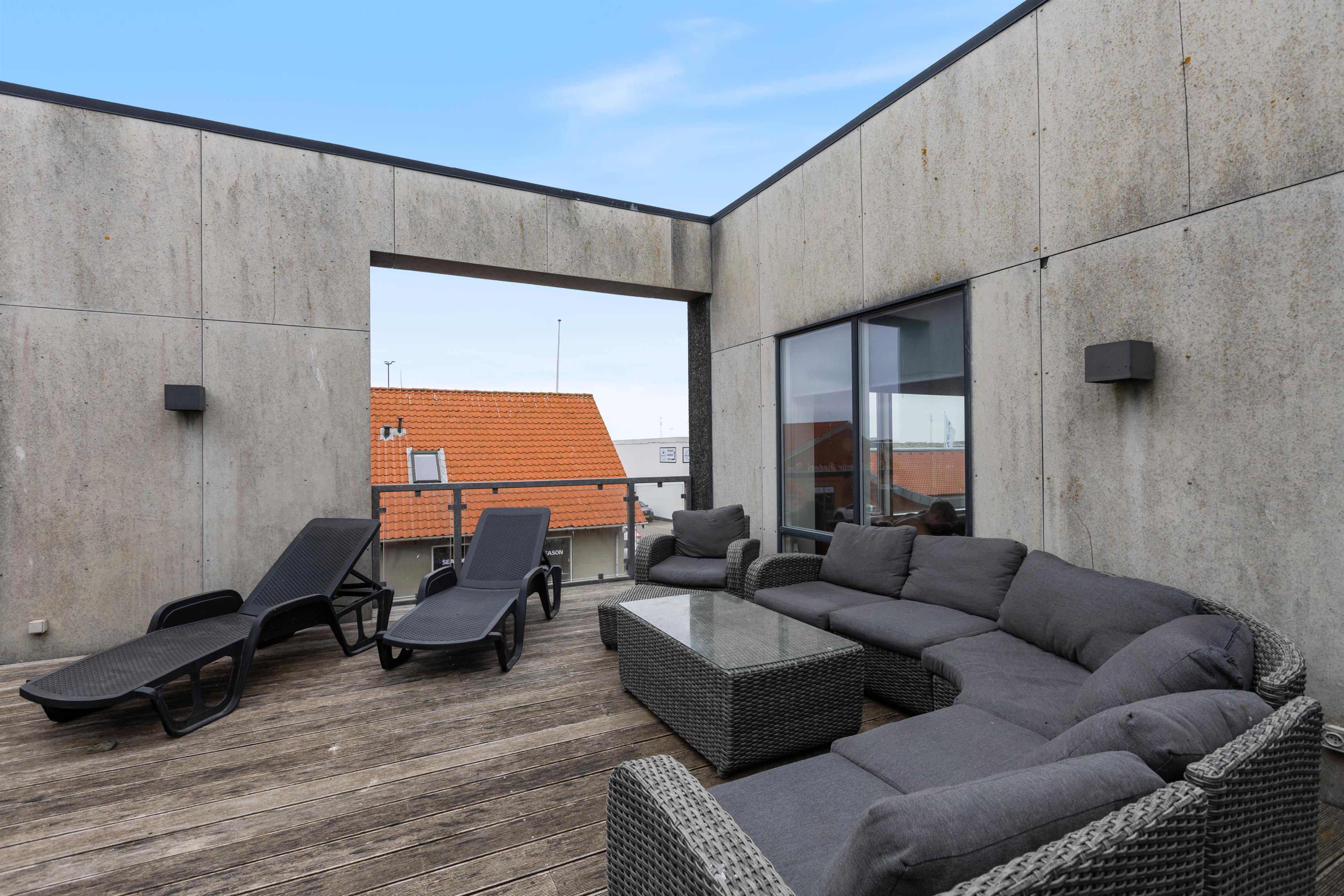 Bygningens arktitektur tager især hensyn til tagterrassen. Her er det nemlig altid muligt at finde en plads med læ, så du oftest kan sidde ude og nyde udsigten og den friske havluft. Og terrassen er også stor nok til, at mindre børn har plads til at lege ude.