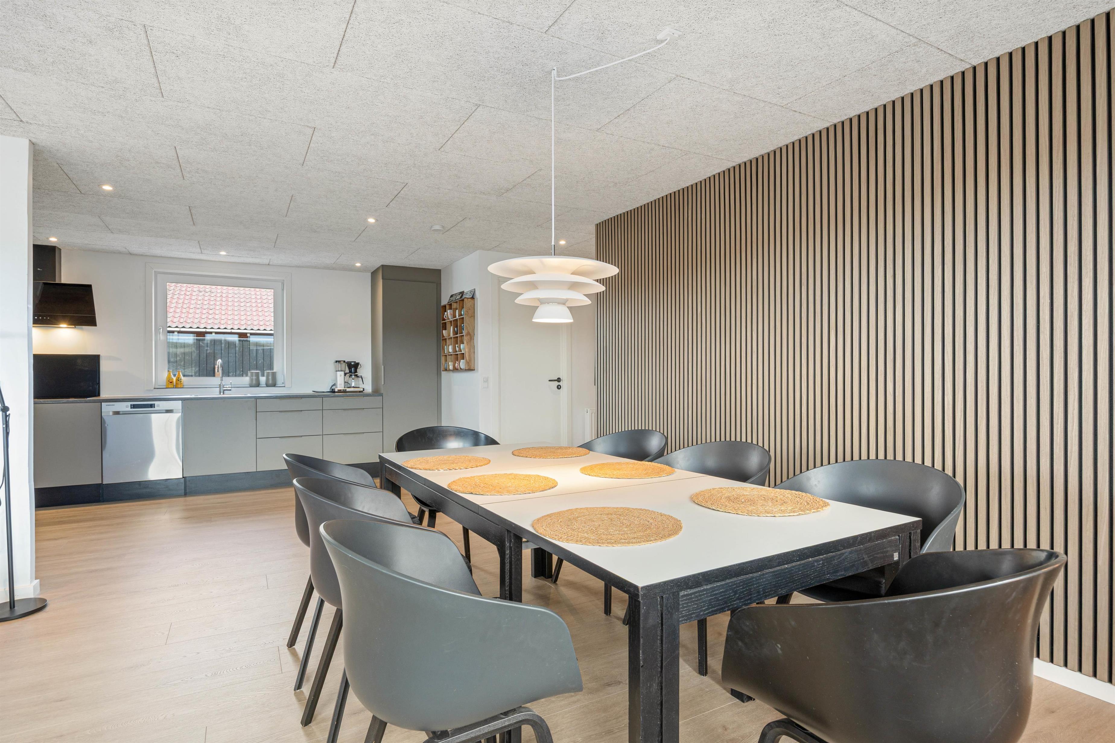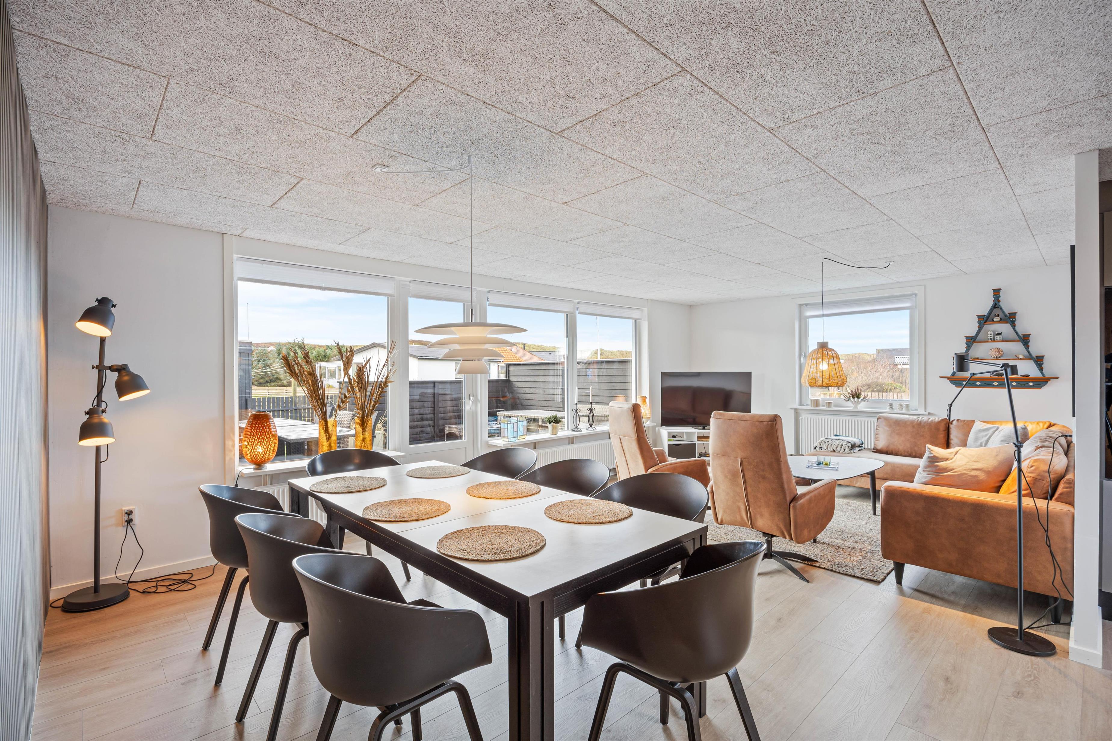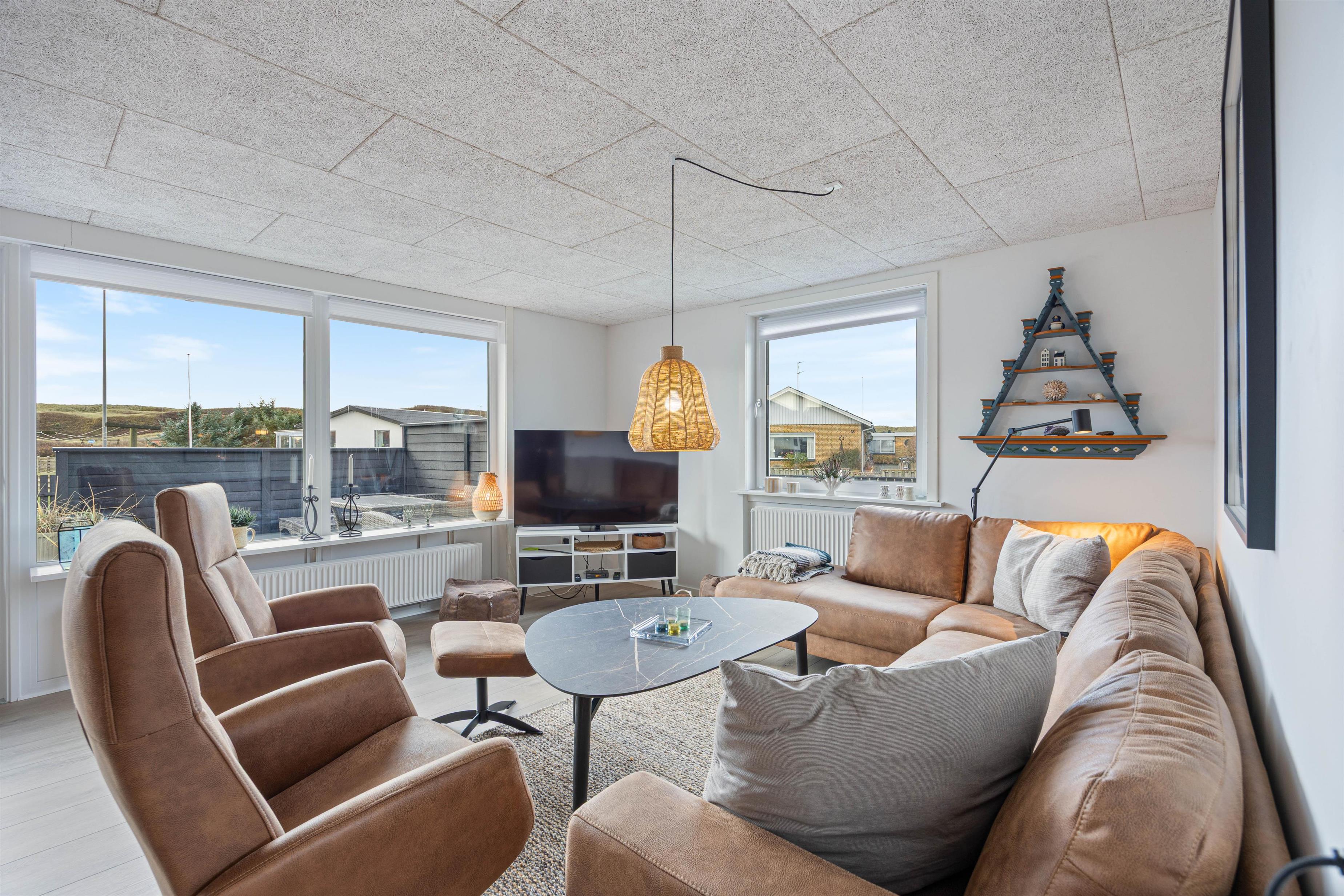 Feriehuset byder på et dejligt køkken, som er fuldt udstyret med både opvaskemaskine, ovn og mikroovn, så der er plads til fælles madlavning og hyggelige måltider. I stuen skaber de store vinduespartier et lyst og åbent rum - her kan I læne jer tilbage i sofaen og slappe af efter en dejlig dag ved stranden.