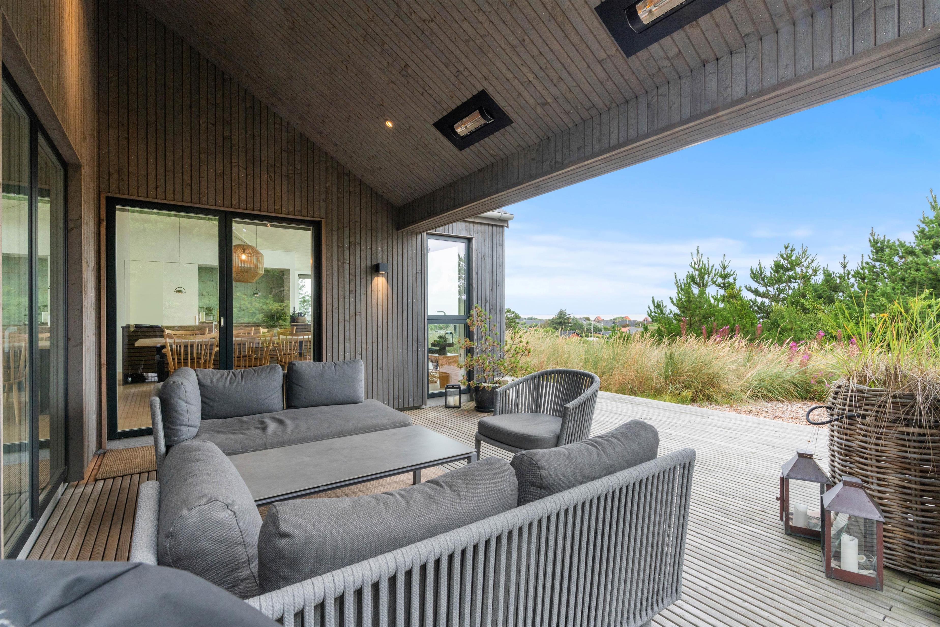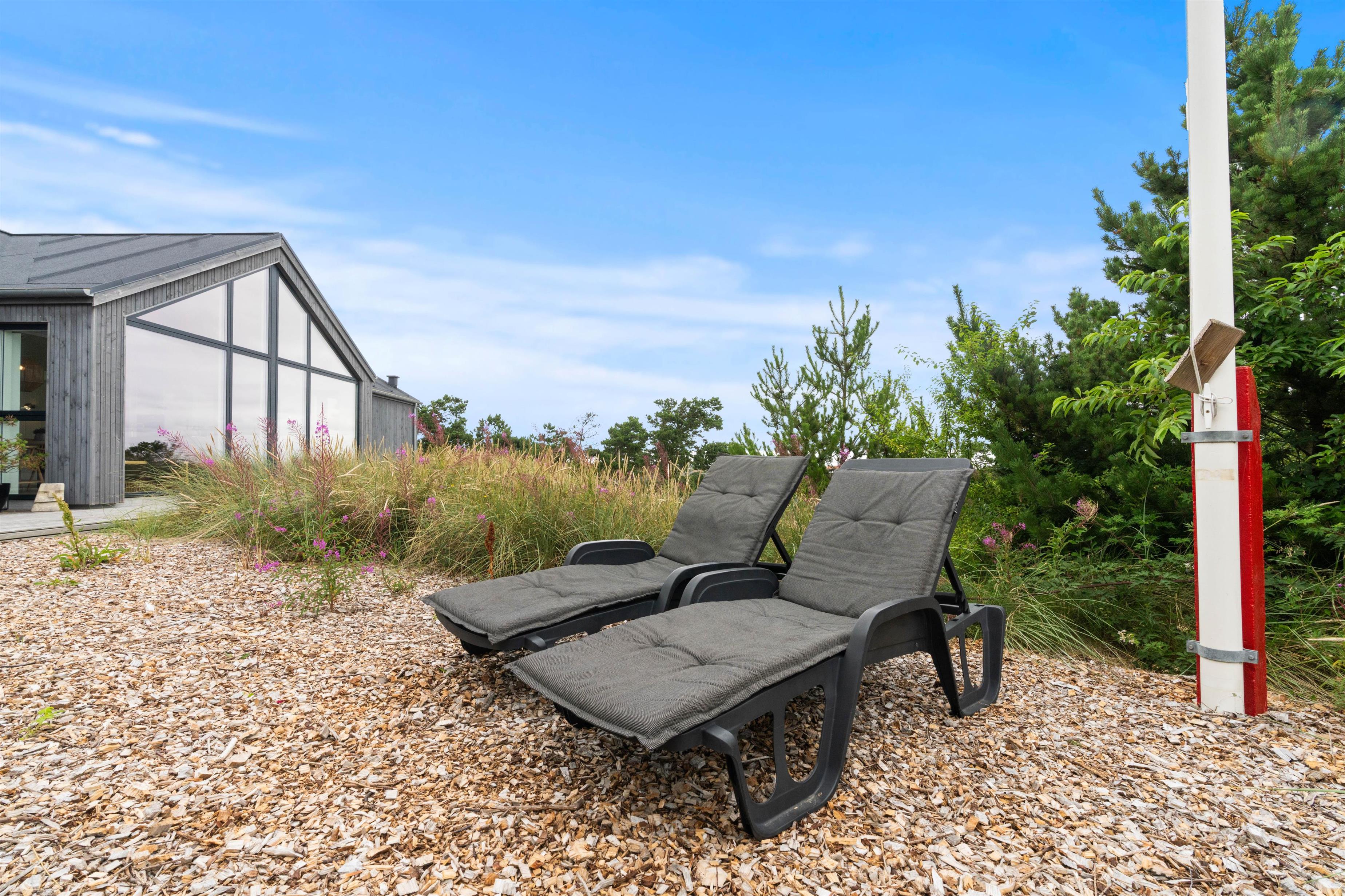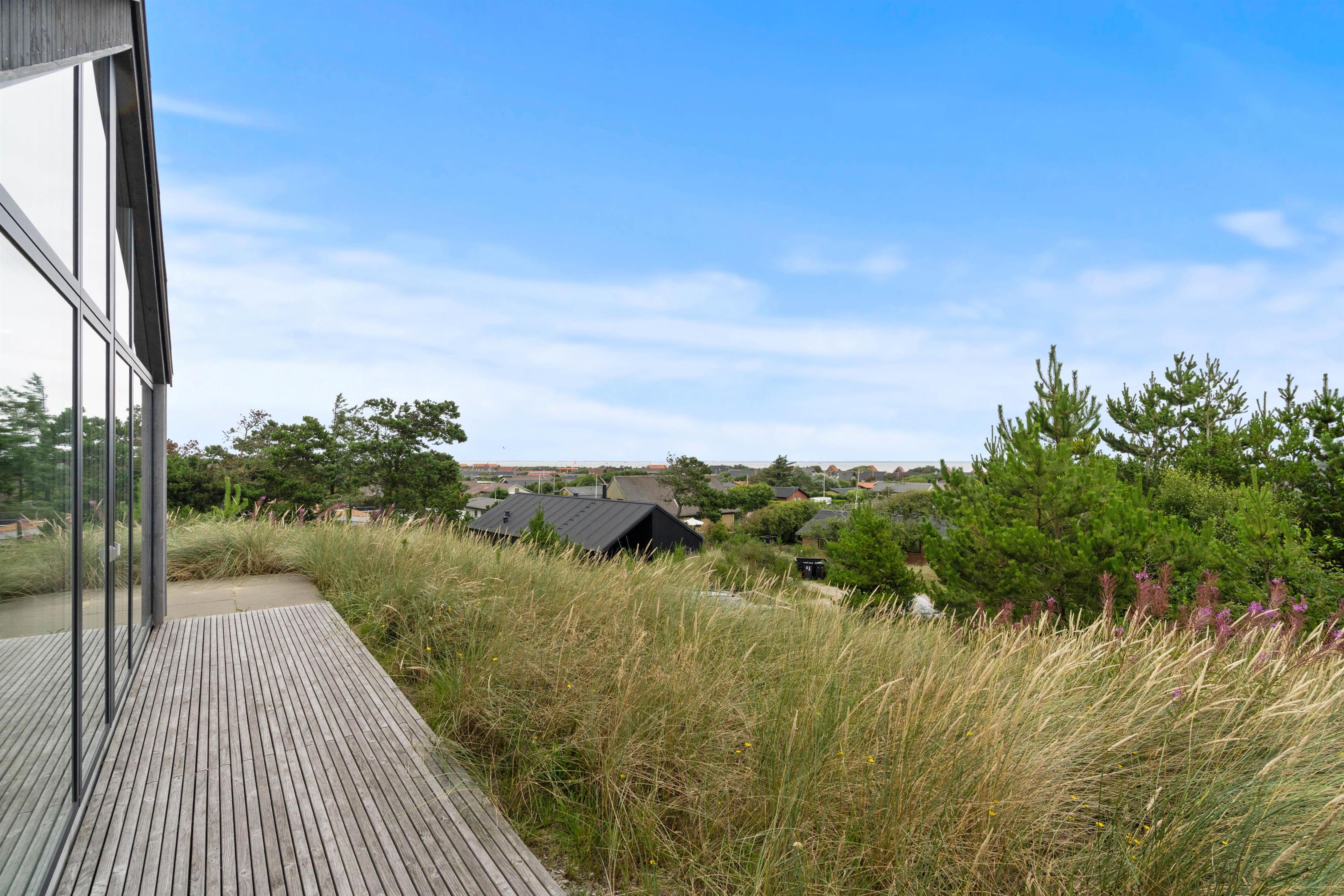 Her på klitten er der både læ- og sol-spots hele vejen rundt om huset, og I kan ugeneret nyde udelivet, selvom huset ligger på toppen af en klit. Her er dejlige terrasser – delvis overdækkede og åbne og med lækre lounge havemøbler, som virkelig indbyder til skønne aftner med blik over den travle fiskeri- og turistby – og den smukke Ringkøbing Fjord – Alt imens I har Vesterhavets brusen og salte duft i baggrunden.