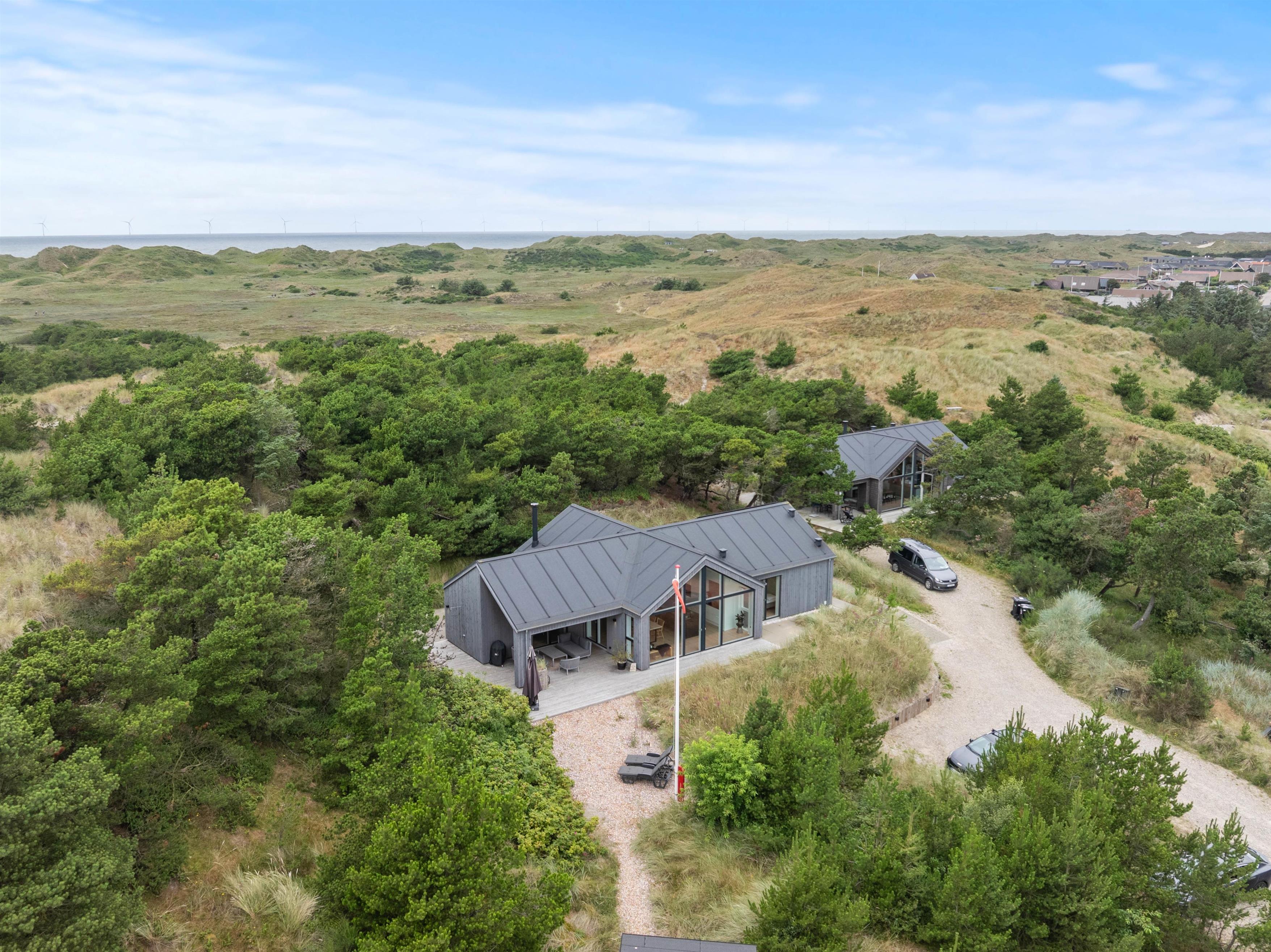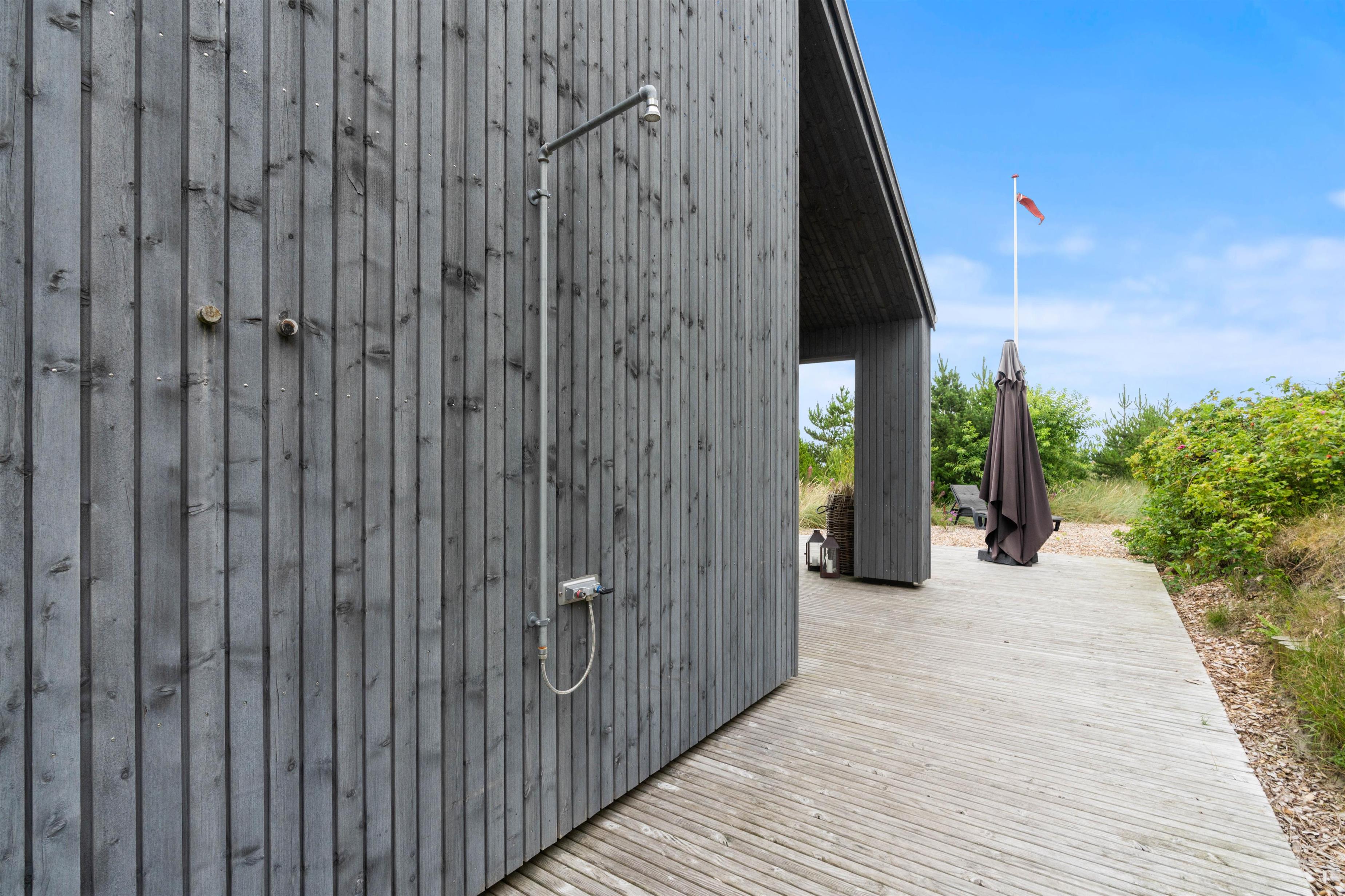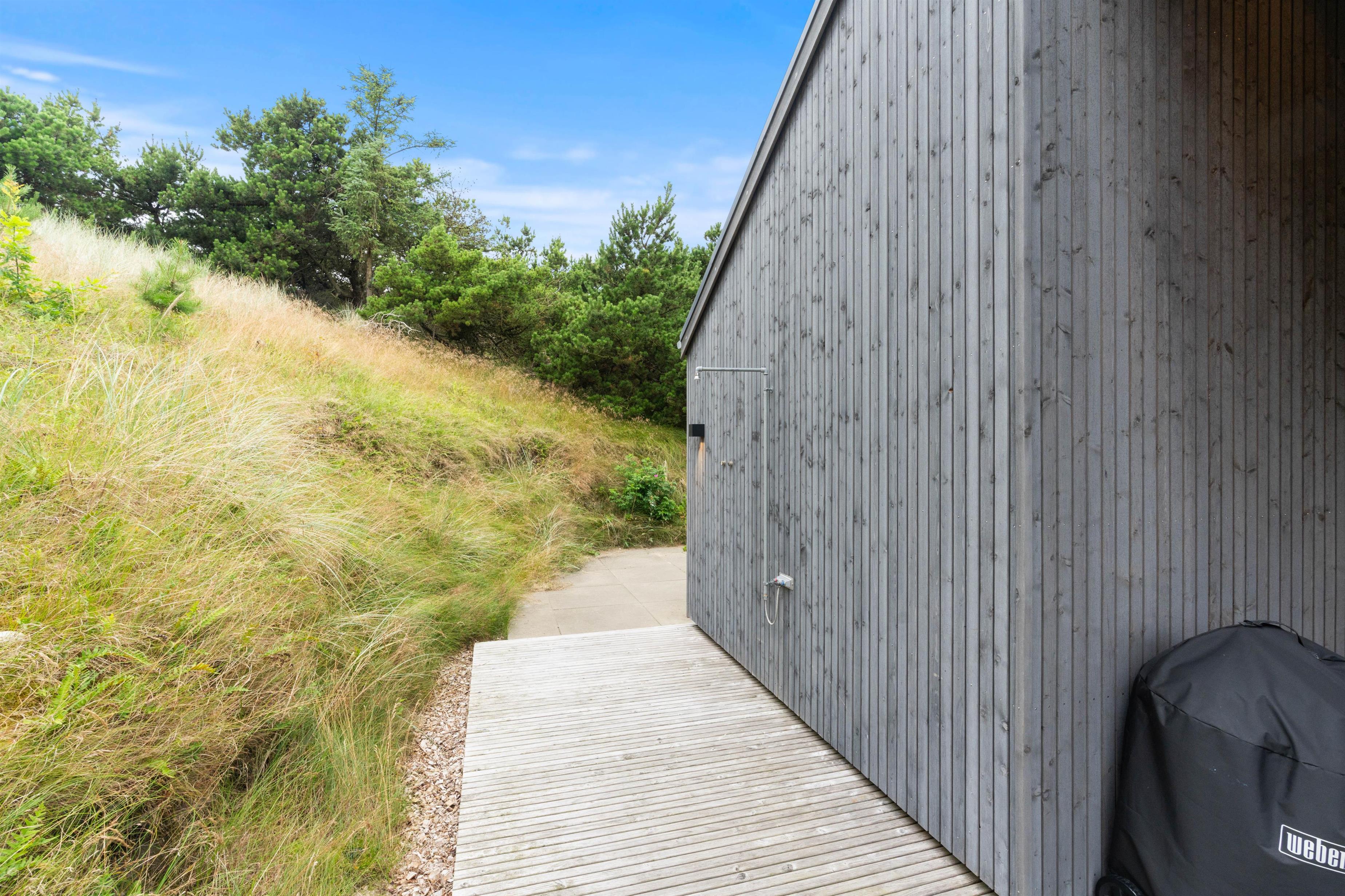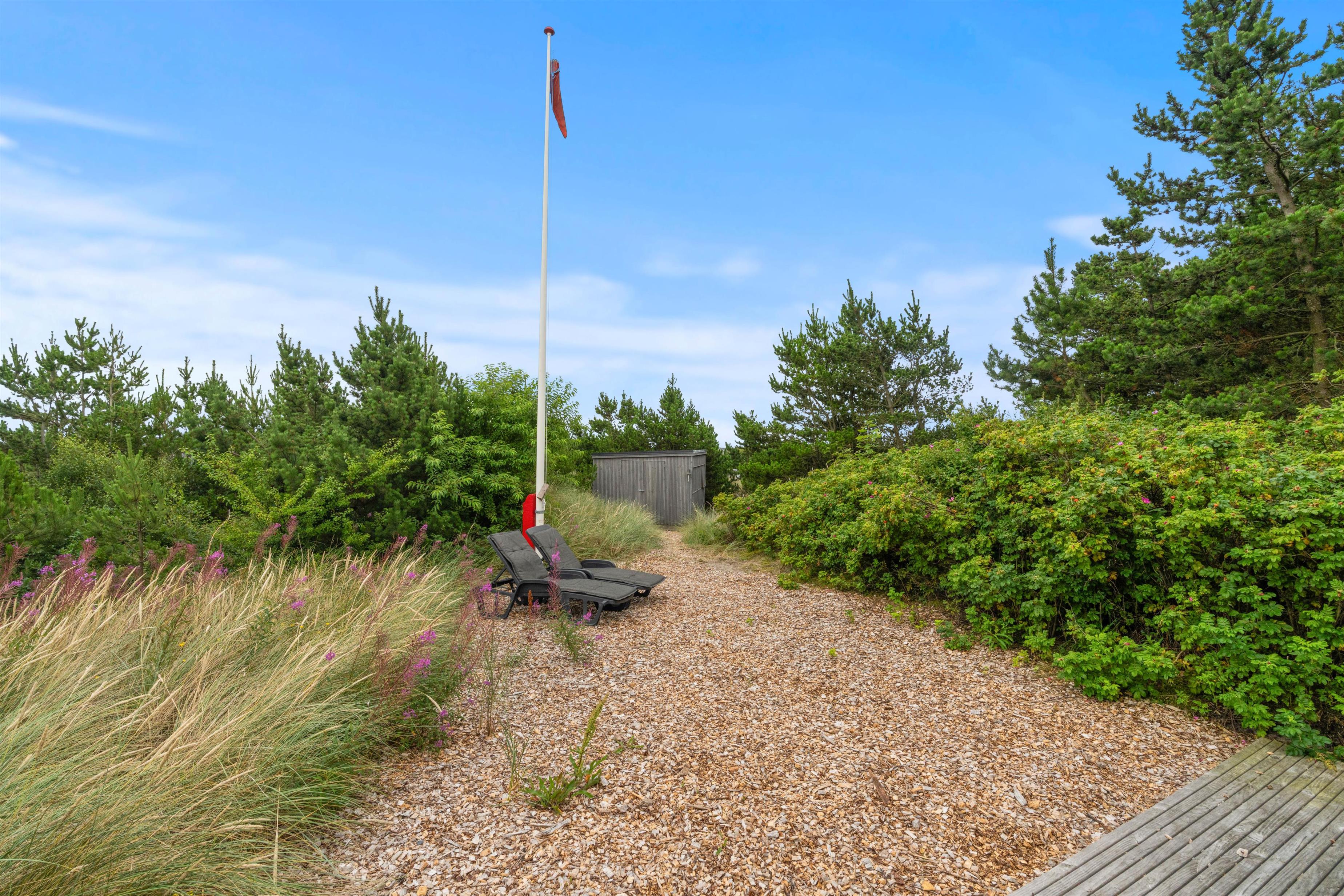 Her på klitten er der både læ- og sol-spots hele vejen rundt om huset, og I kan ugeneret nyde udelivet, selvom huset ligger på toppen af en klit. Her er dejlige terrasser – delvis overdækkede og åbne og med lækre lounge havemøbler, som virkelig indbyder til skønne aftner med blik over den travle fiskeri- og turistby – og den smukke Ringkøbing Fjord – Alt imens I har Vesterhavets brusen og salte duft i baggrunden.