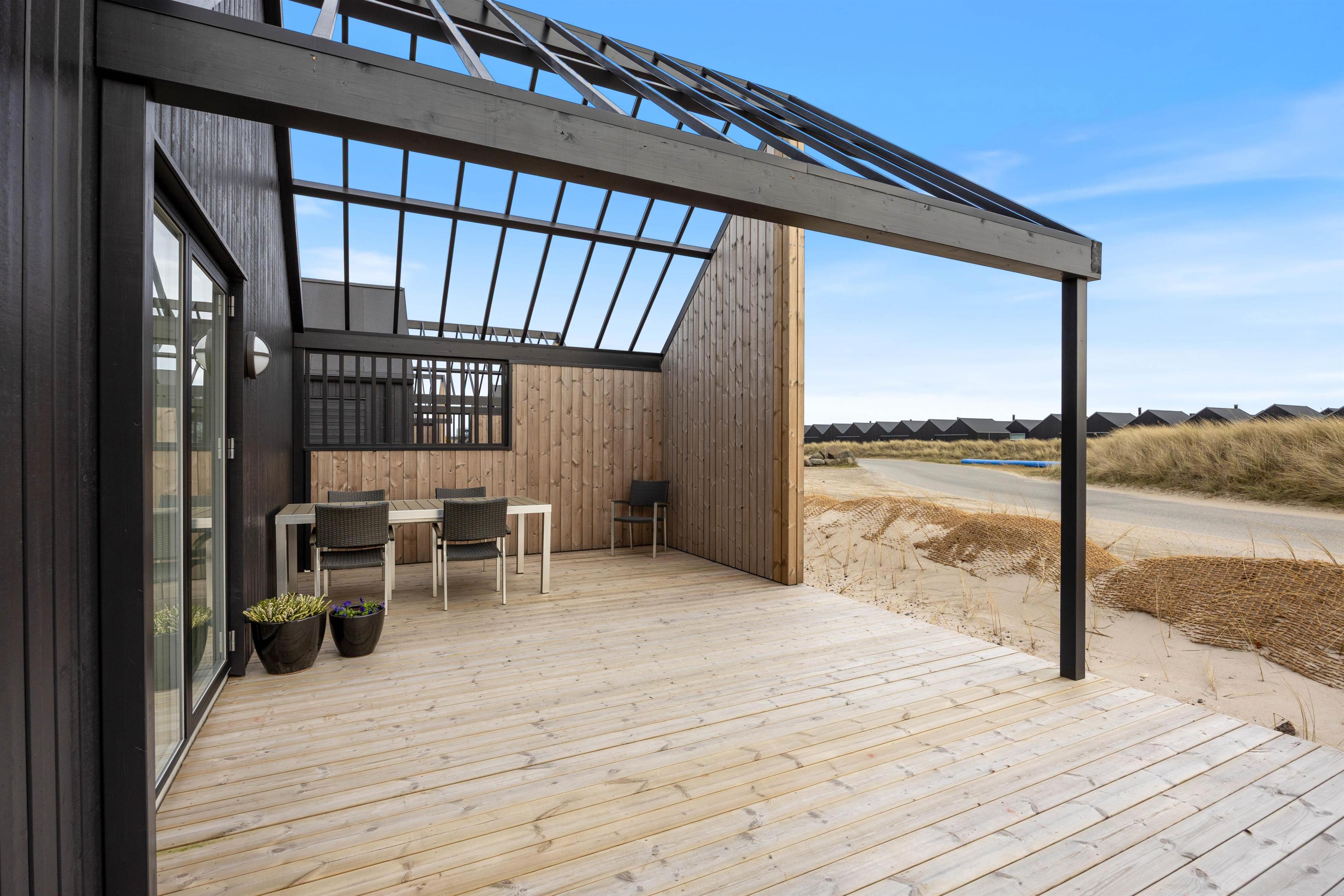 Fra køkkenet kan I træde direkte ud på den dejlige, delvist overdækkede terrasse. Her er der havemøbler og god plads til at nyde ferien under åben himmel, uanset om I vil læse en bog i solen, grille eller bare sidde og lytte til naturens lyde. Den afskærmede terrasse giver jer læ, så I kan nyde udelivet fra morgen til aften.