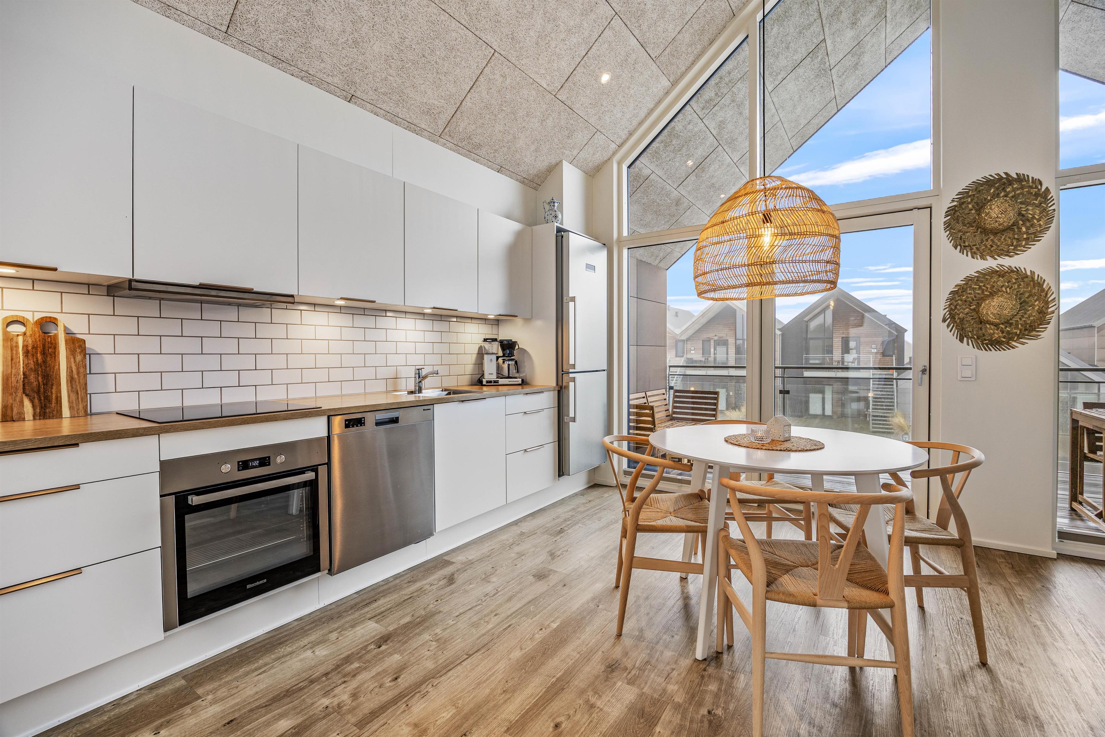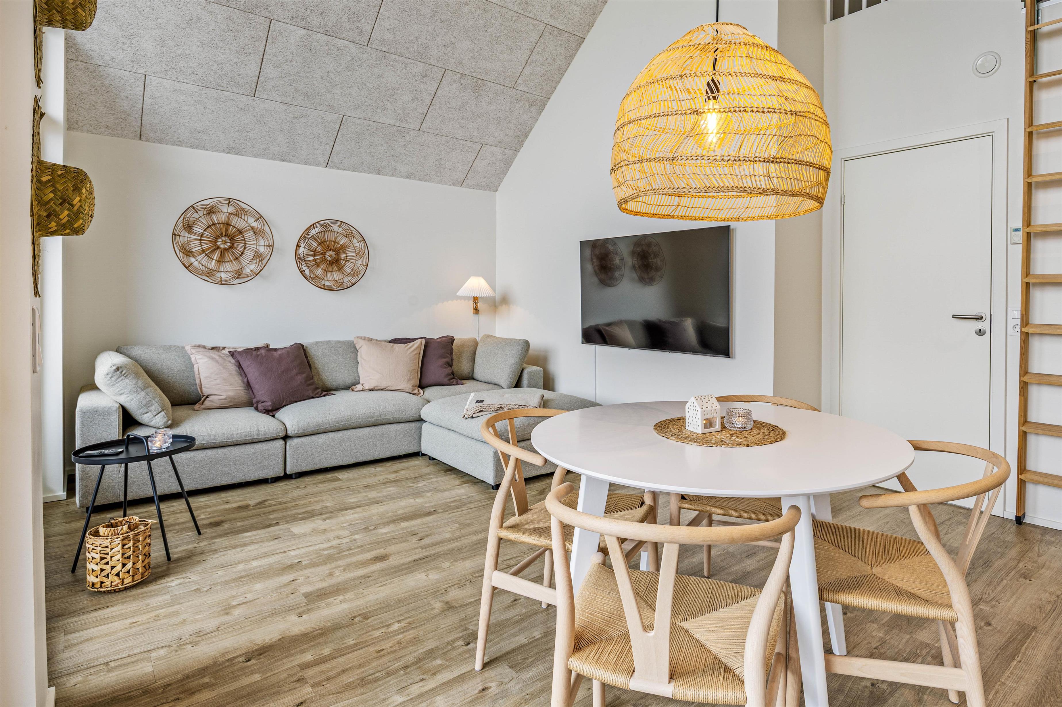 Indenfor bliver I mødt af et lyst og åbent opholdsrum med udsigt til den lille kanal. Her er der skabt en rolig og dejlig atmosfære med lyse materialer, højt til loftet og en hyggelig sofa, hvor I kan slappe af efter en dejlig dag. Køkkenet er integreret i opholdsrummet og er udstyret med blandt andet opvaskemaskine, så I nemt kan klare de praktiske opgaver.