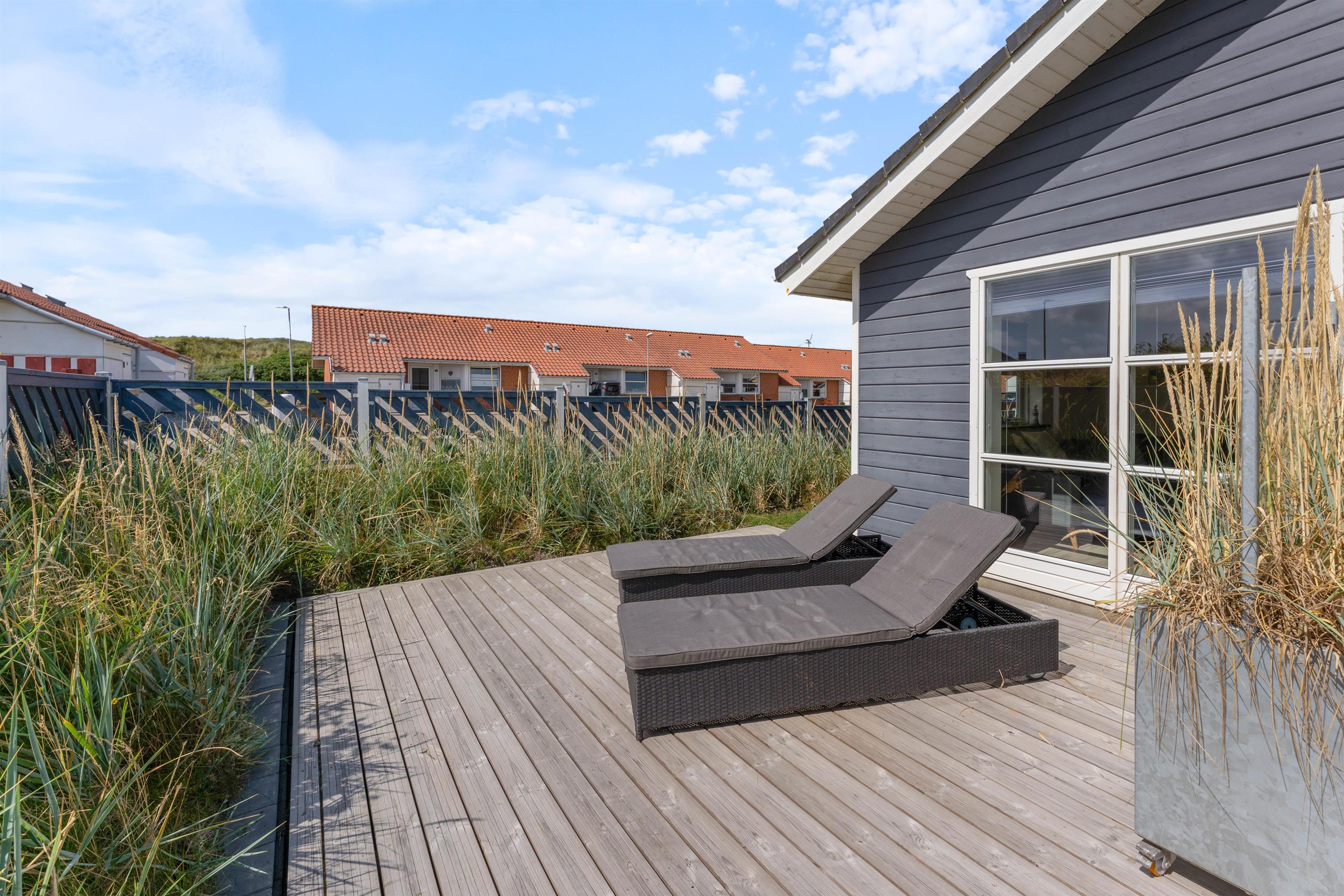 Sommerhusets sydvendte terrasse indbyder til mange hyggelige stunder med familien. Her kan I nyde en varm sommerdag med en god bog og slutte af med et lækkert grillmåltid, mens solen går ned i baggrunden. Terrassen er delvist afskærmet, så I kan sidde i læ for vinden. Imens I slapper af på terrassen, kan hunden løbe frit rundt i den lukkede have.