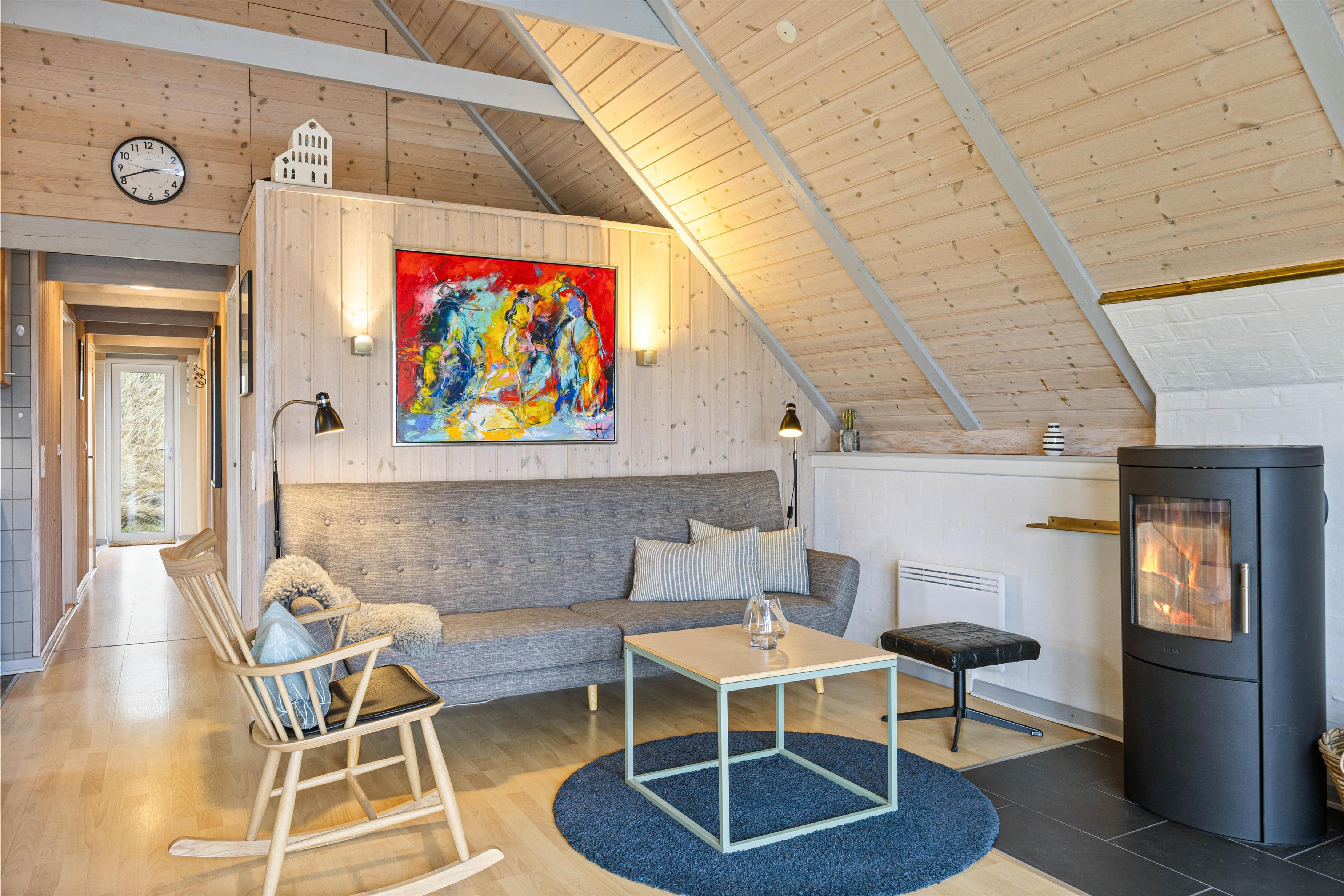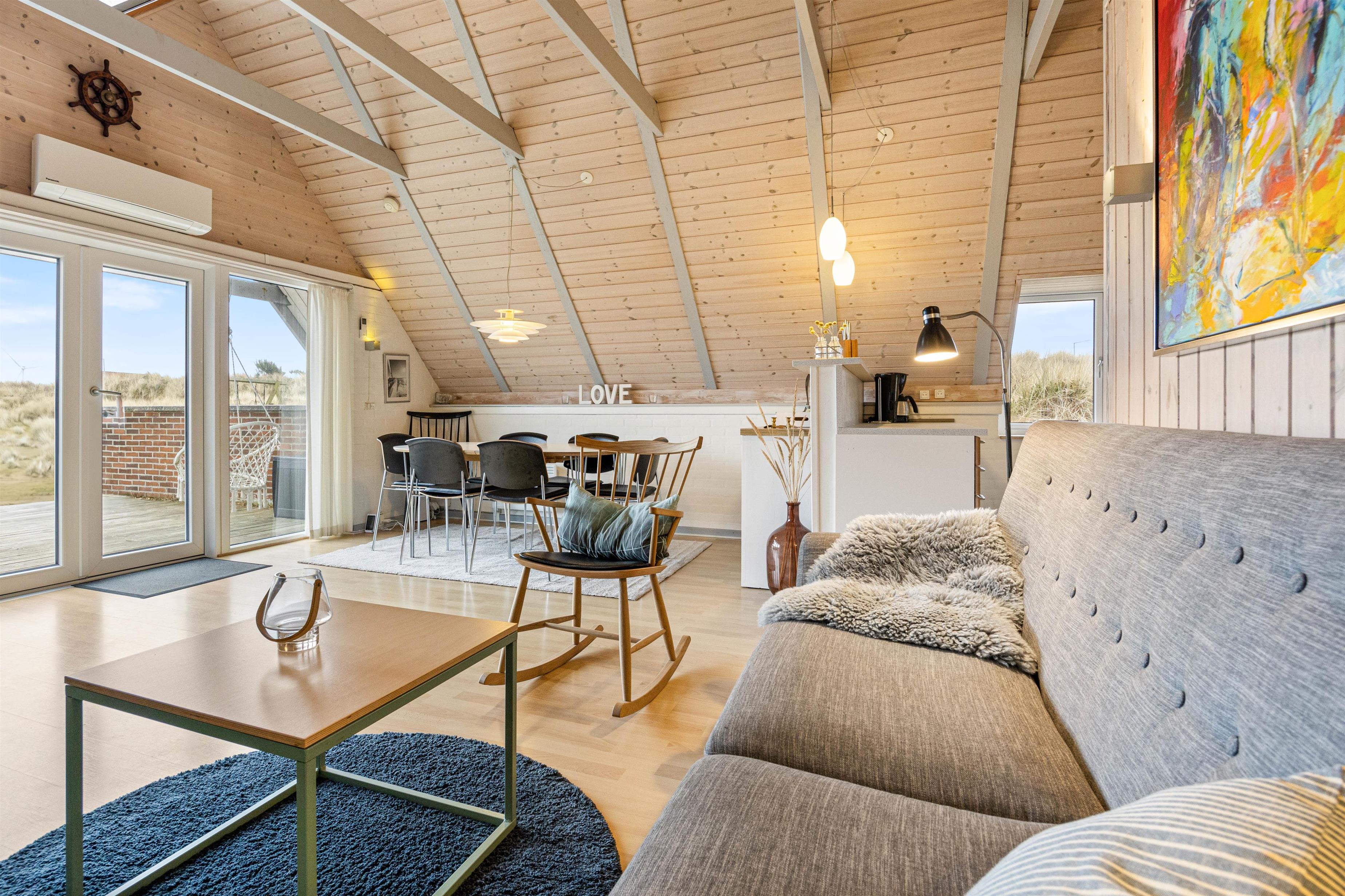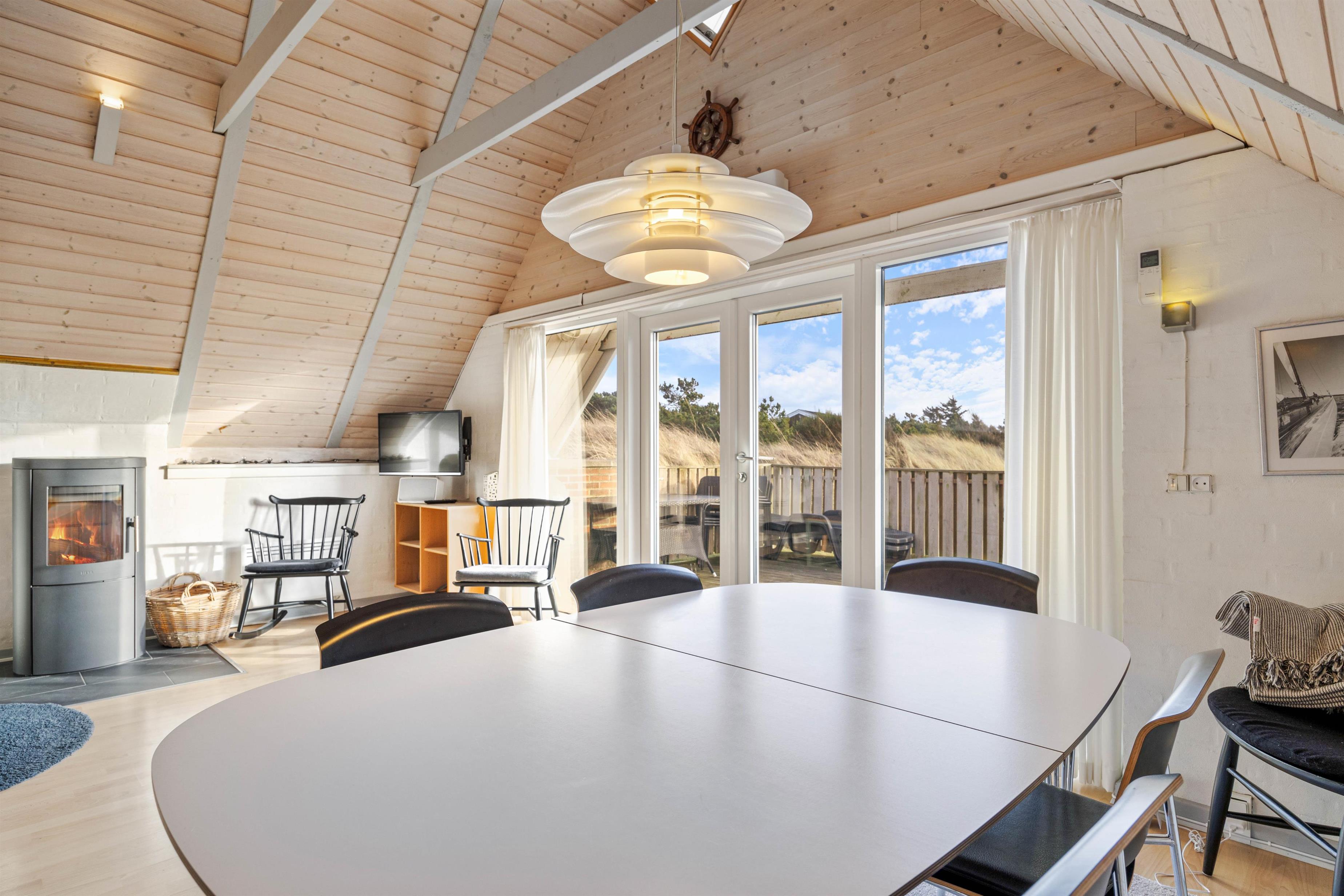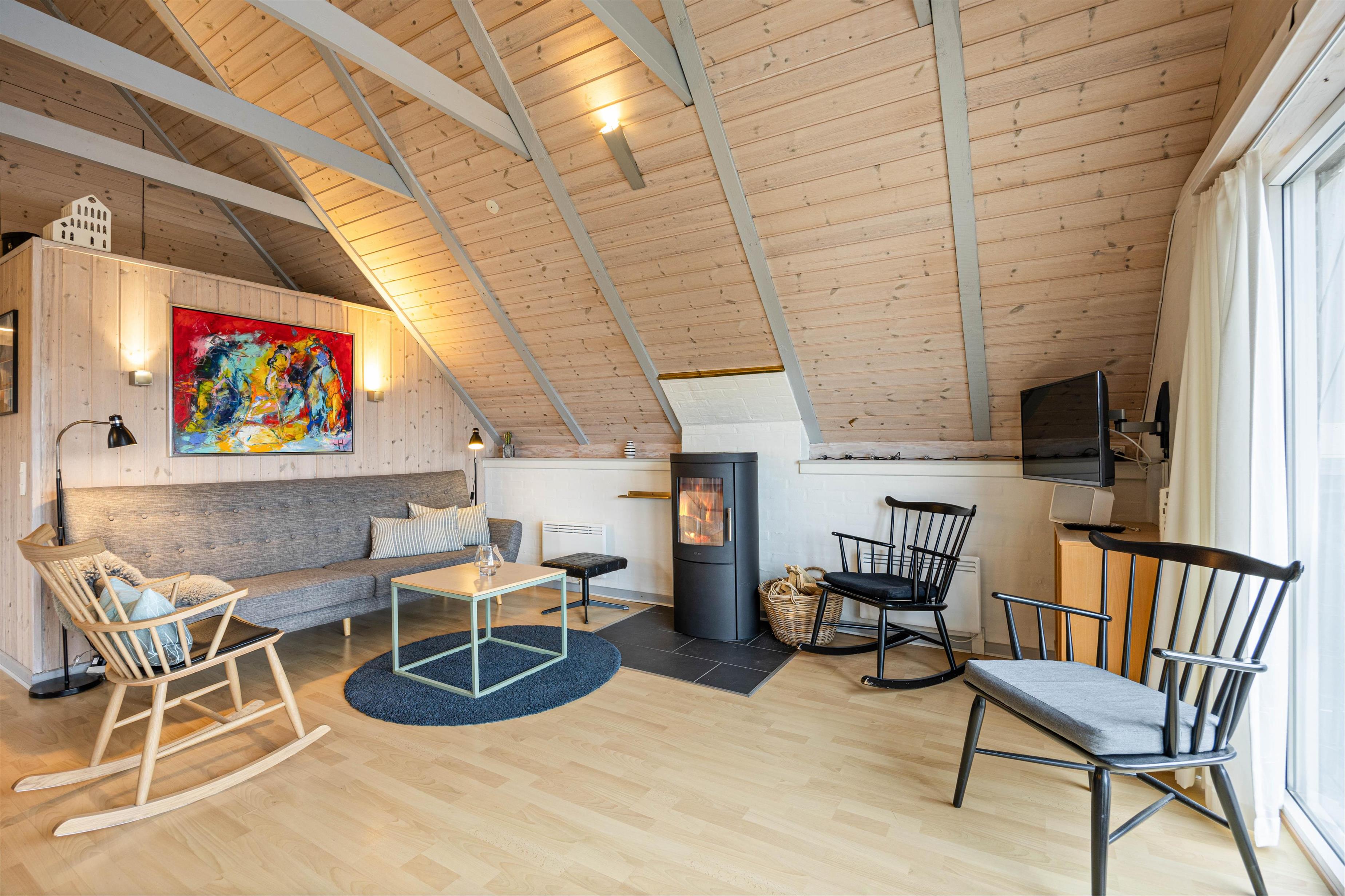 Samlingspunktet bliver det hyggelige og rummelige alrum, med loft til kip. Her er køkkenet, stuen og spisestuen er i åben forbindelse, så der er mulighed for at nyde tiden med hinanden, selvom der både ses tv, spilles brætspil og laves mad. Rummet kan I med fordel varme op med den energibesparende varmepumpe eller tænde op i brændeovnen, der især er skøn på de køligere dage. Fra stuen kan I også slå dørene op ud til den solskinsrige terrasse.