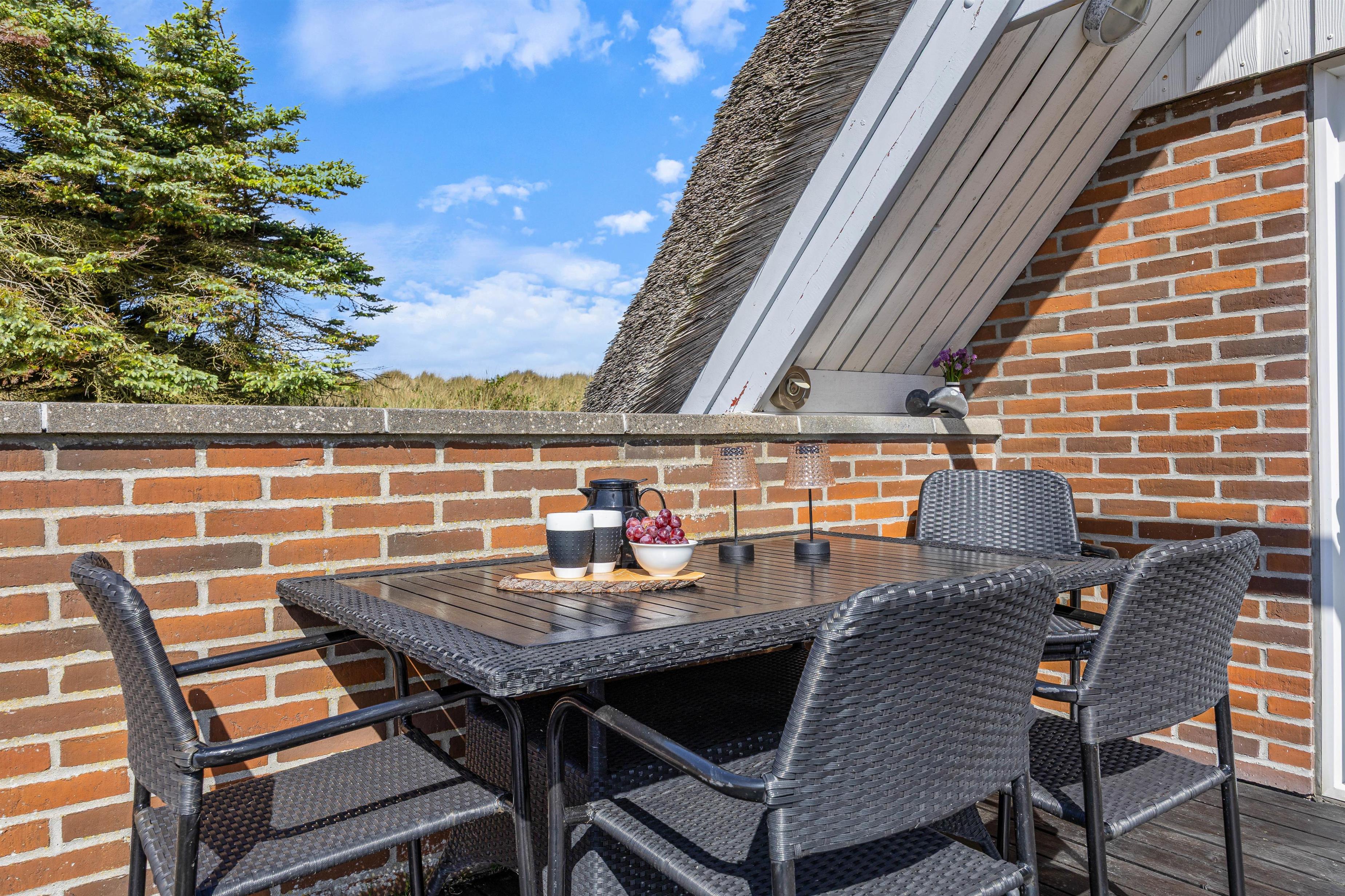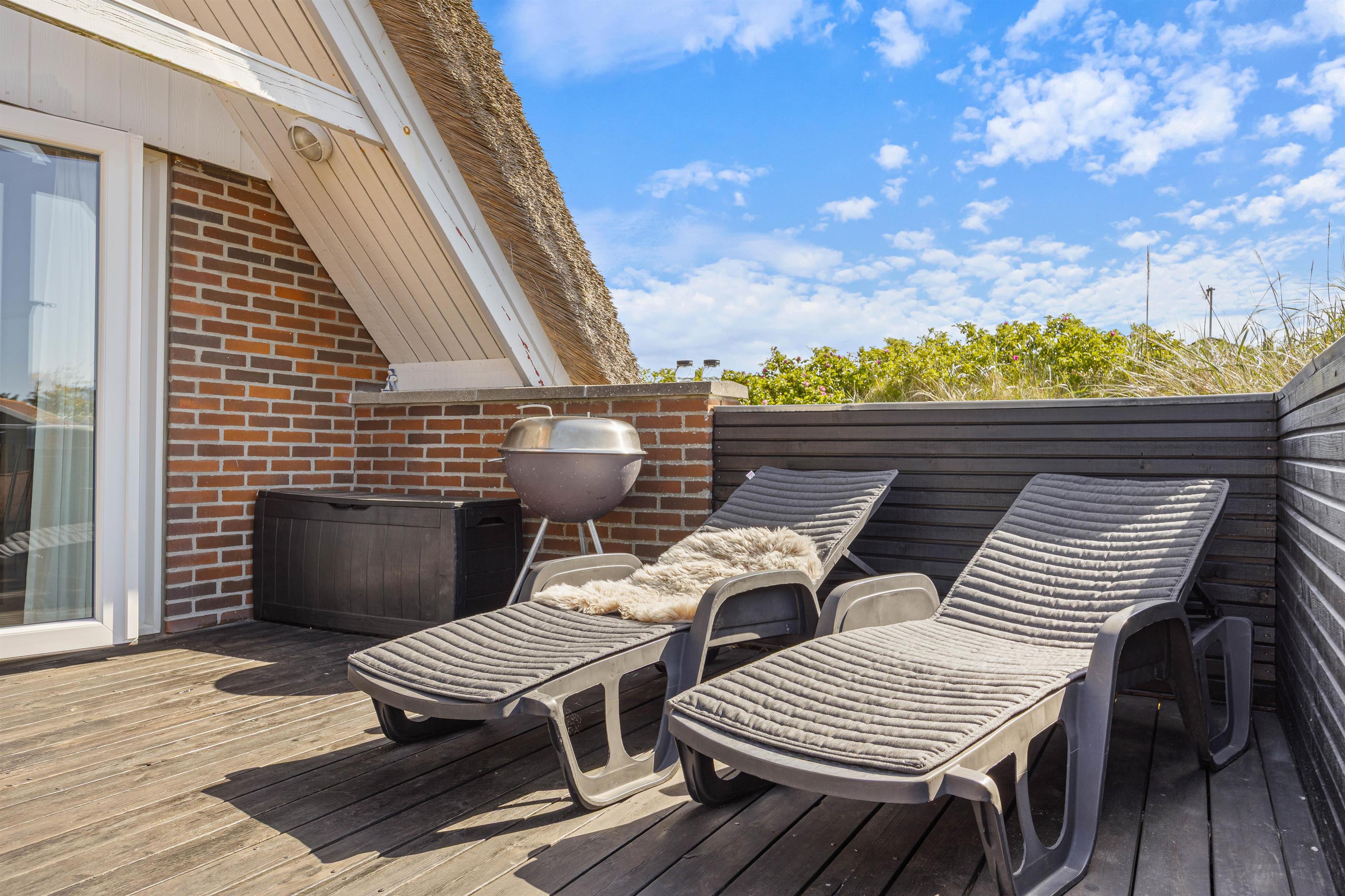 Fra stuen er der udgang til den dejlige afskærmede terrasse, perfekt til de gode solskinsdage. Her er der både havemøbler og liggestole, så bekvemt kan sidde og fordybe dig i en god bog. Og om aftenen kan du tænde op i grillen og tilberede et lækkert måltid sammen med familien.
