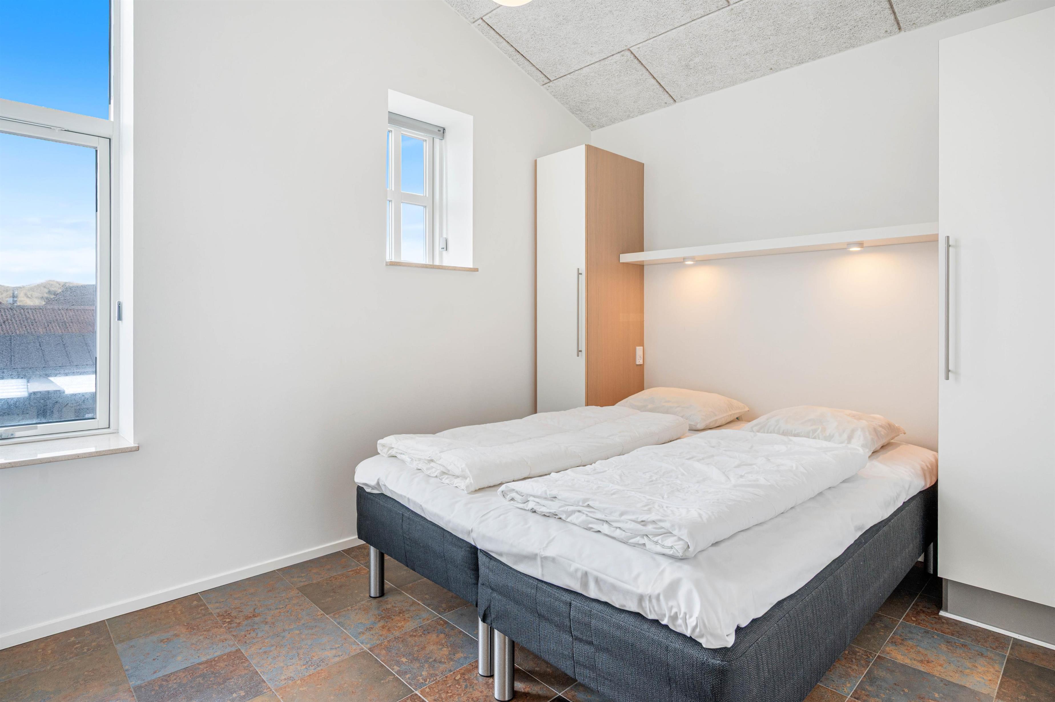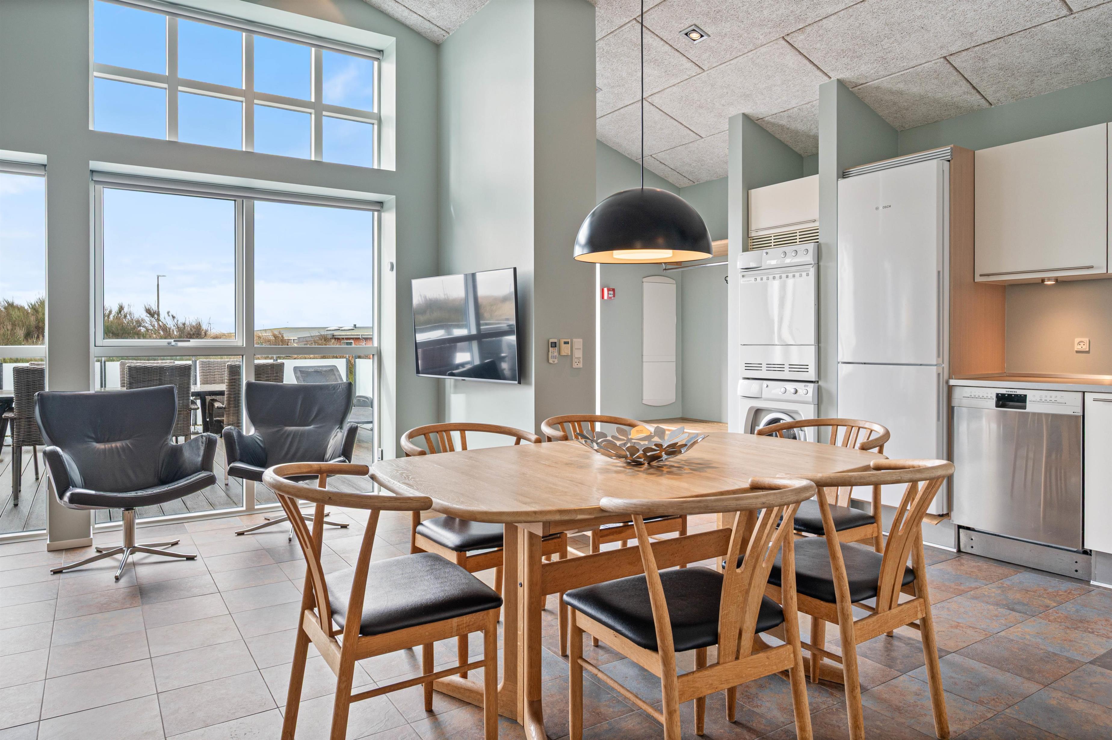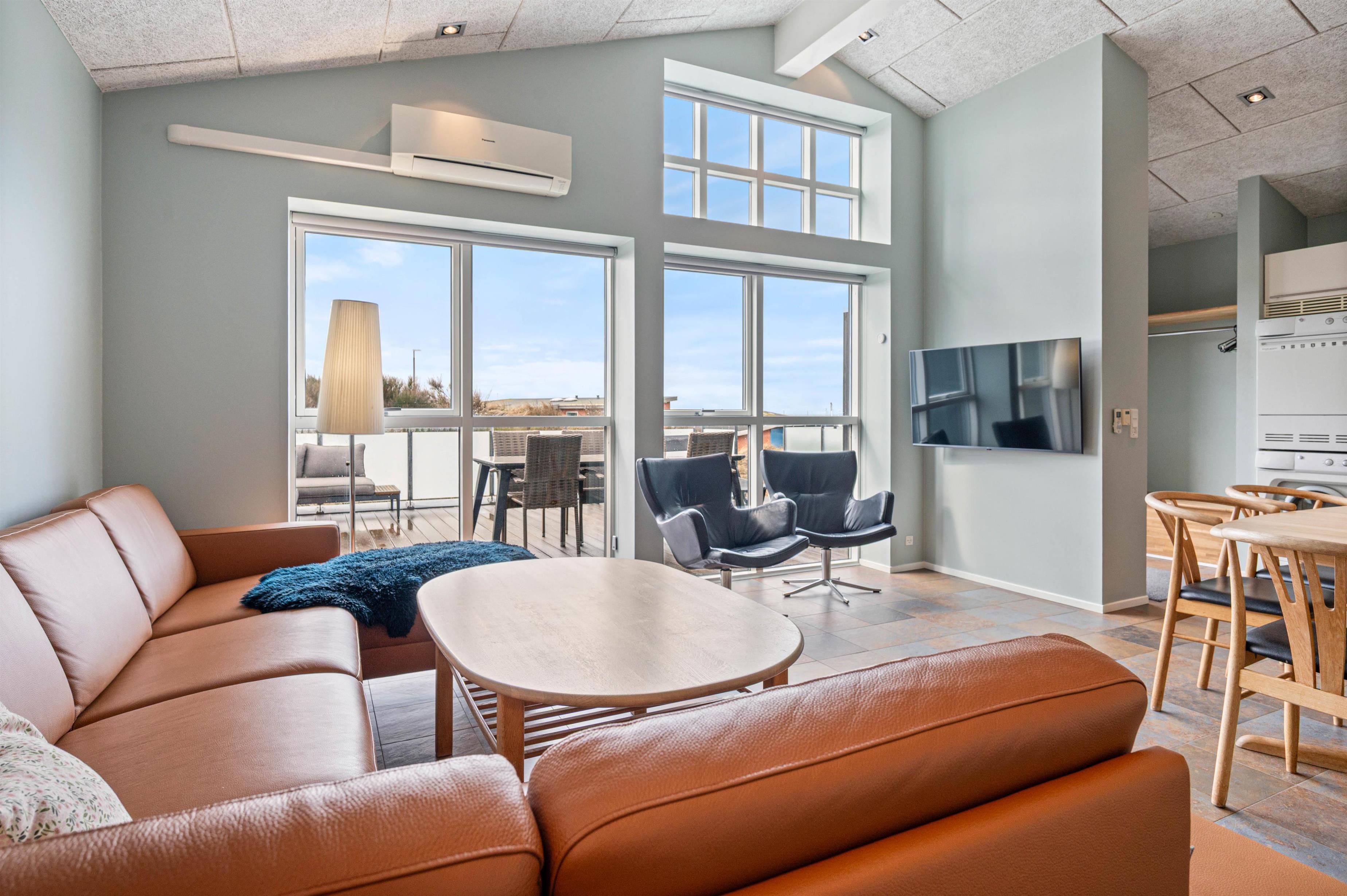 Med det samme I træder ind i denne dejlige ferielejlighed, mødes I af et lyst og rummeligt åbent opholdsrum, som rummer både køkken og stue. De store vinduespartier lukker masser af lys ind og skaber en behagelig atmosfære. En varmepumpe sikrer en dejlig temperatur i ferielejligheden året rundt.