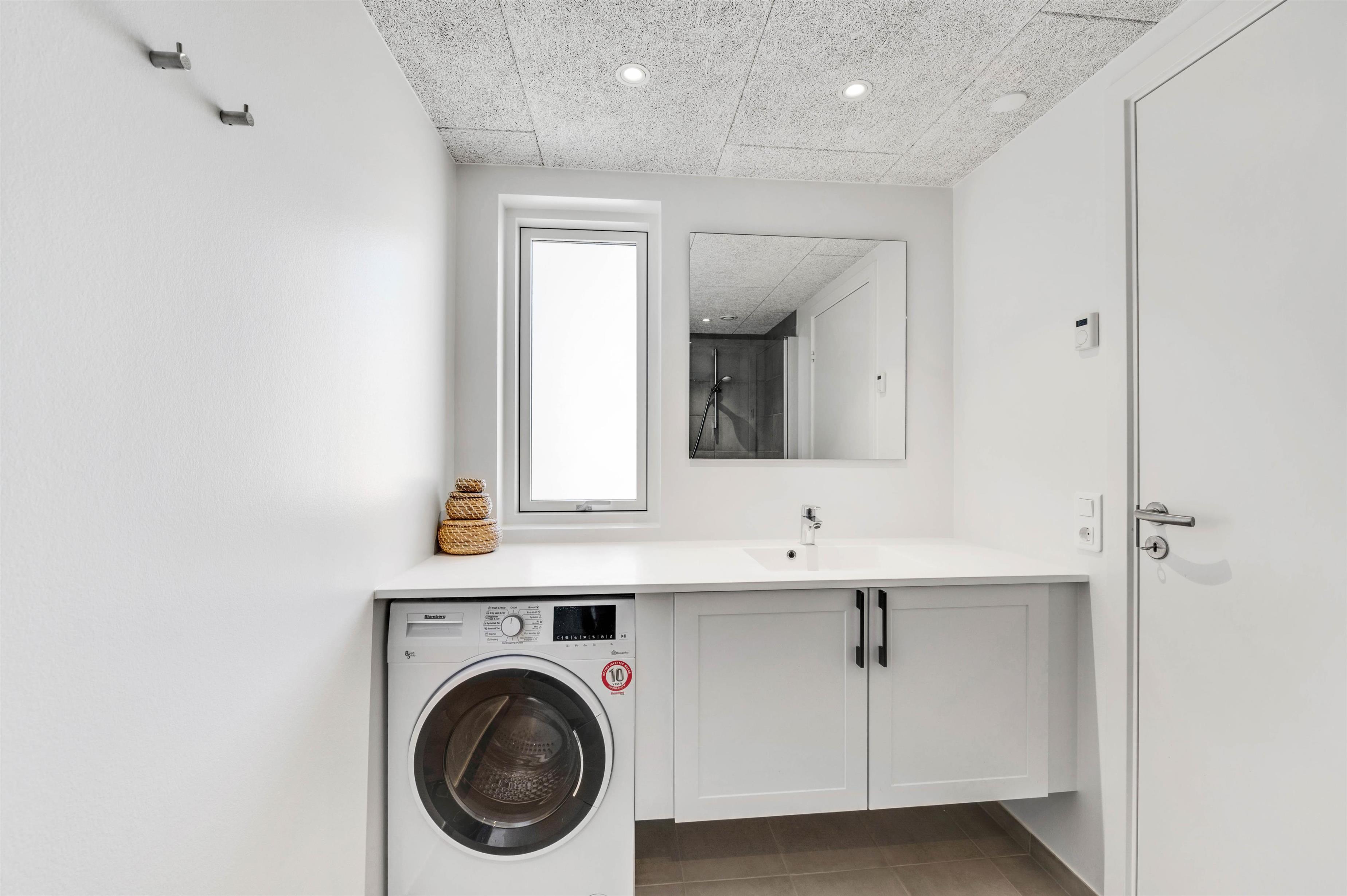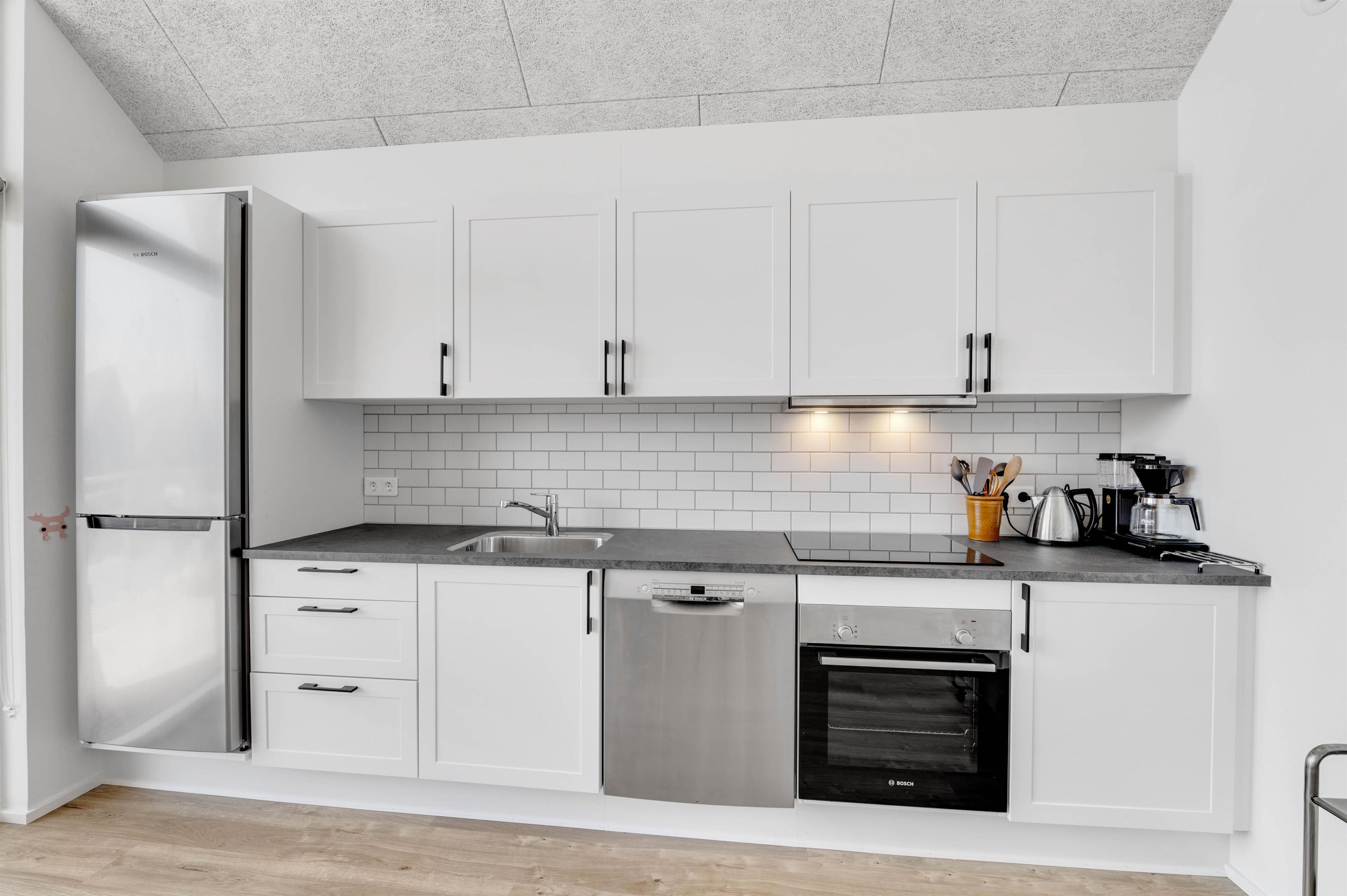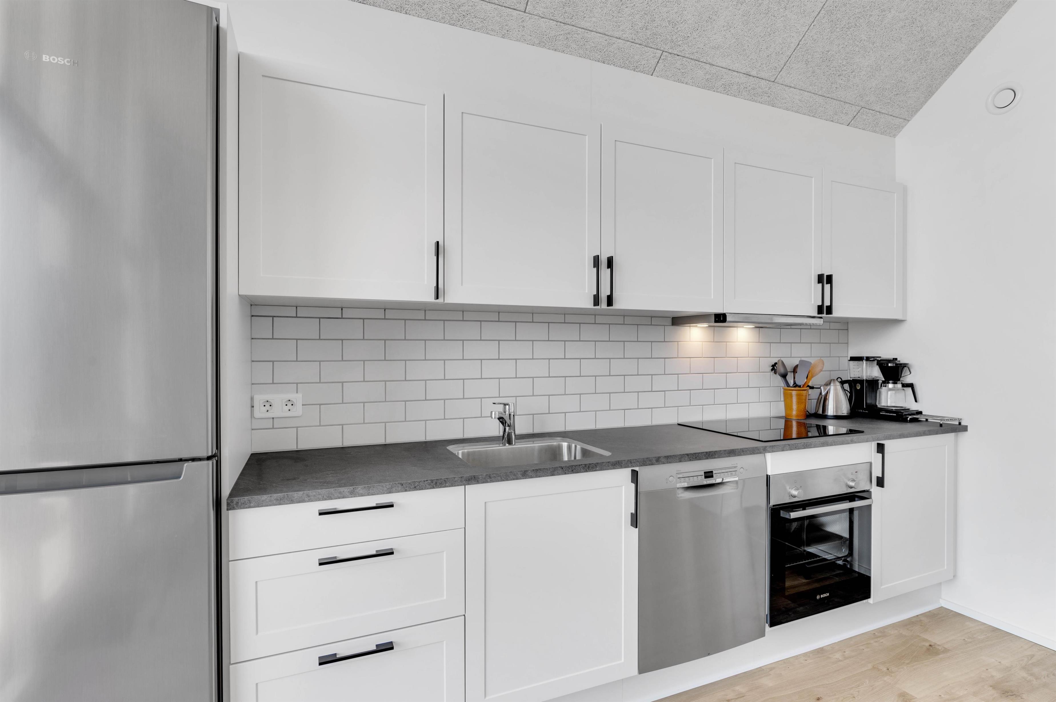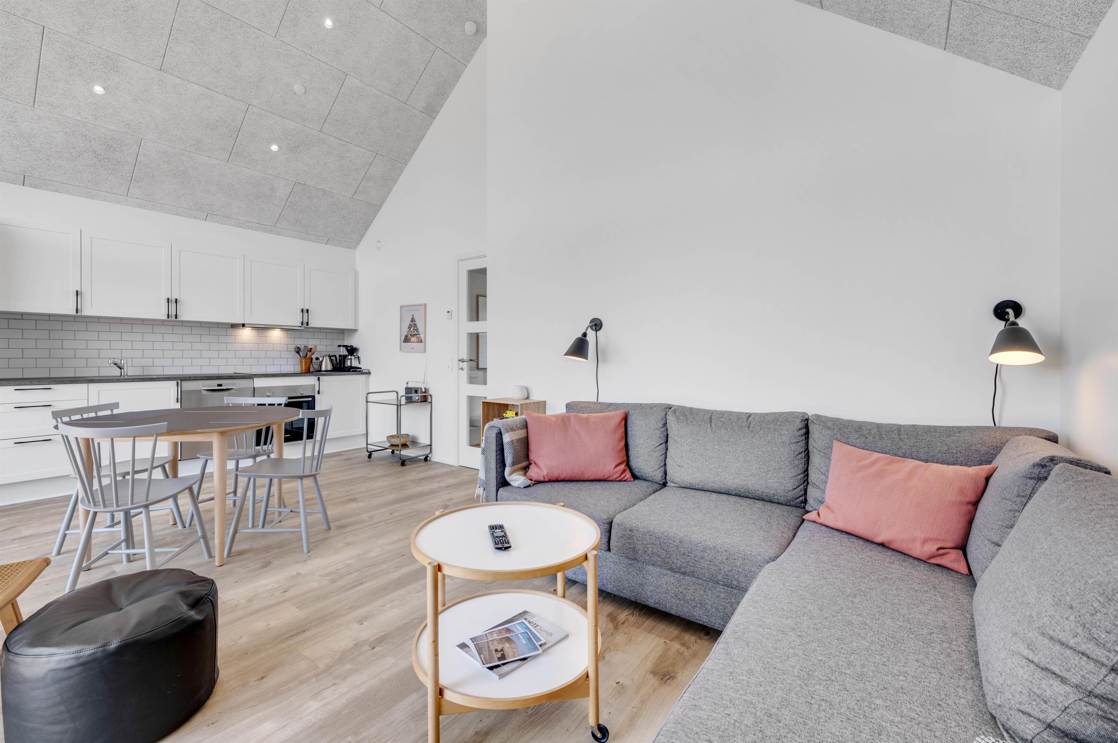 Der er også tænkt på det praktiske i indretningen. Køkkenet er udstyret med opvaskemaskine, og der er også vaskemaskine og tørretumbler i ferielejligheden – her er de huslige pligter hurtigt overstået, så I har endnu bedre tid til at nyde feriedagene og det gode selskab. Opholdsrummet med integreret køkken og soveværelset er desuden begge udstyret med gulvvarme, så I året rundt har en behagelig temperatur i hele lejligheden.