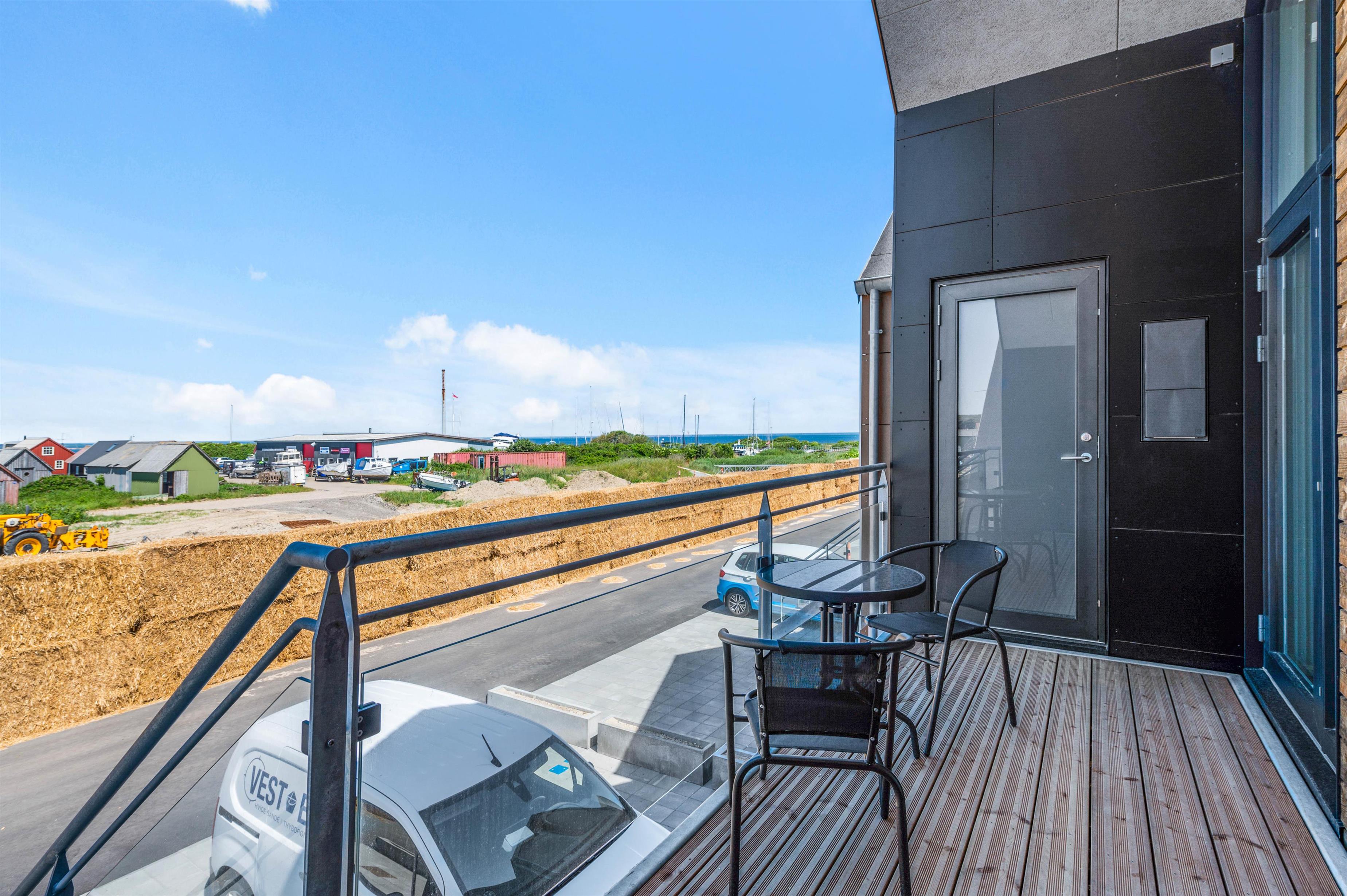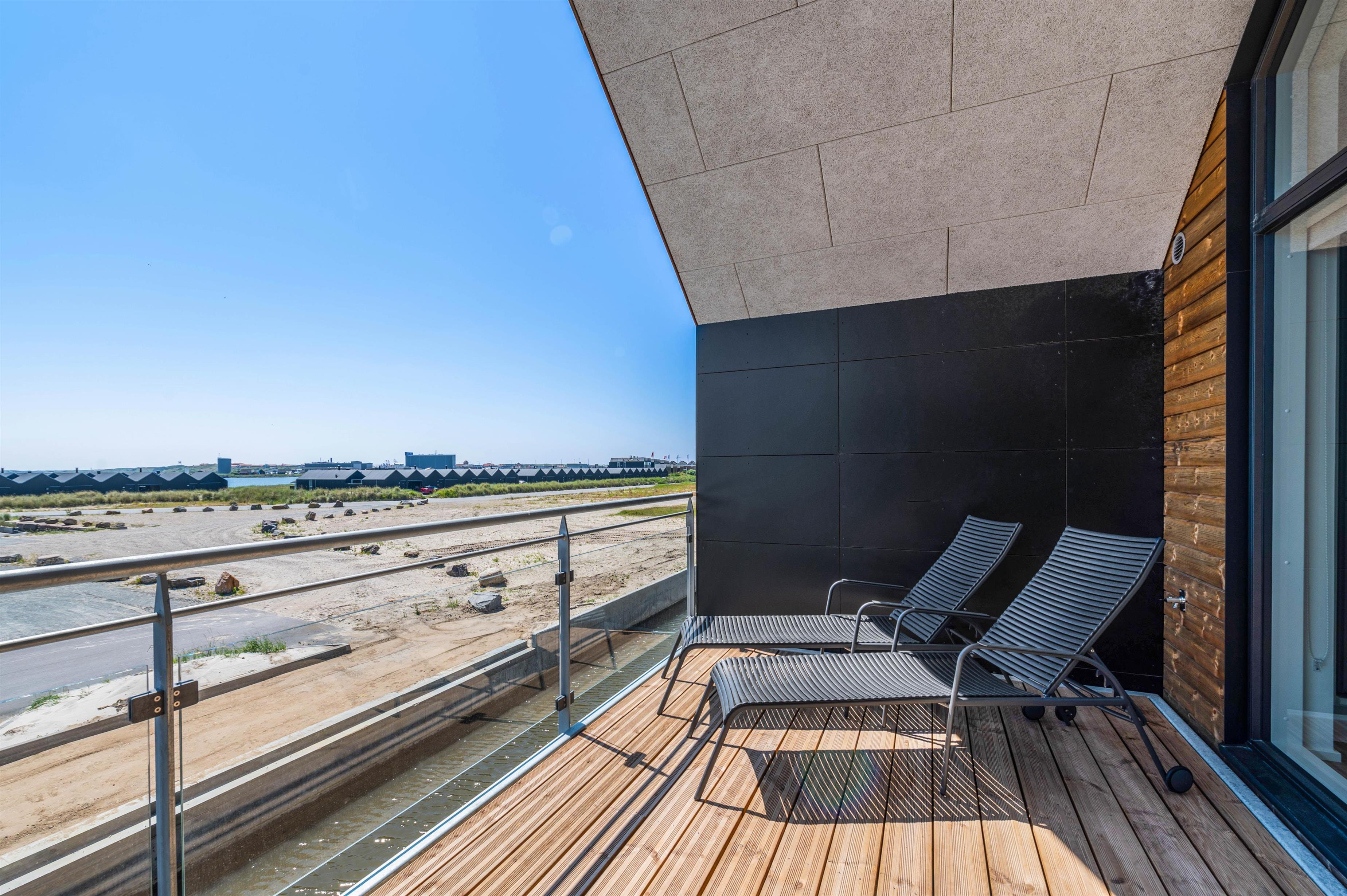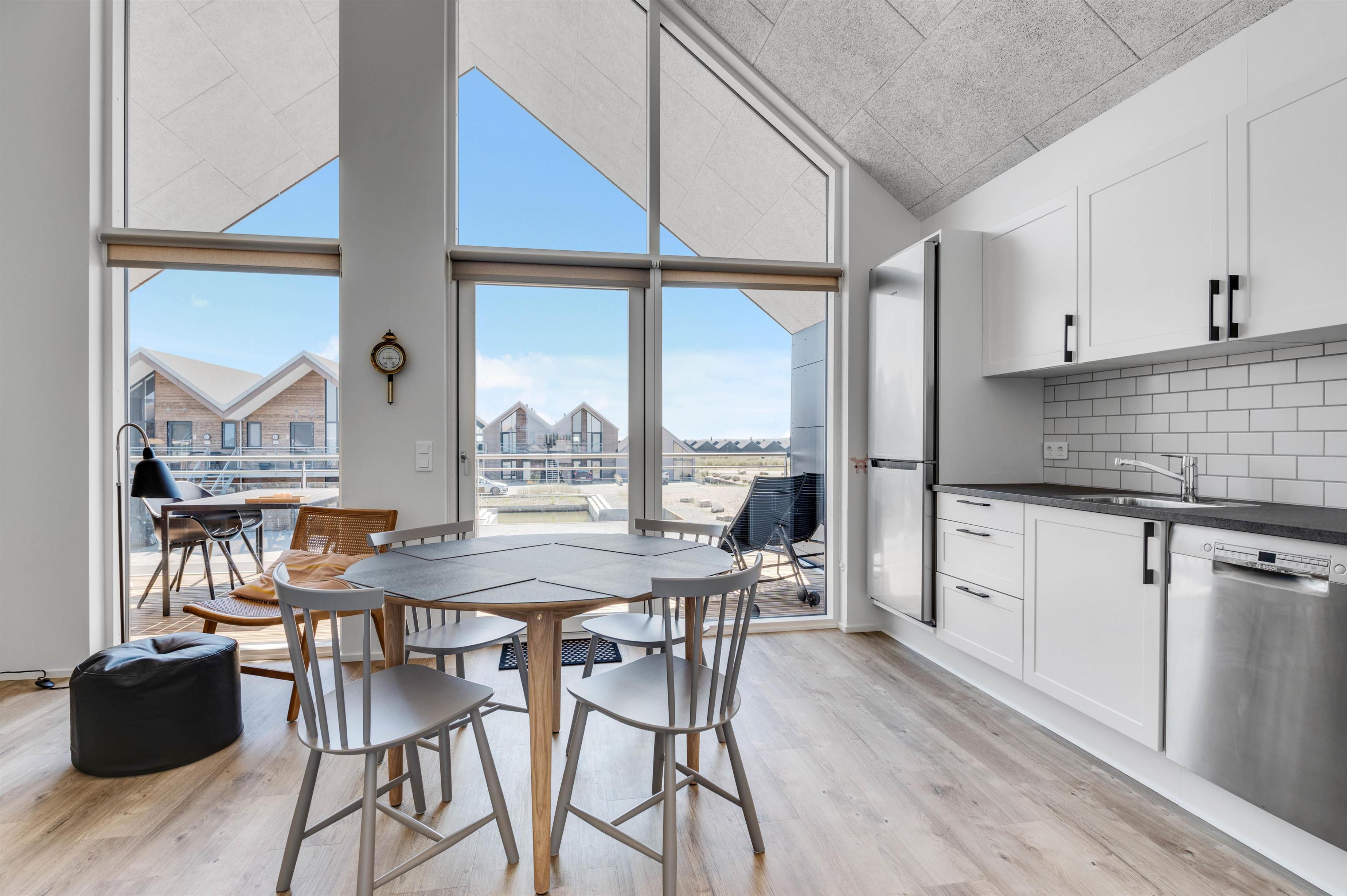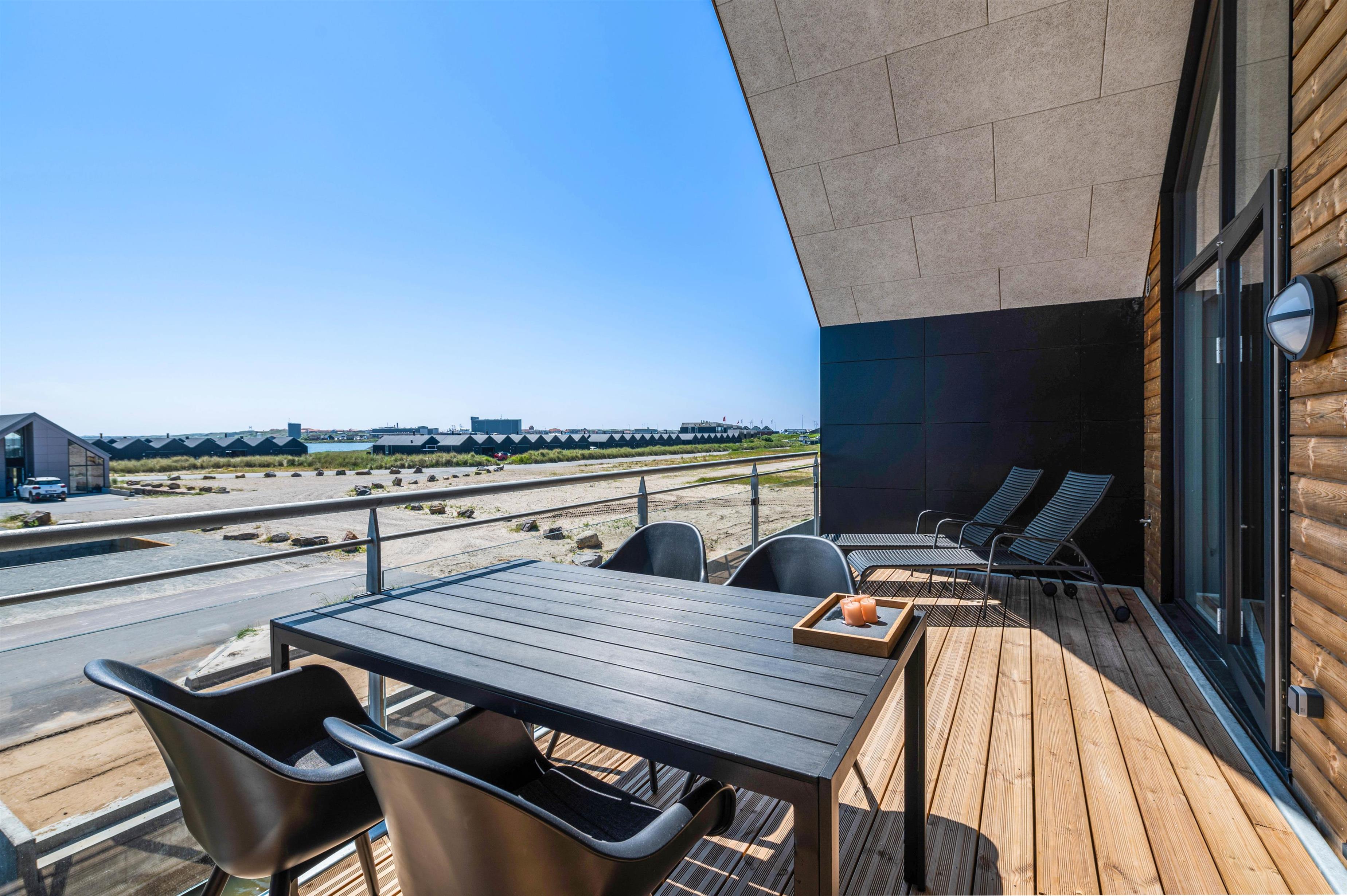 Ferielejligheden har i det hele taget en dejlig beliggenhed i Hvide Sandes nyeste ferieområde, ”Langsand Langs Vand”. Den lille kanal-ferieby kombinerer moderne feriebebyggelse med det hyggelige liv langs vandet, og I kommer til at bo få minutters gang fra Ringkøbing Fjord og den autentiske fjordhavn, Tyskerhavnen, hvor små joller hver dag sejler ind og ud af havnen. Ringkøbing Fjord kan ses fra begge terrasser ved lejligheden.