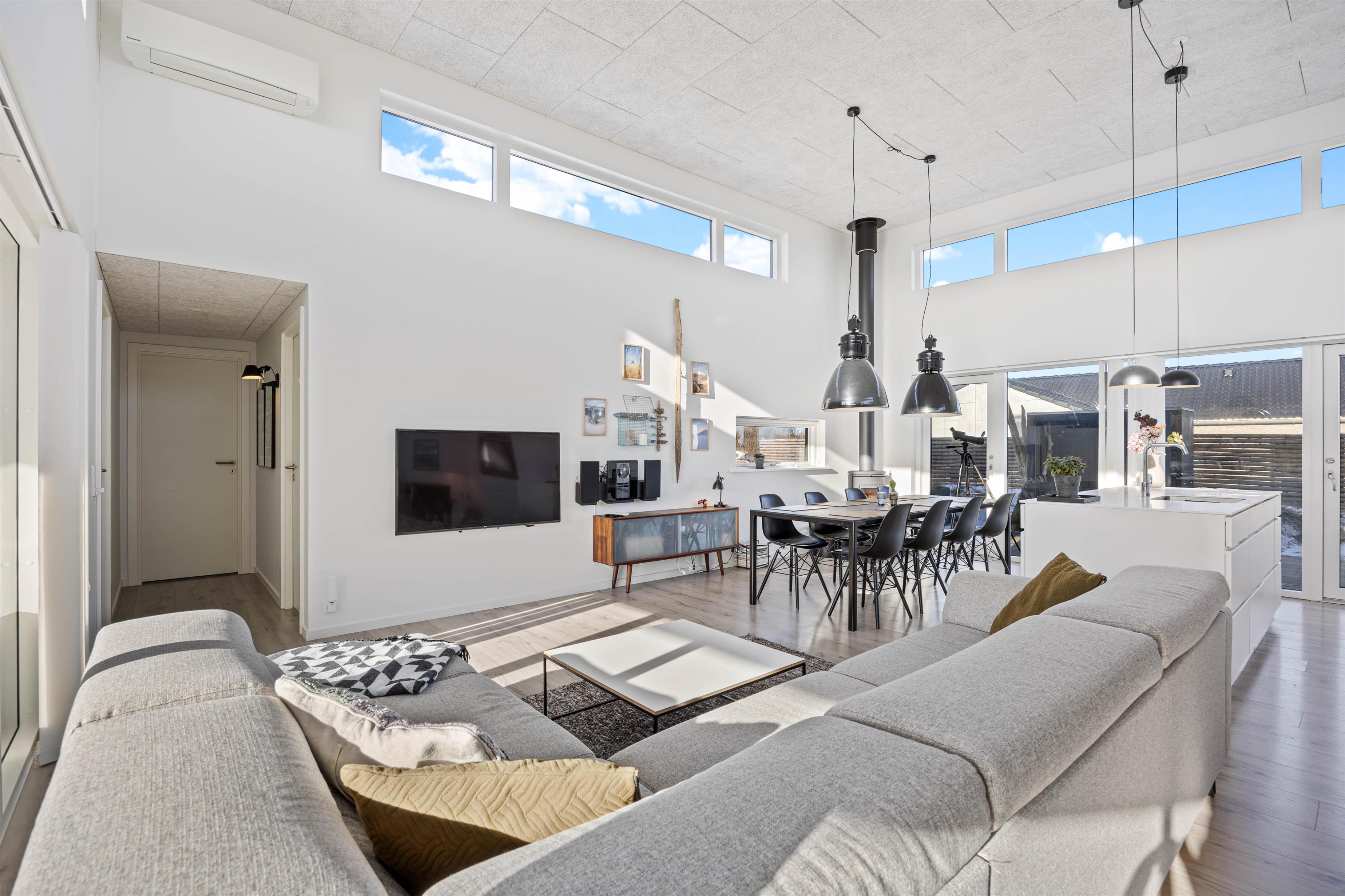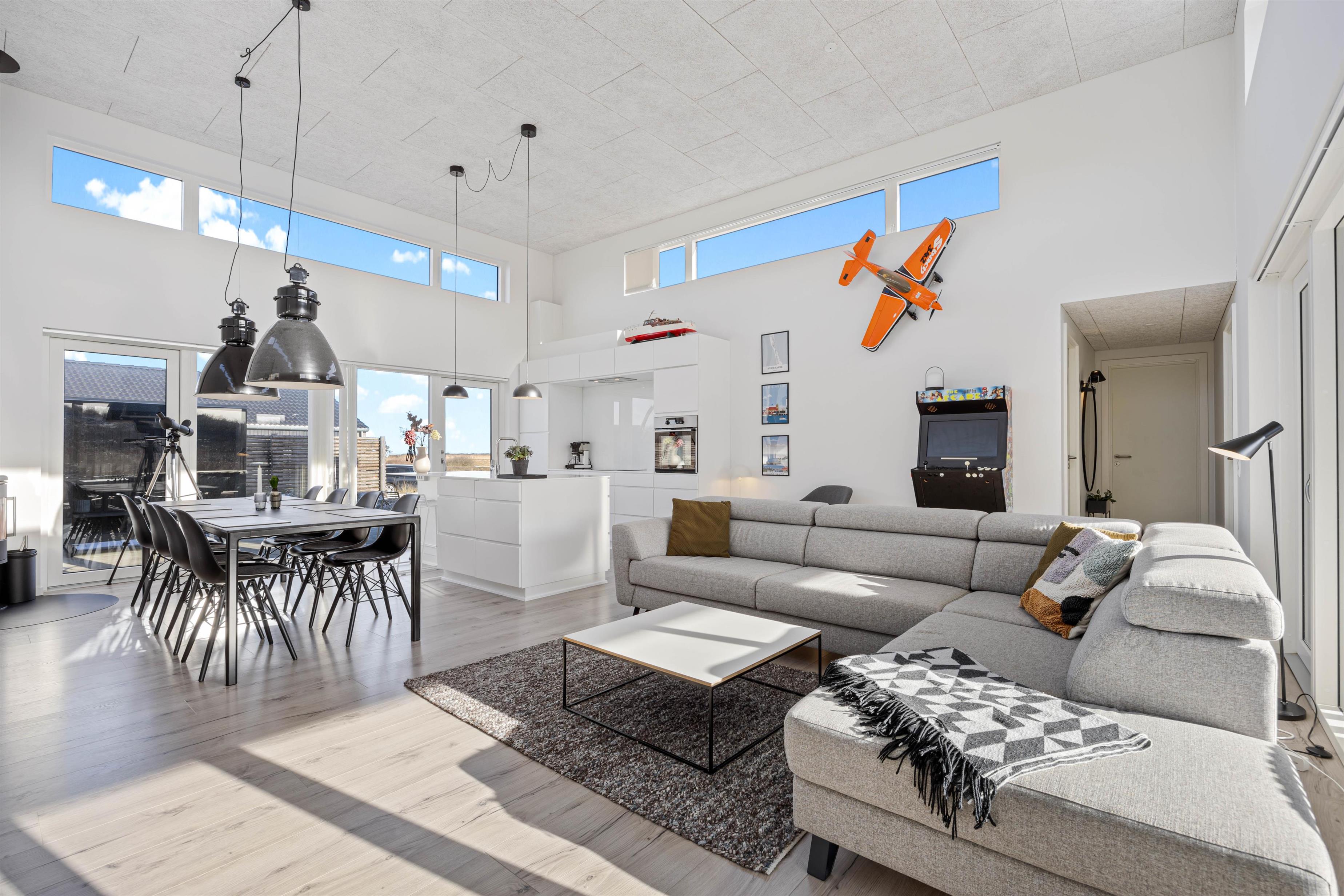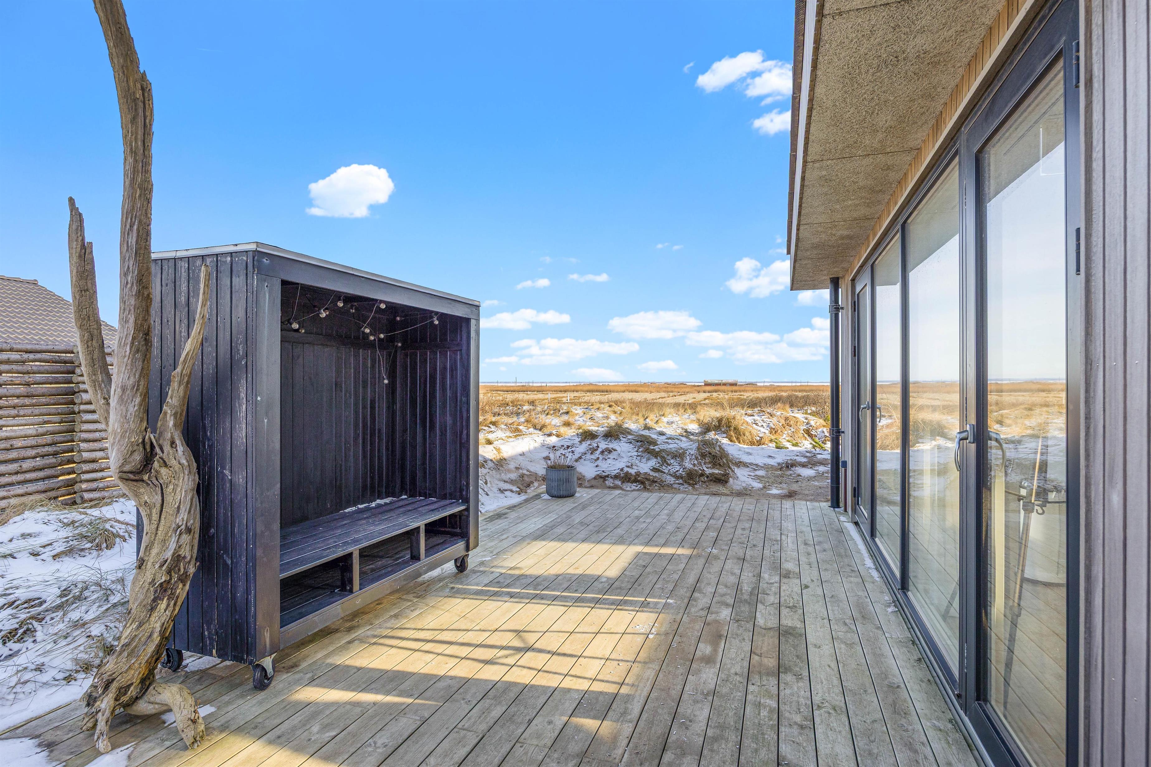 Udenfor venter en skøn terrasse, hvor I kan nyde solen og den friske havluft. Sommerhusets terrasse er både åben, afskærmet og delvist overdækket, så I altid kan finde et godt sted at opholde jer – uanset vind og vejr. Havemøbler og grill står klar til hyggelige måltider under åben himmel.