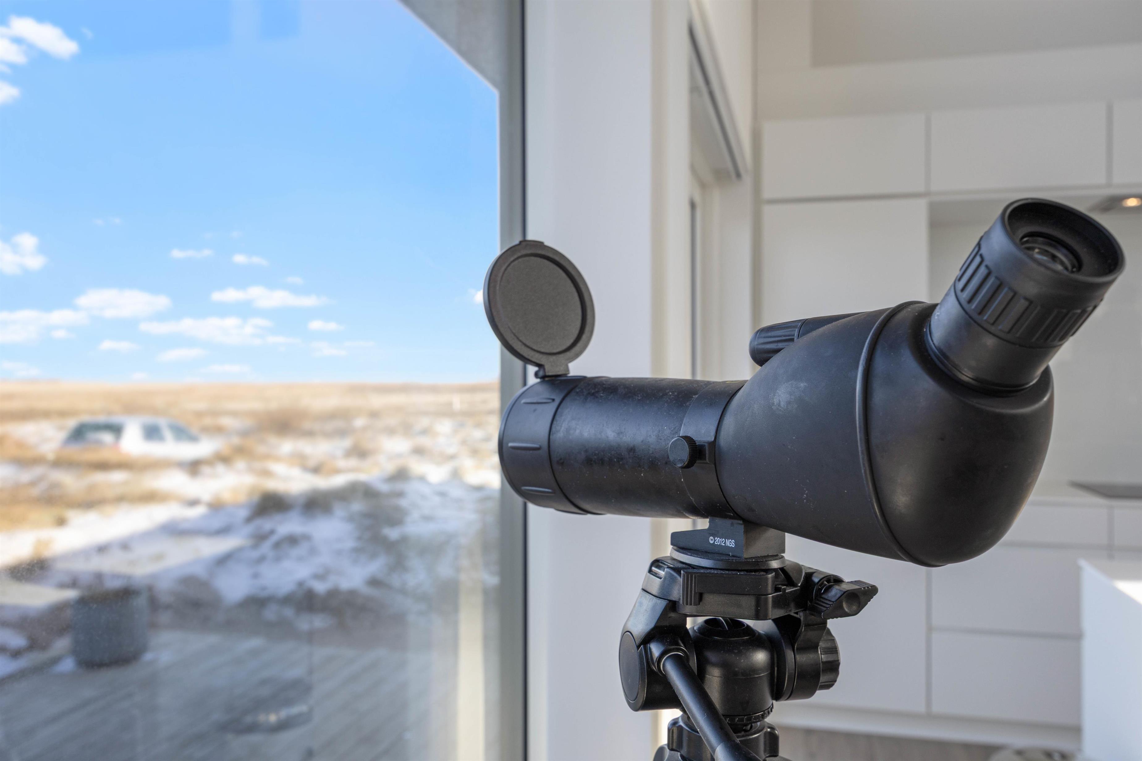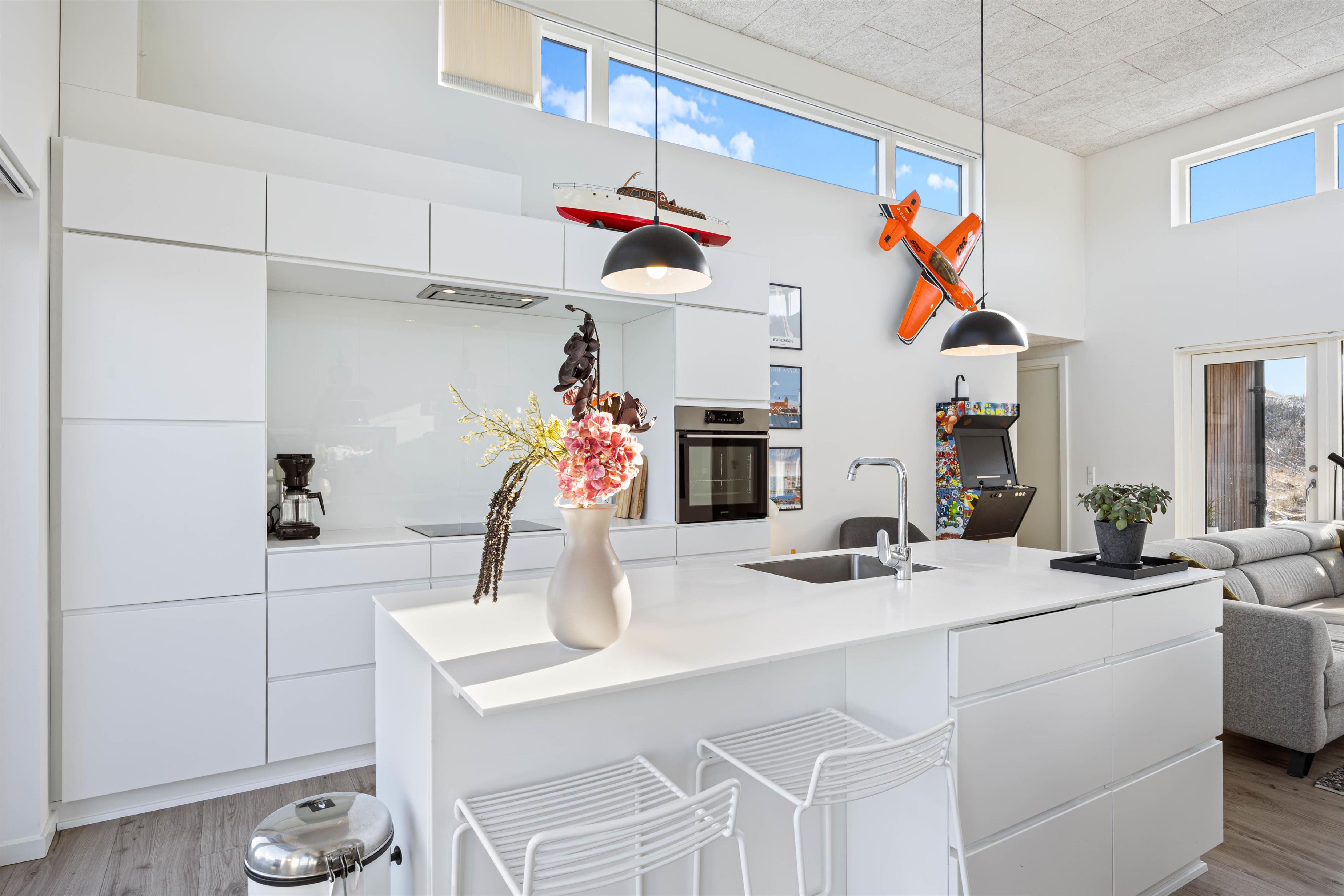 Sommerhuset er bygget i 2019 byder på en flot træfacade og en moderne og åben indretning med store vinduespartier, der lader dagslyset strømme ind og giver en smuk panoramaudsigt til landskabet. Stue og køkken ligger i åben forbindelse, så I kan nyde samværet, uanset om der laves mad eller slappes af i sofaen foran brændeovnen. Brændeovnen skaber en hyggelig stemning, især på kølige dage. Udover brændeovnen finder I en varmepumpe i sommerhuset, som sikrer et behageligt indeklima året rundt. Køkkenet er godt indrettet, og herfra er man med i hyggen og samtalen, mens man rører i gryderne.