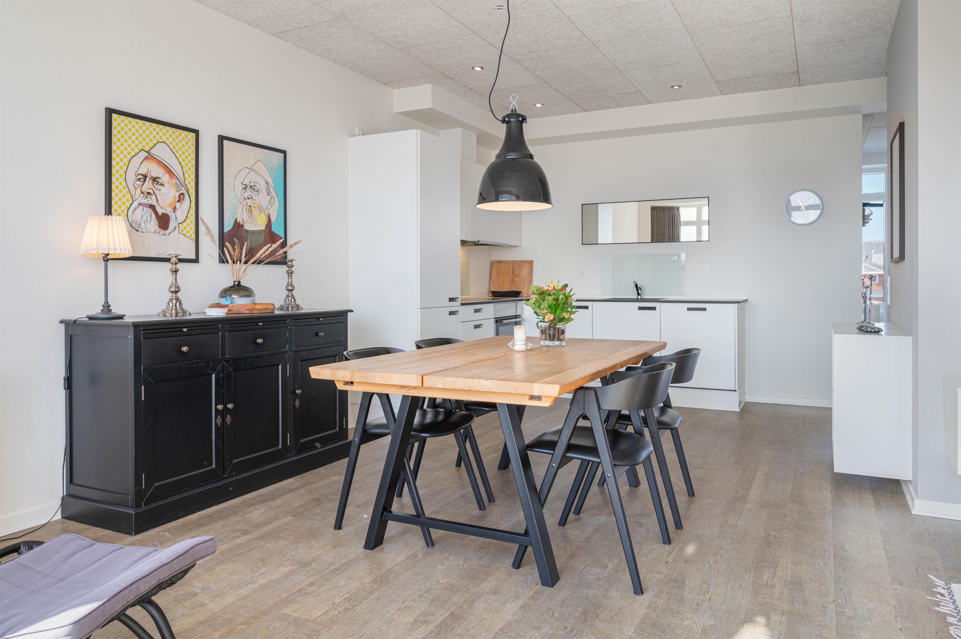 Fra den flotte stue er der udgang til den østvendte terrasse, som giver jer en fantastisk udsigt ud over den charmerende fjordhavn, som har en helt speciel atmosfære med de små fiskekuttere, der lægger til ved kajen. Der er også en lille vestvendt terrasse ved indgangen, så I kan følge solen rundt hele dagen.