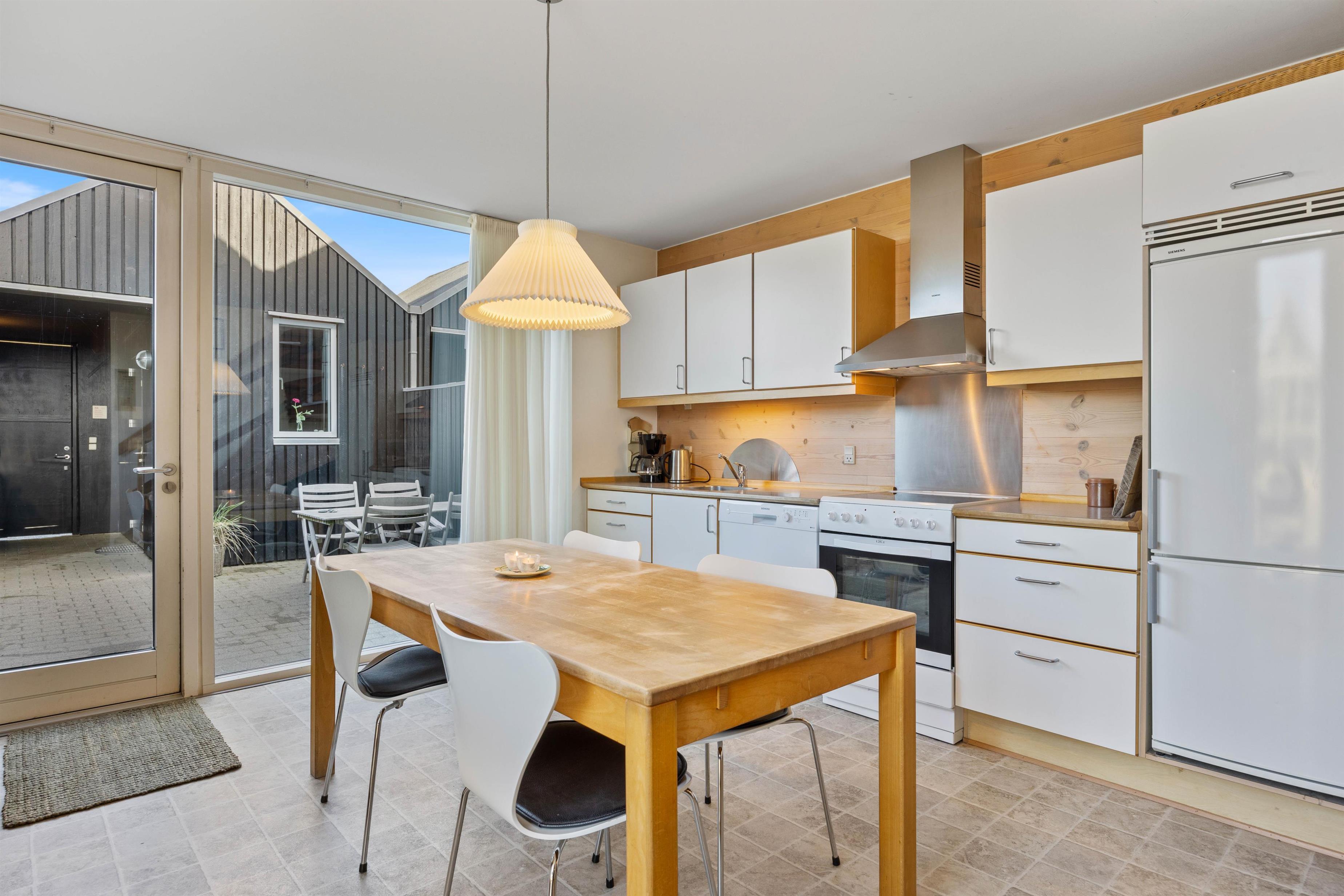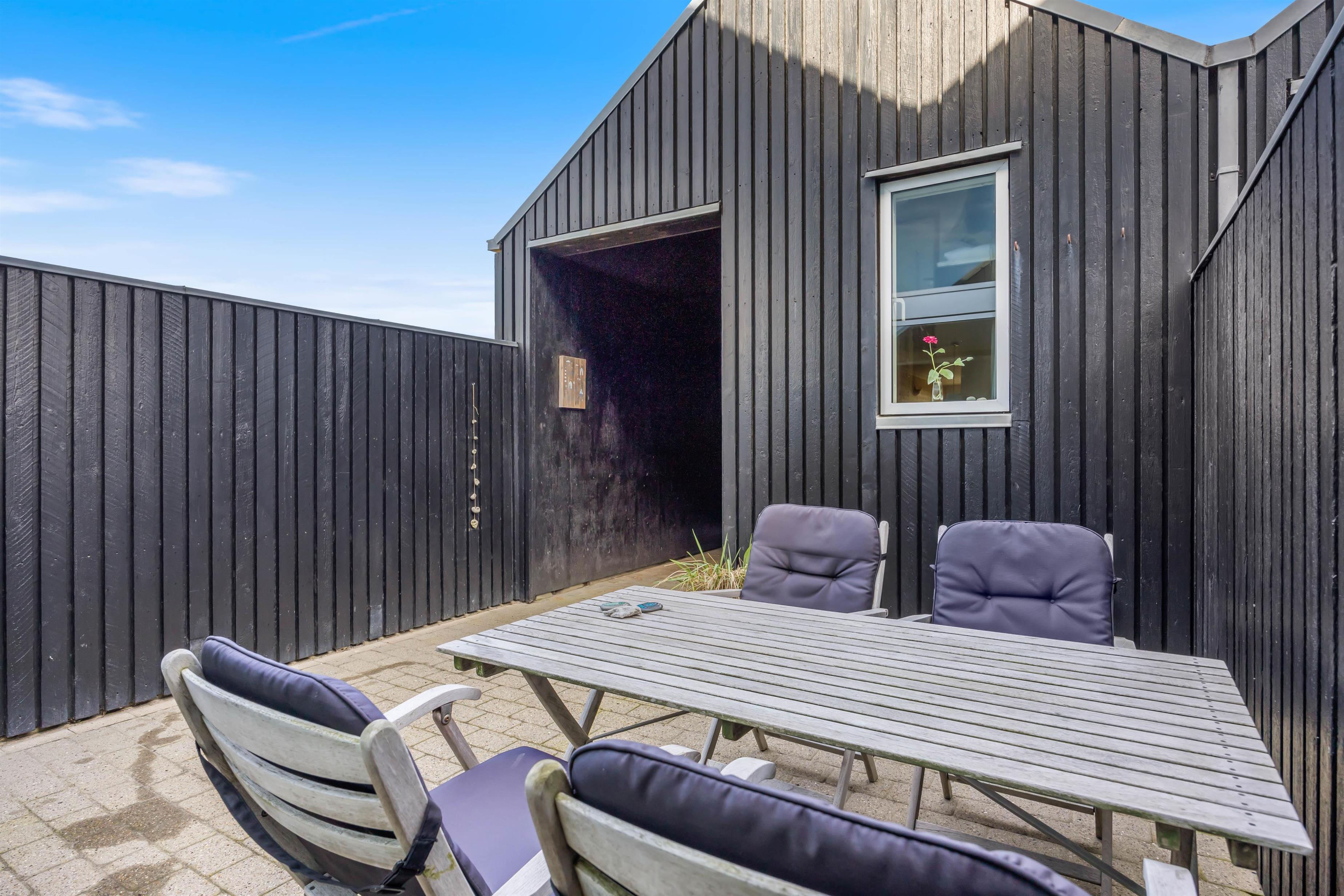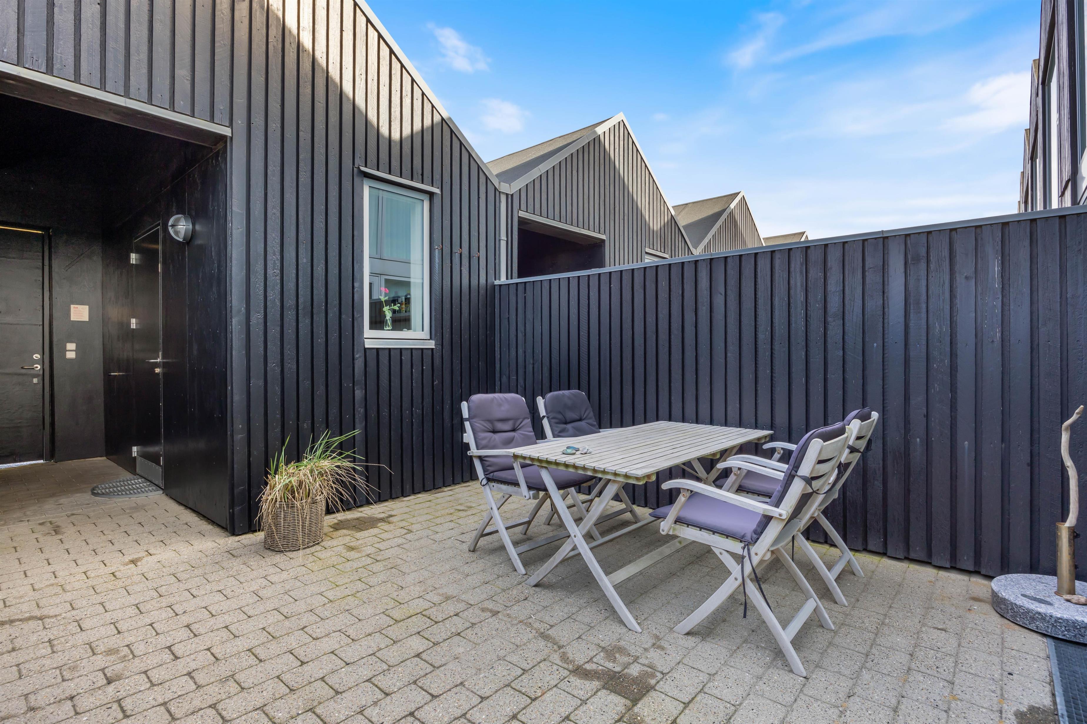 På den anden side af ferielejligheden mellem den tilhørende garage og redskabsrum, har I en dejlig lukket terrasse, hvor du kan nyde de hyggelige grillaftener. Her kan I tilberede de lækreste måltider og nyde dem med en god vin – måske I selv har fanget fiskene på molen, der ikke ligger langt fra derfra?