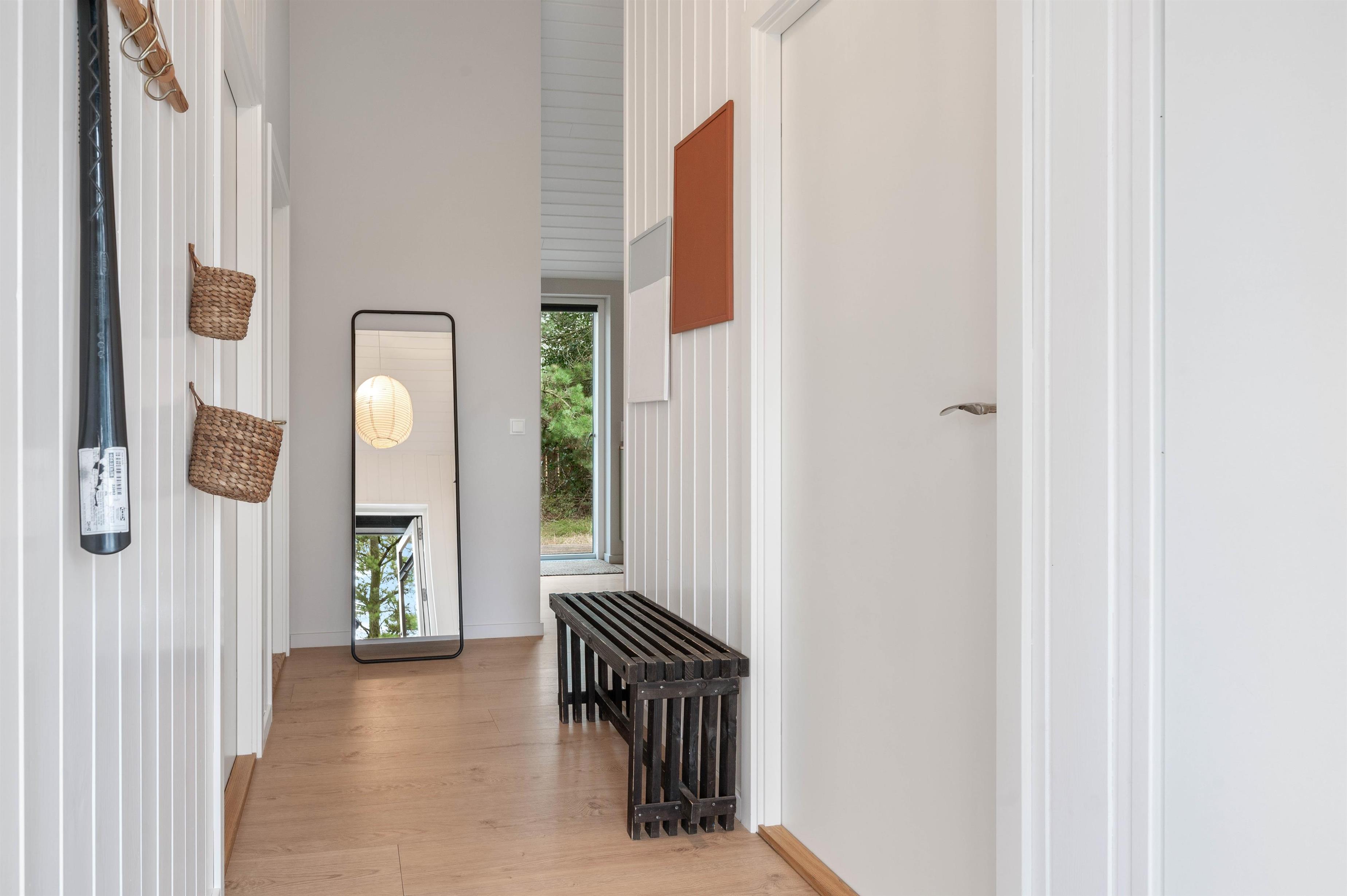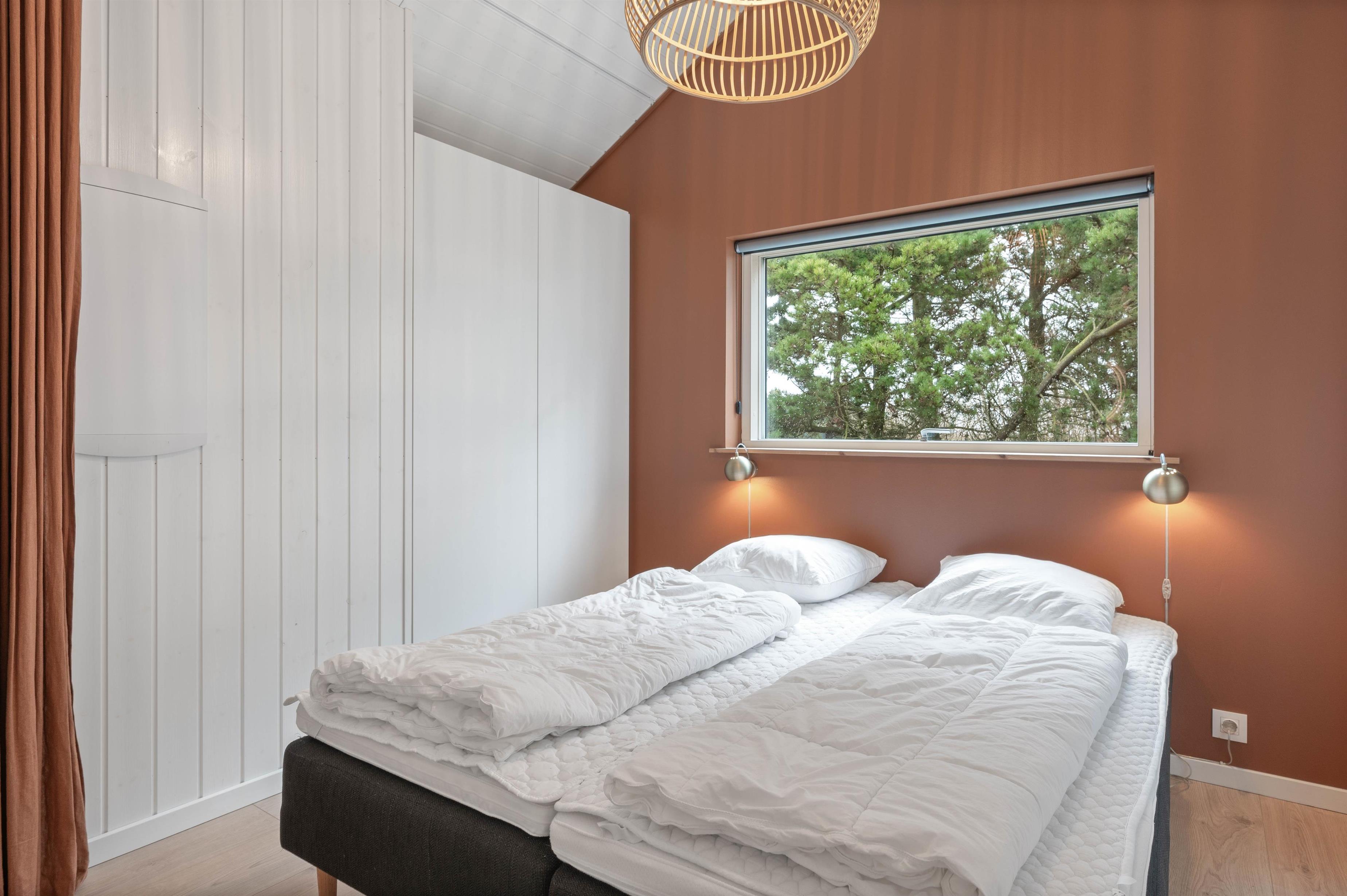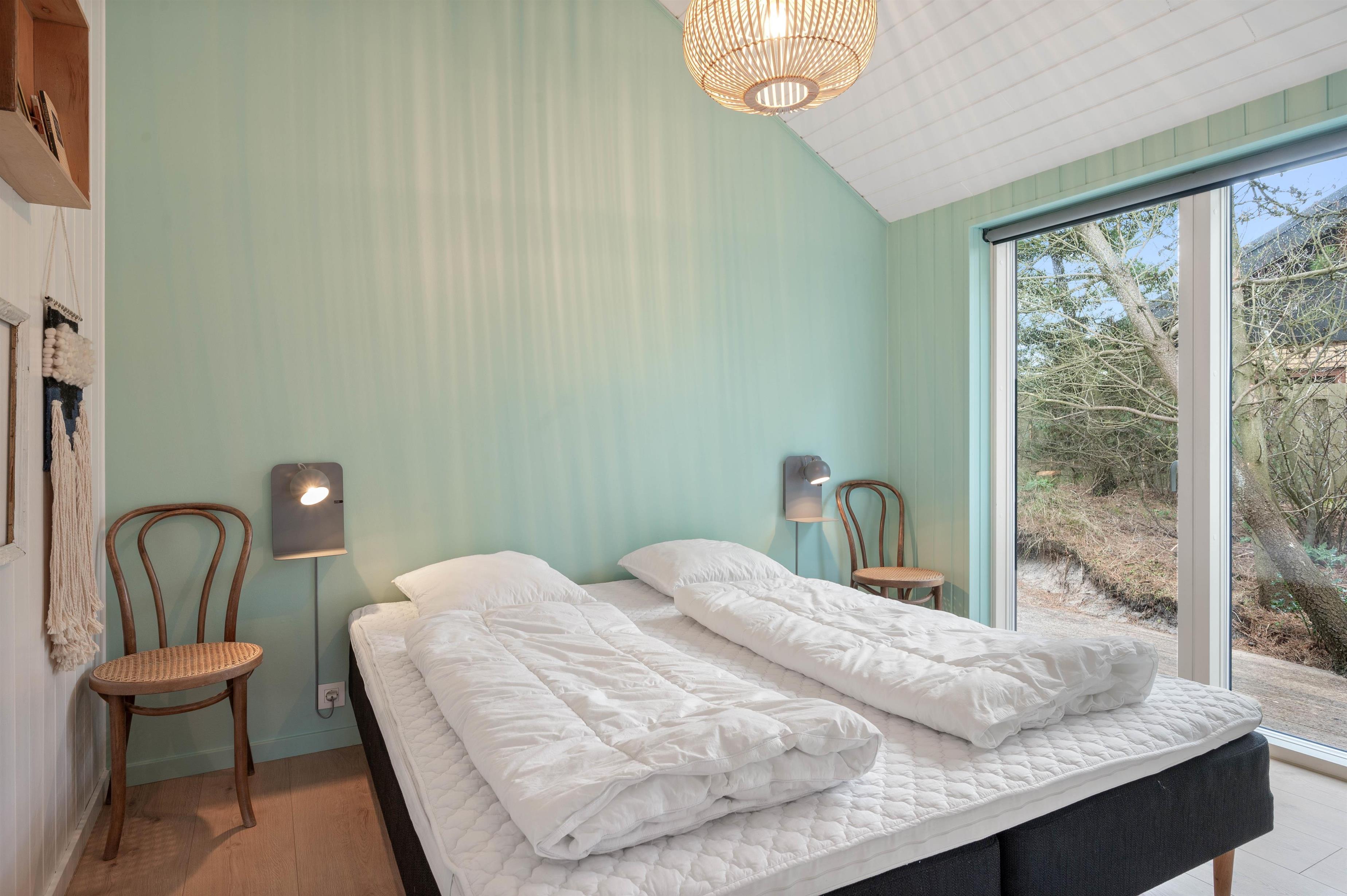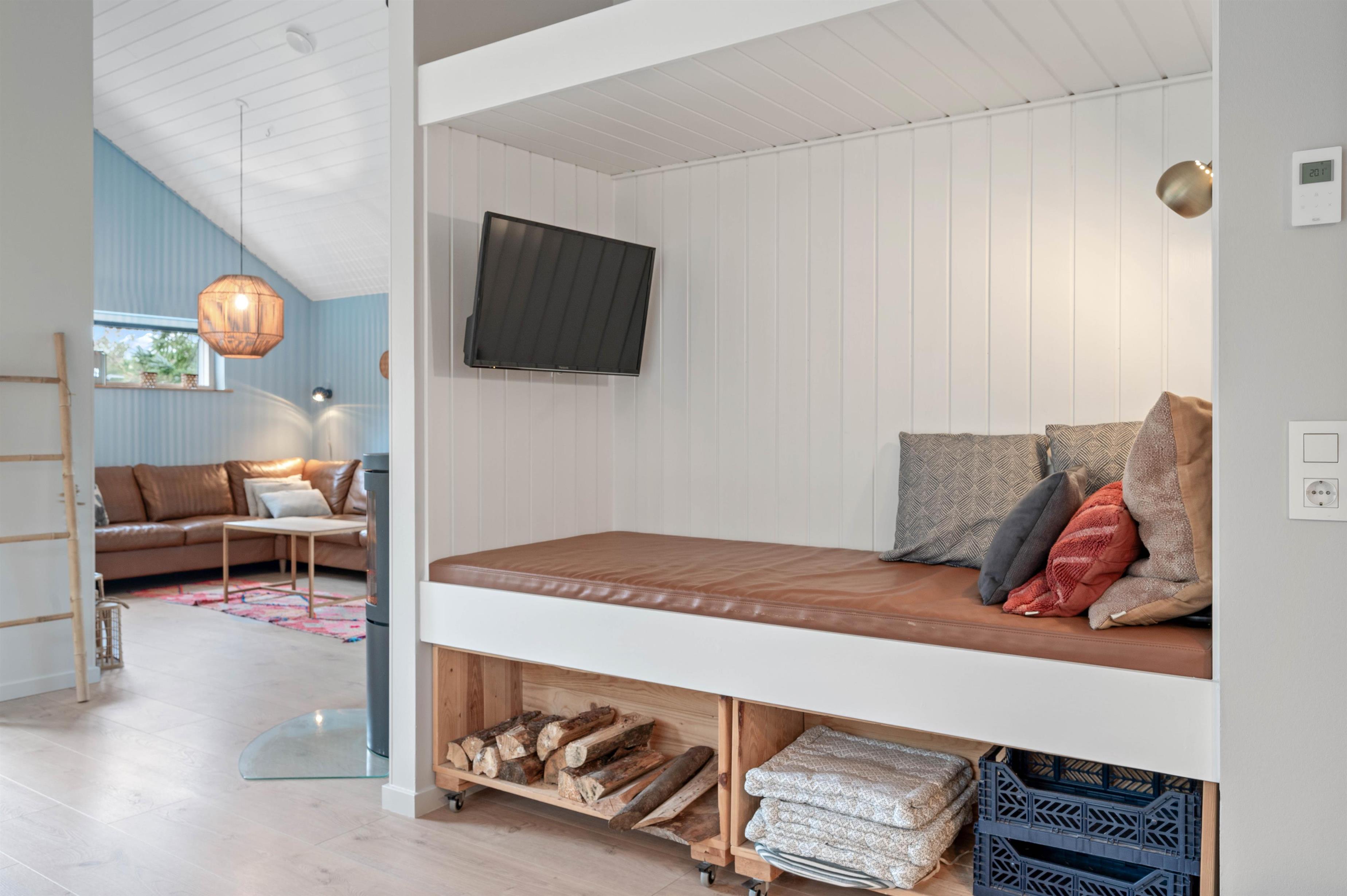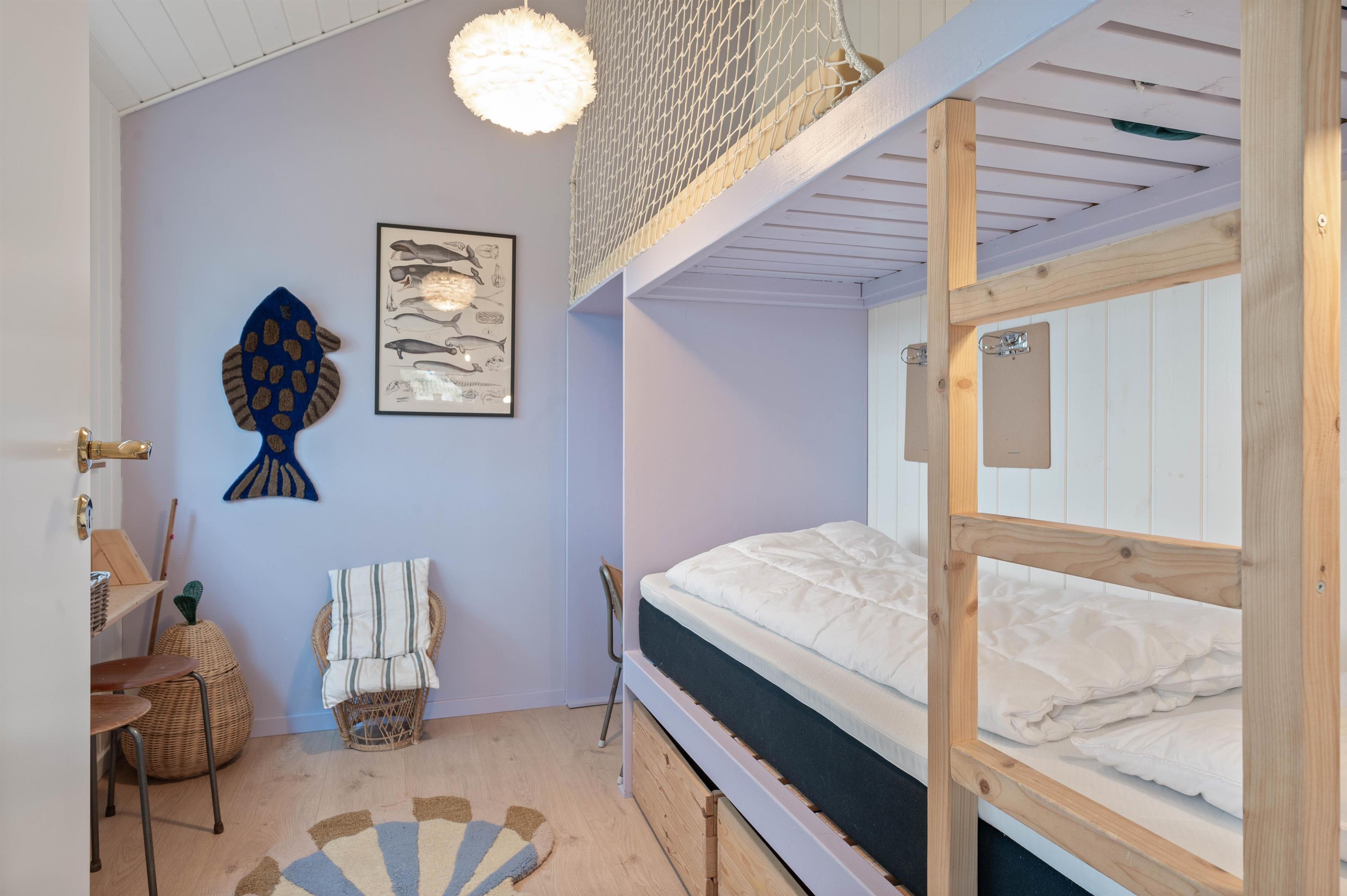 De 5 sovepladser er fordelt i 3 værelser, heraf er de 2 med dobbeltseng. Det tredje værelse er indrettet som et skønt børneværelse – bl.a. med en køjeseng, som giver muligheder for masser af hule-byggeri, samt et skrivebords-hjørne, hvor der kan slappes af med at tegne – eller skrive dagbog fra ferien i det vestjyske.